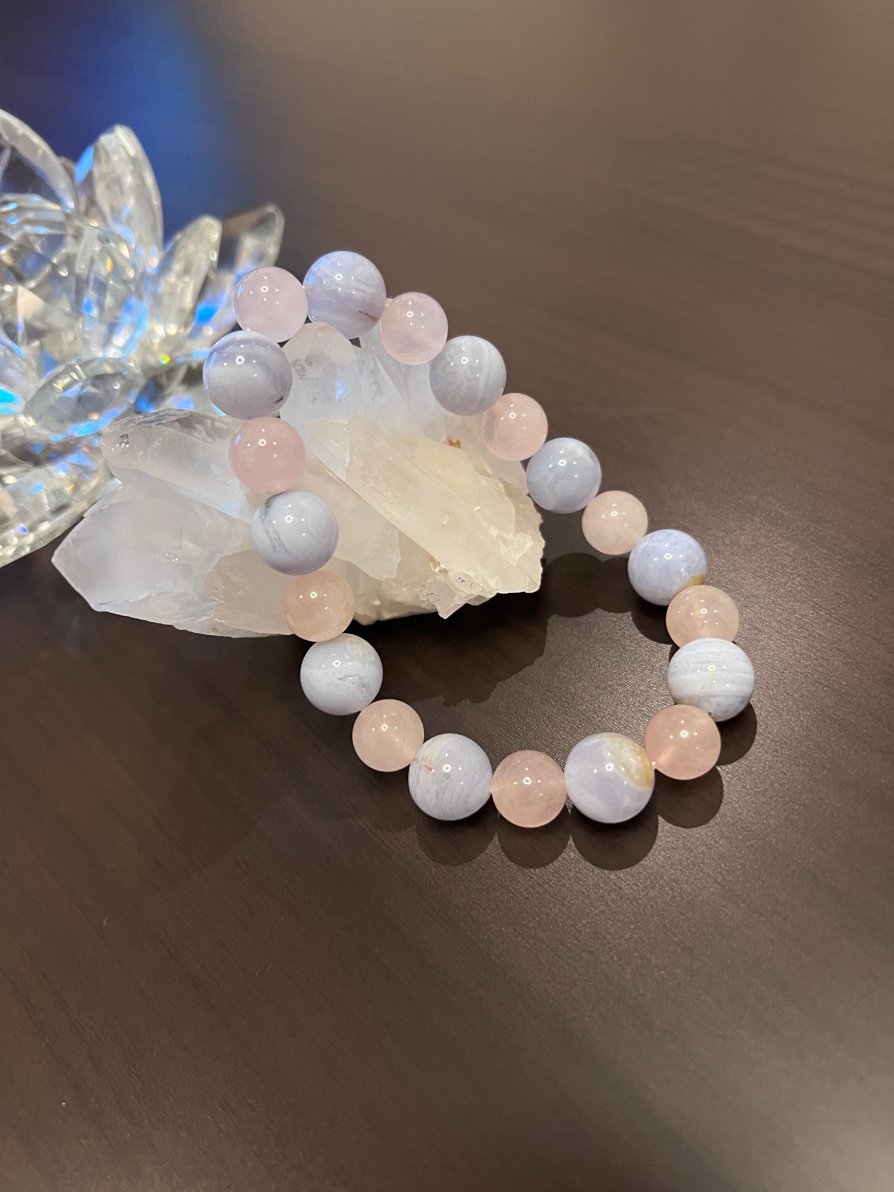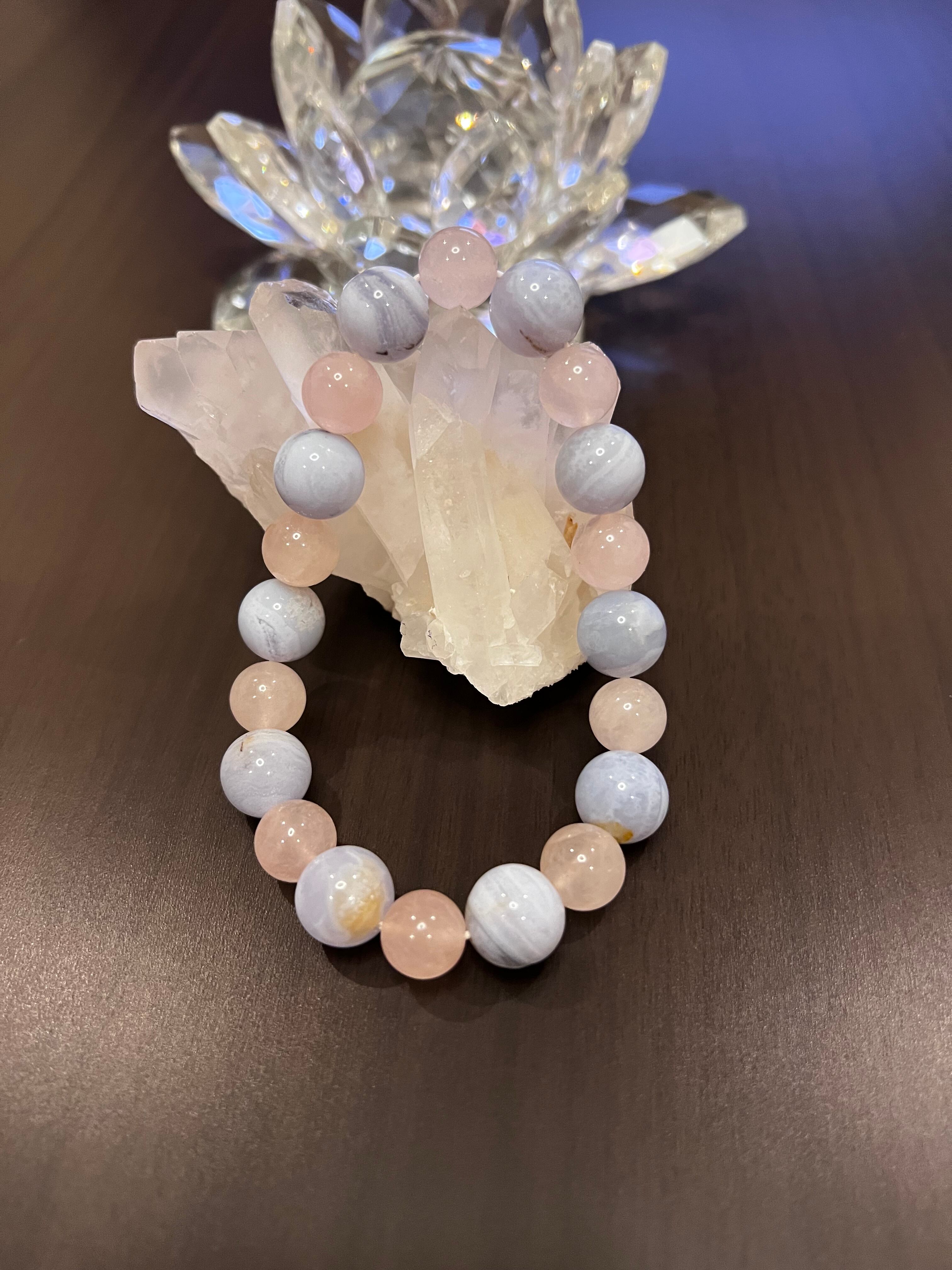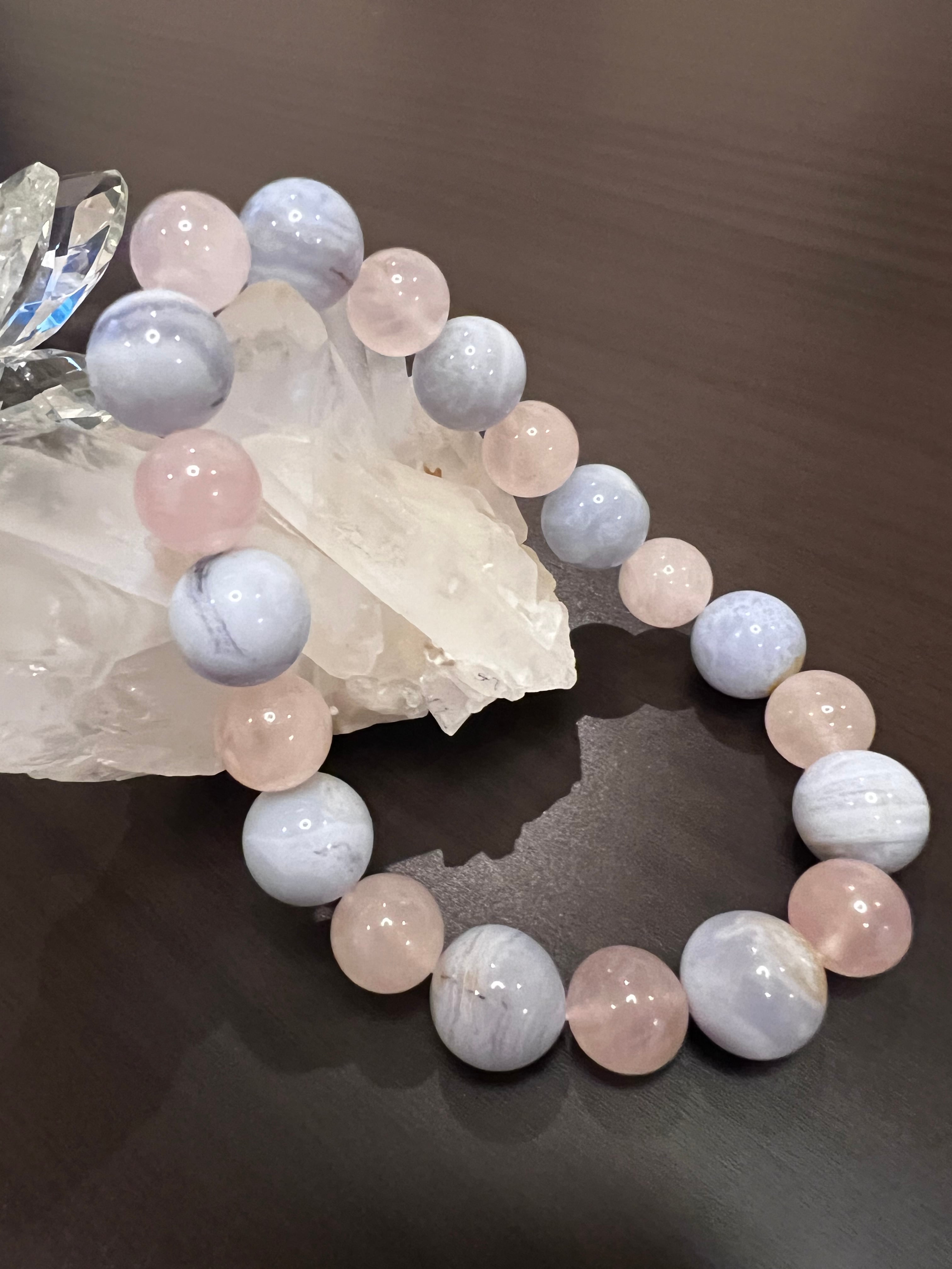 このブレスレットは、心を落ち着け、人とのつながりを大切にしたい方にぴったりです!ブルーレースアゲート、ローズクォーツ、20面カット水晶が織り成す美しいデザインが、あなたの日常に愛と安らぎのエネルギーをもたらしてくれるでしょう。