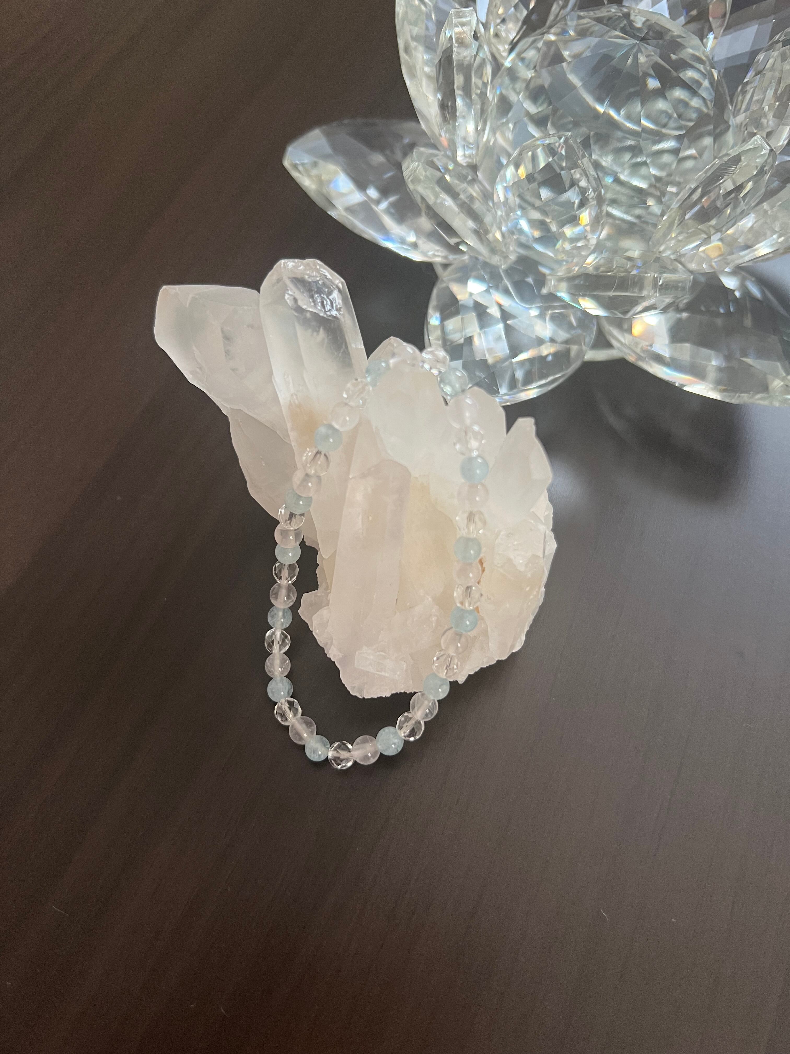 ⚫︎カット水晶:エネルギーの浄化と強化を担う万能の石で、持つ人にポジティブな波動を引き寄せ、集中力を高める力を持っています。クリアな意識を促進し、内面のバランスを整えます。 このブレスレットは、心の安定を求める方や愛に満ちた日常を送りたい方にぴったりです!アクアマリン、ローズクォーツ、カット水晶が織り成す美しいデザインが、あなたの日常に平穏と愛をもたらしてくれることでしょう。