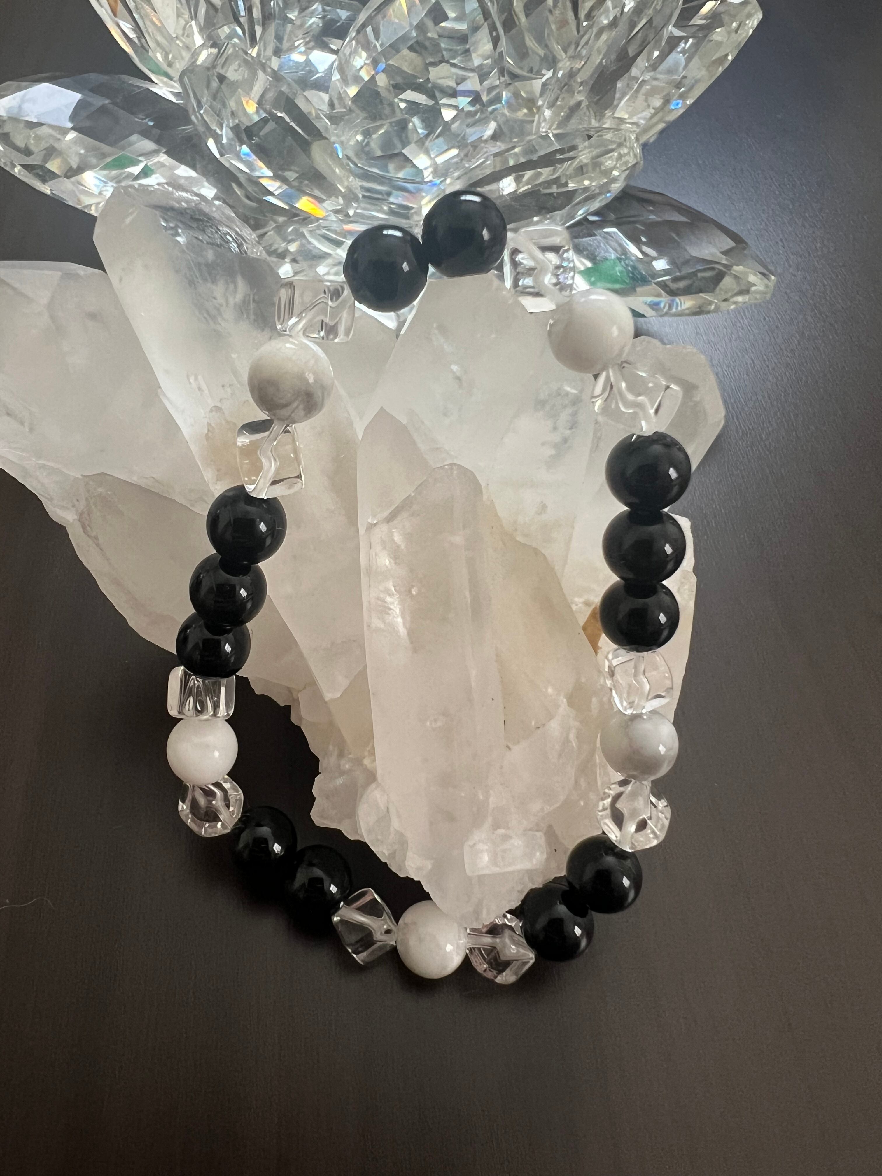 オニキス、ハウライト、キューブカット水晶が組み合わさったデザインが、あなたの日常に心の安定と力強さをもたらしてくれることでしょう。