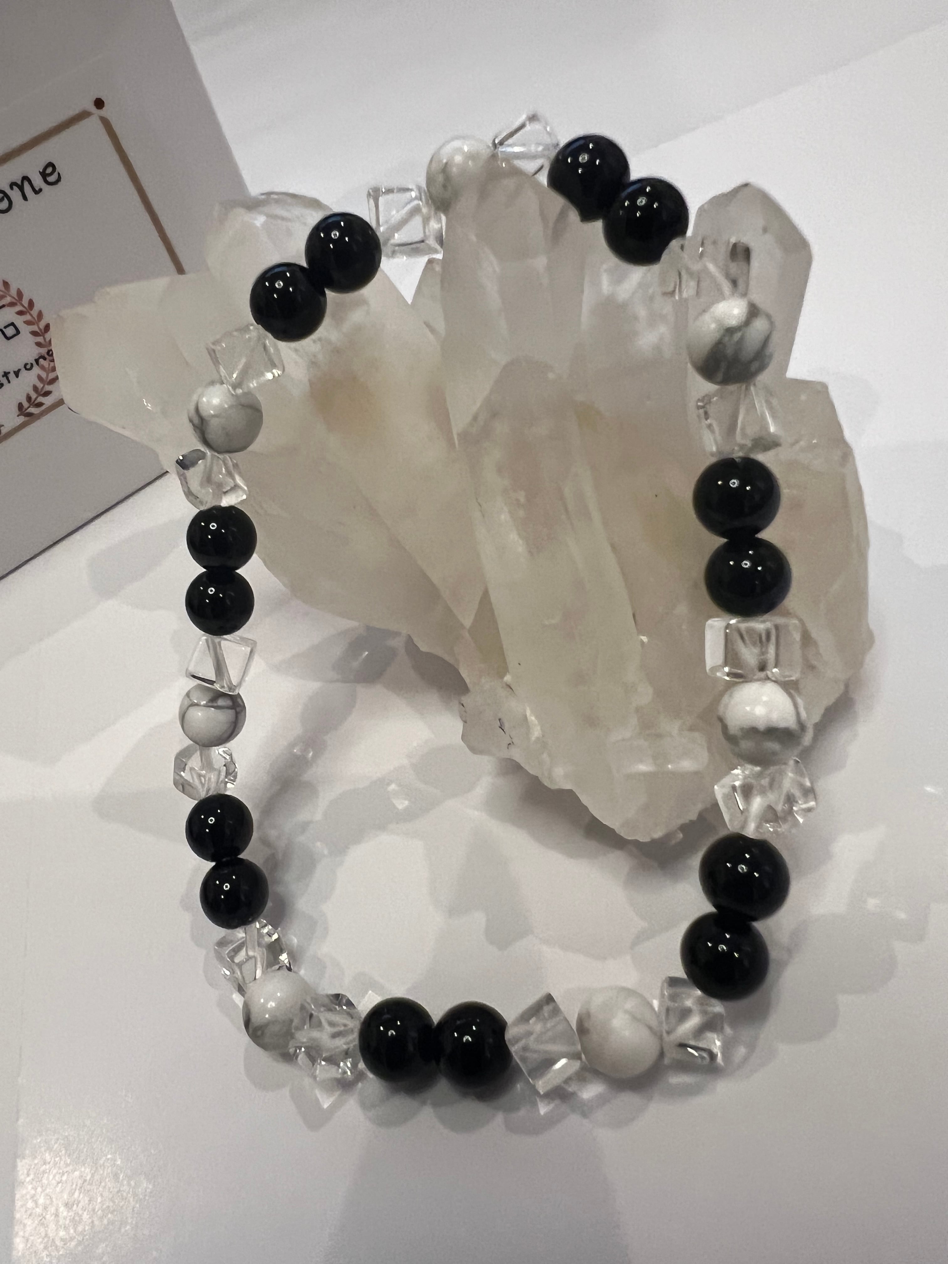 オニキス、ハウライト、キューブカット水晶の美しい組み合わせが、あなたの日常に力強さと穏やかなエネルギーをもたらすことでしょう。