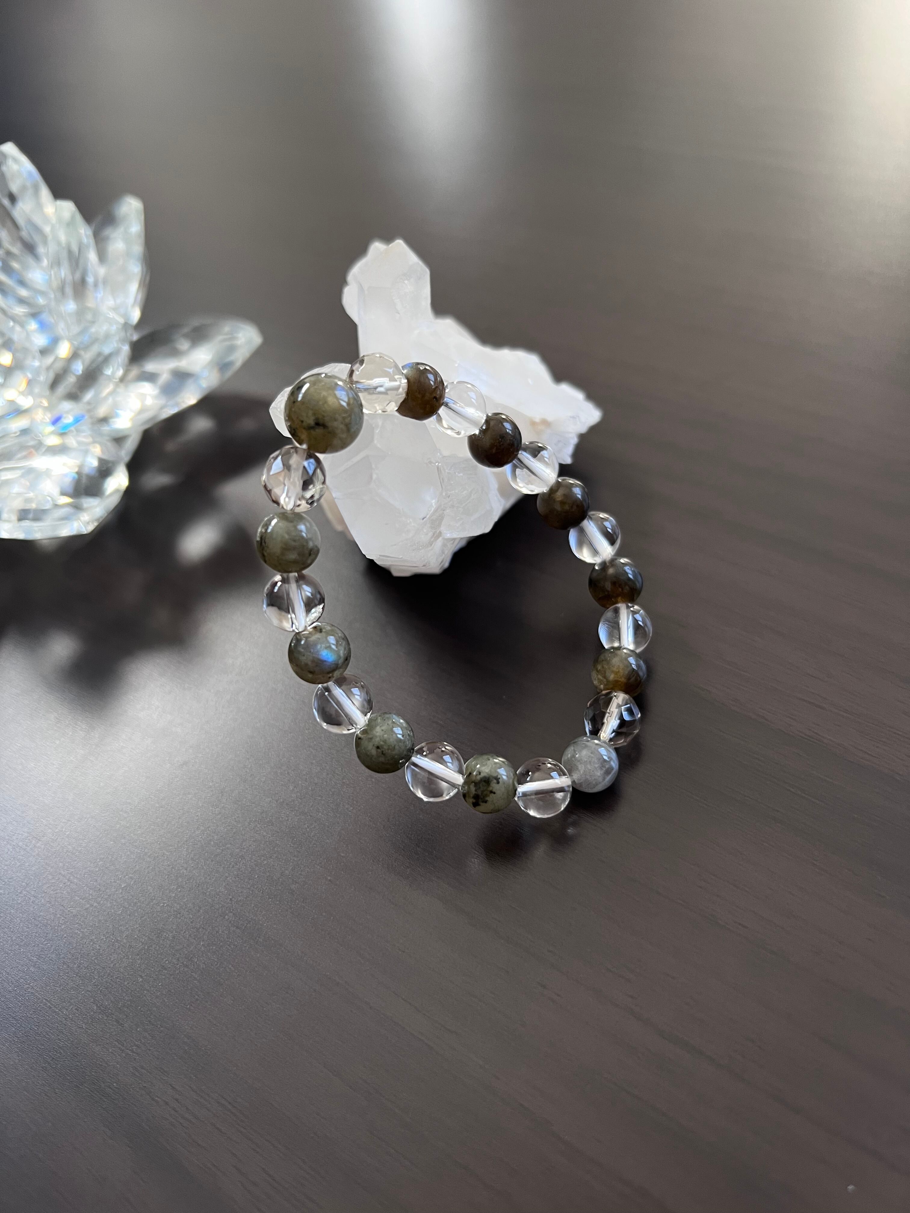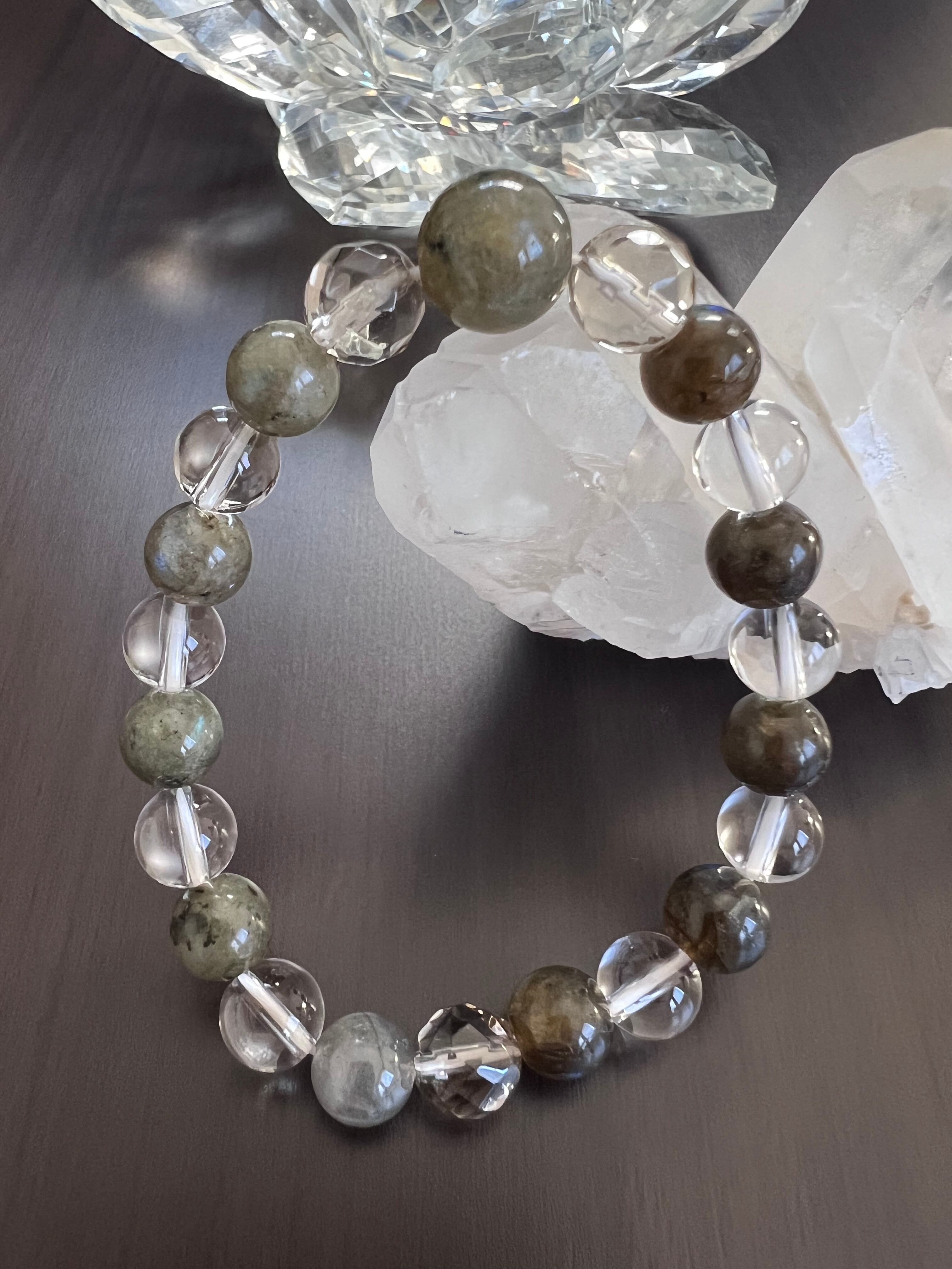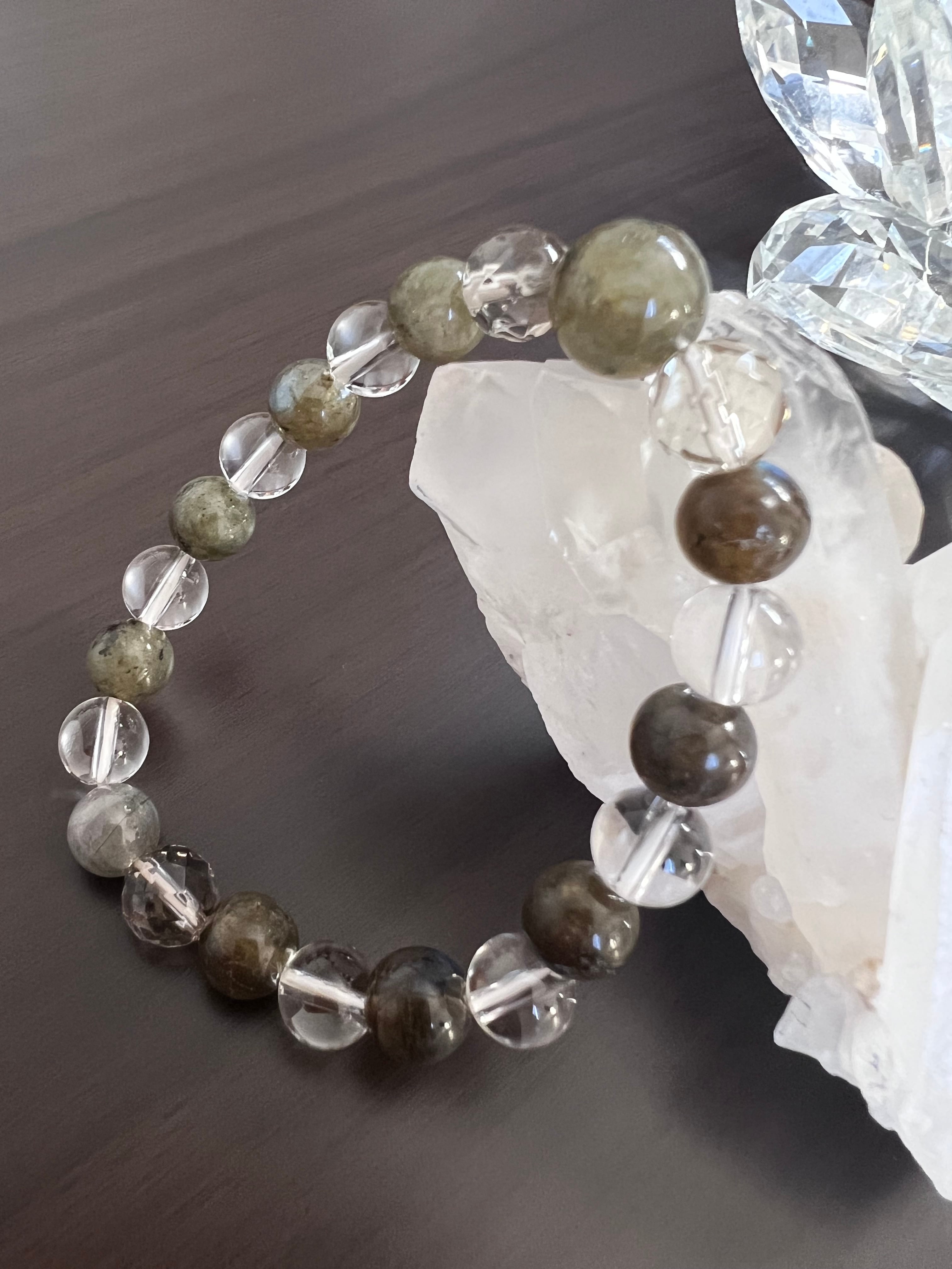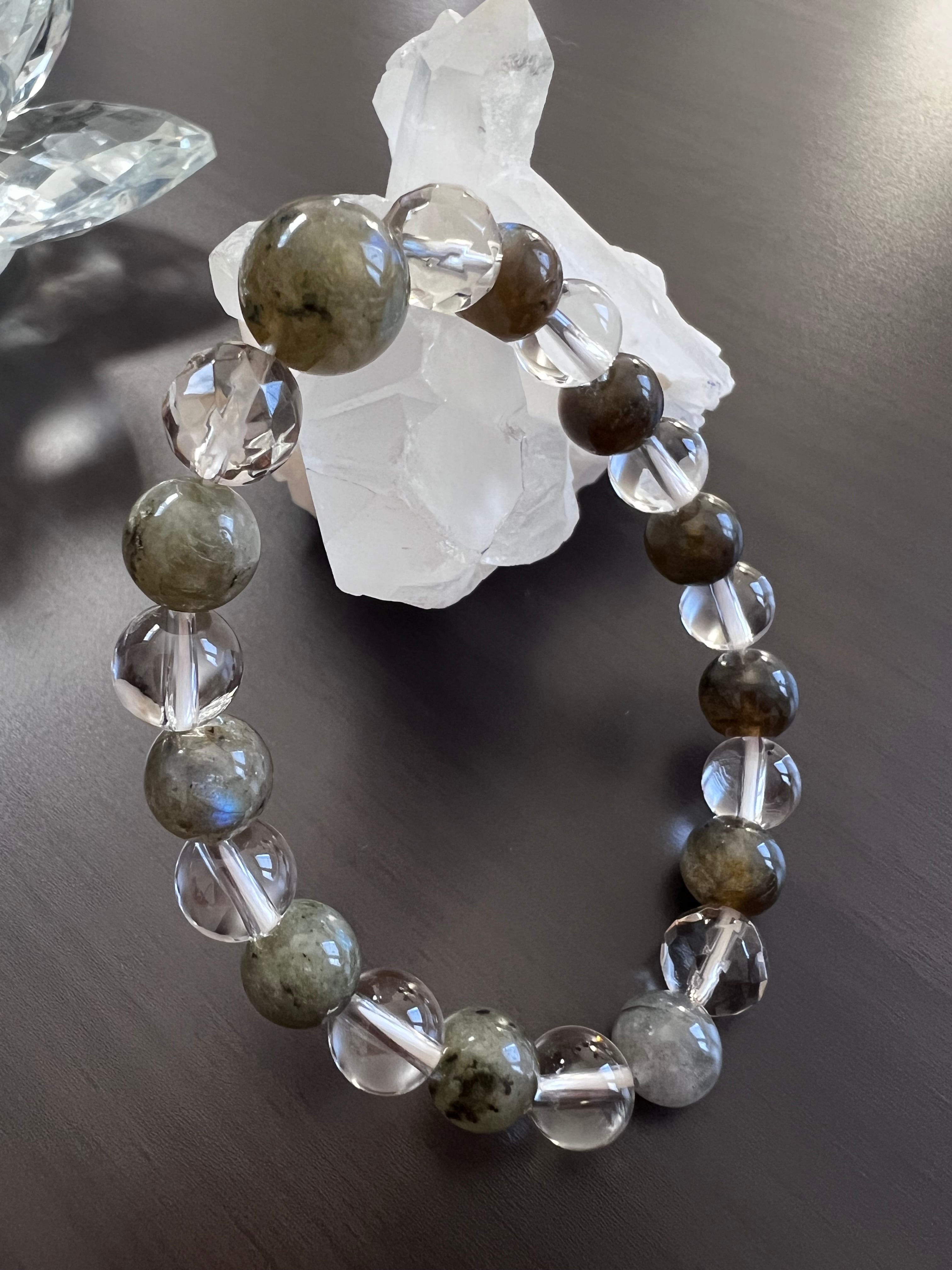 このブレスレットは、創造性、安定感、心の明晰さを求める方に最適です! ラブラドライト、カットスモーキークォーツ、水晶の美しい調和が、あなたの日常にエネルギーと新たな可能性をもたらすことでしょう。