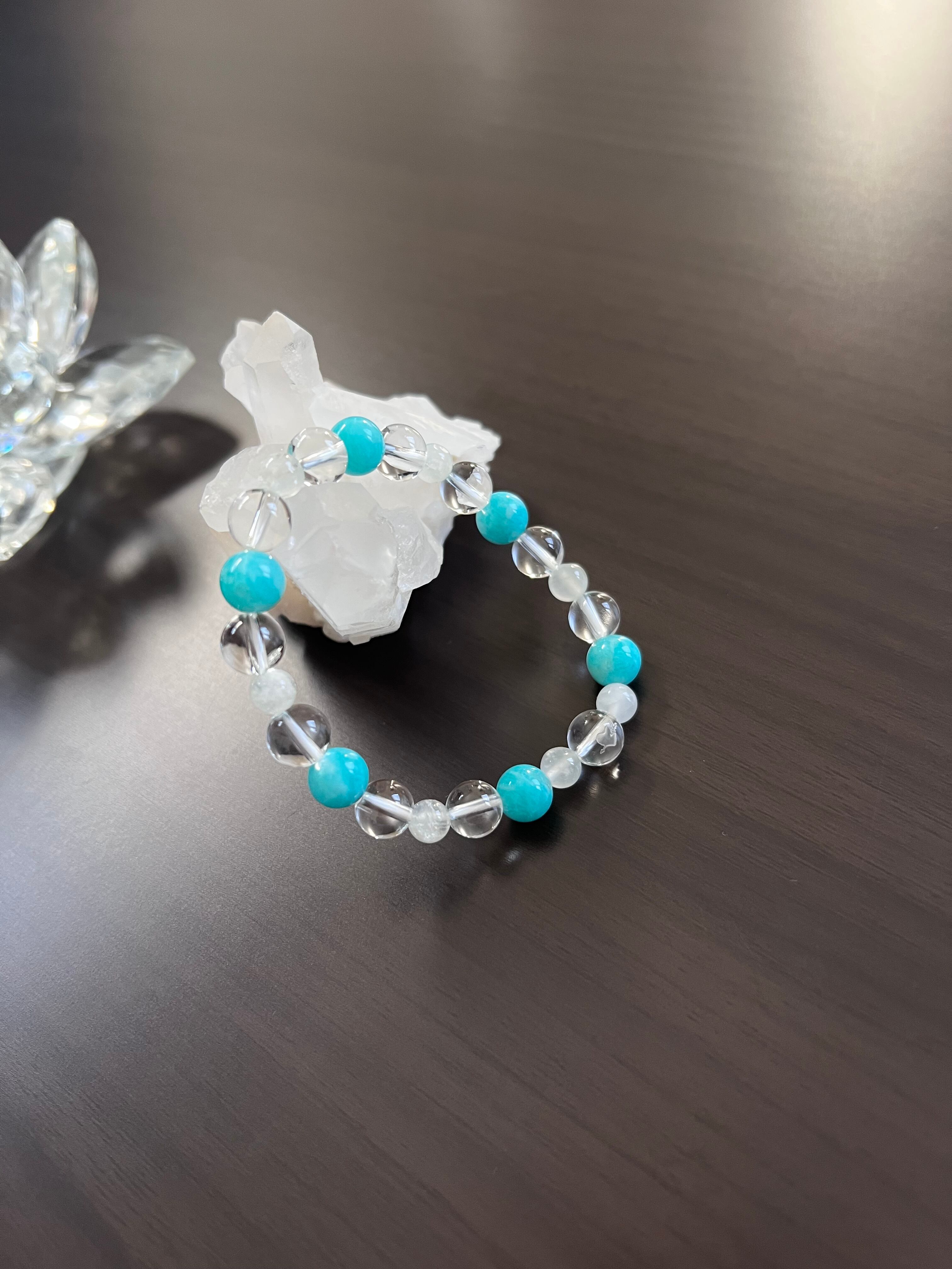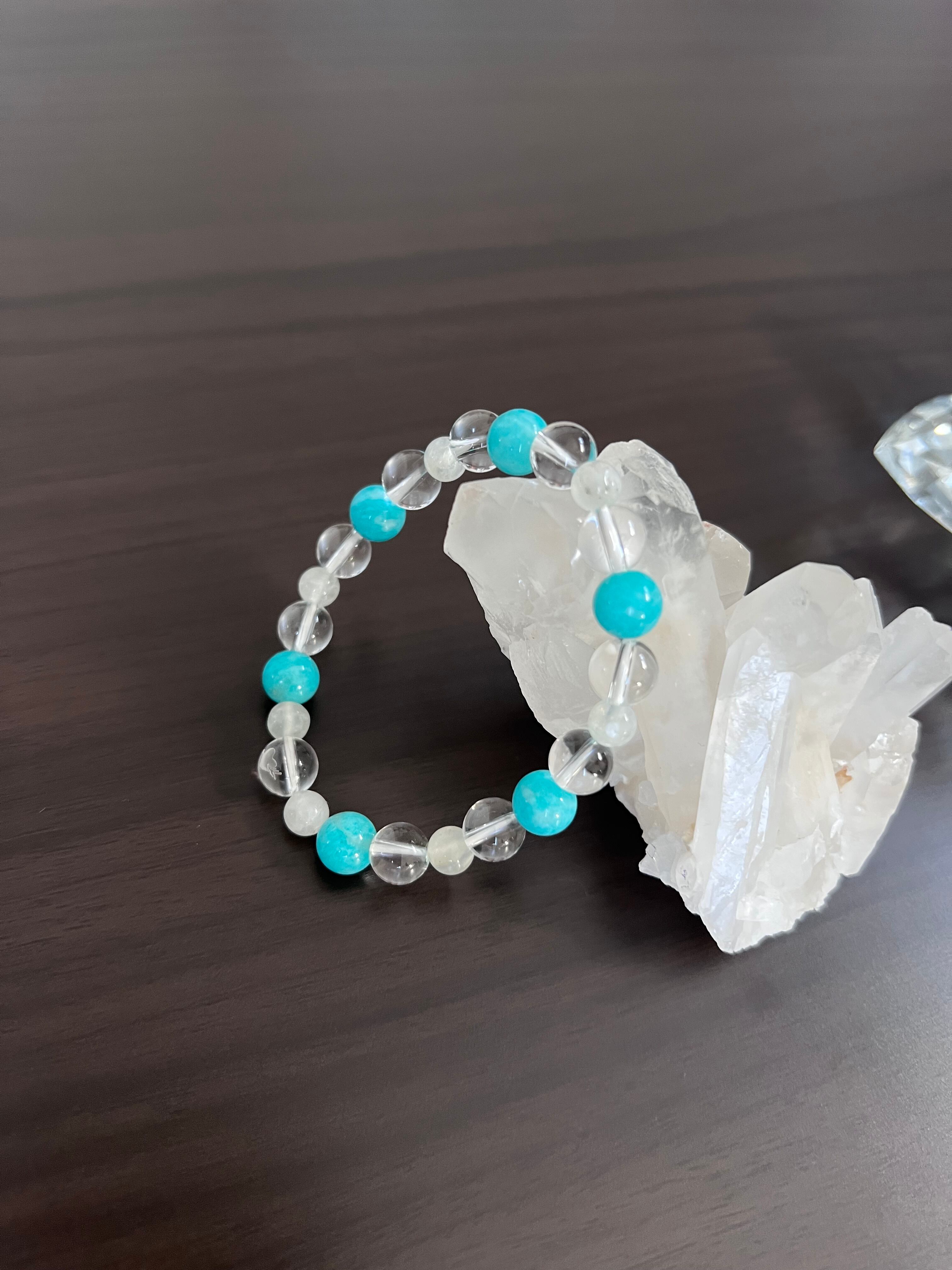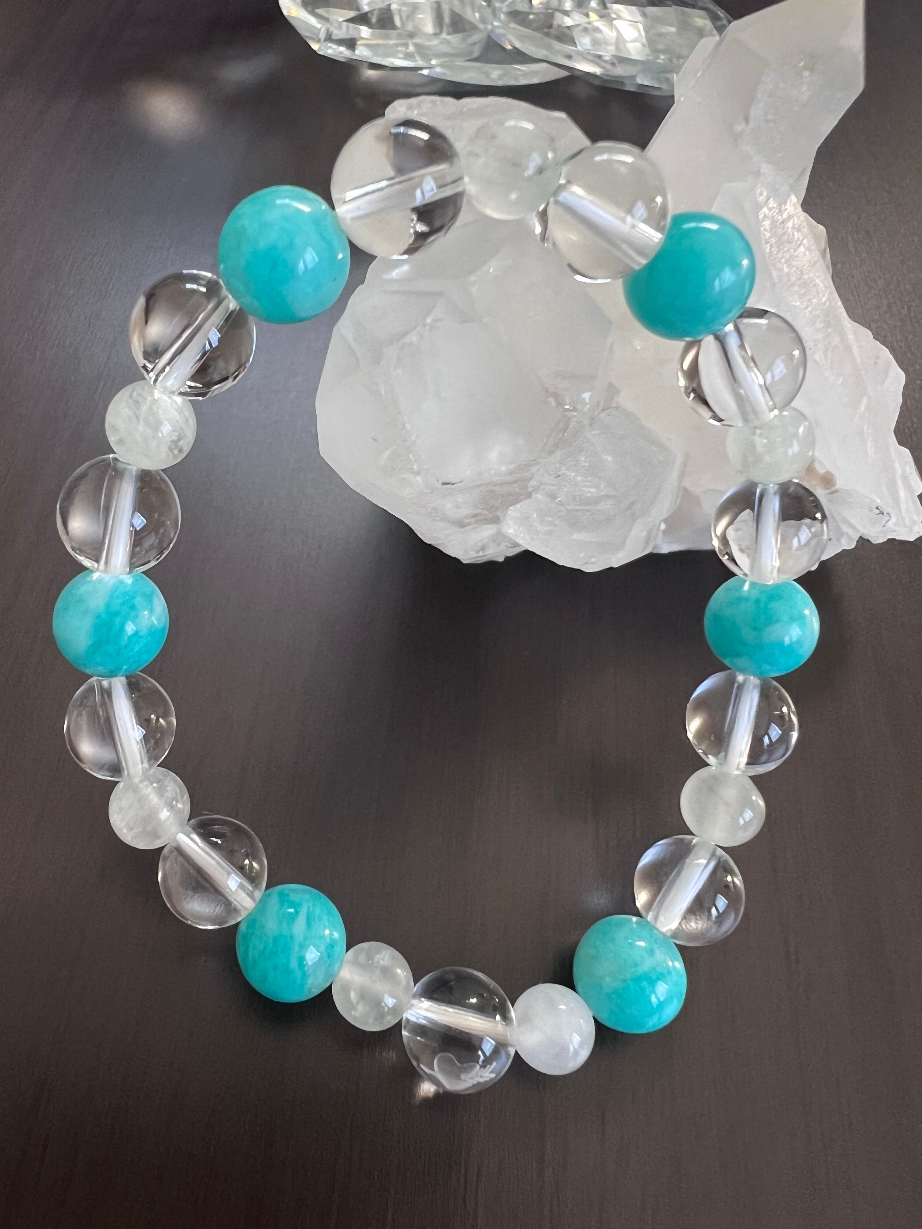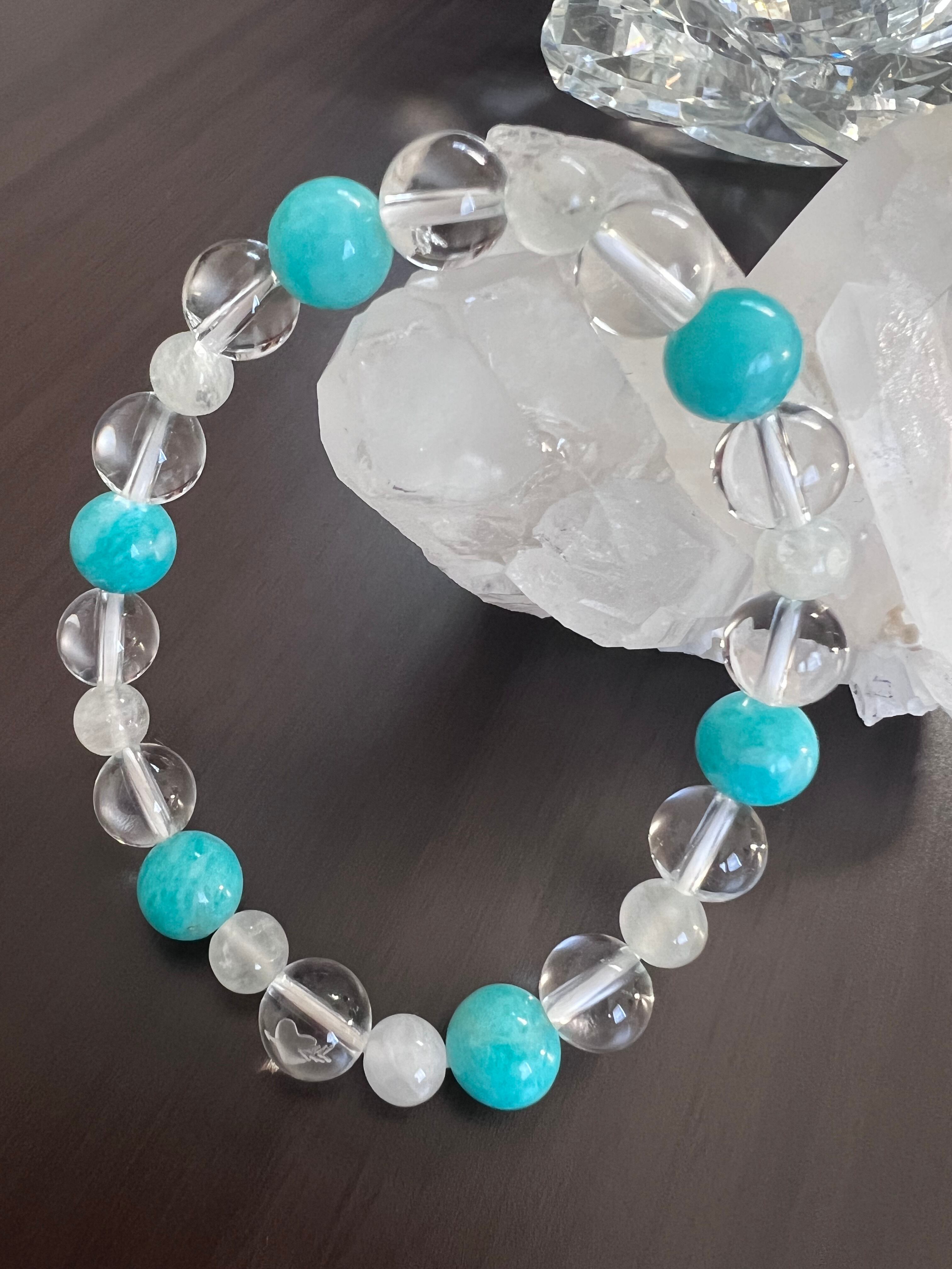 このブレスレットは、心の安定、感情の調和、自己愛を求める方に最適です! アマゾナイト、ムーンストーン、水晶、ハート彫り水晶の美しい調和が、あなたの日常に癒しと新たなエネルギーをもたらしますこと間違いありません。