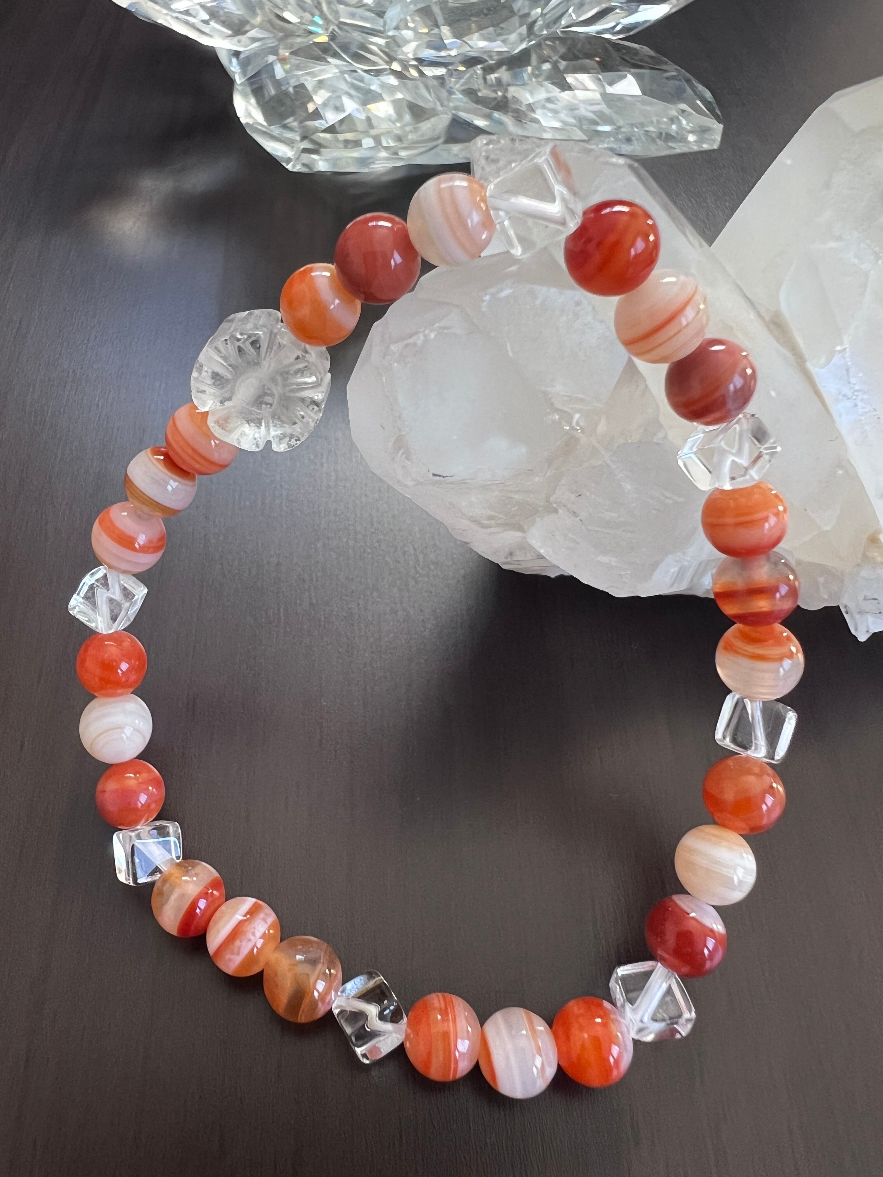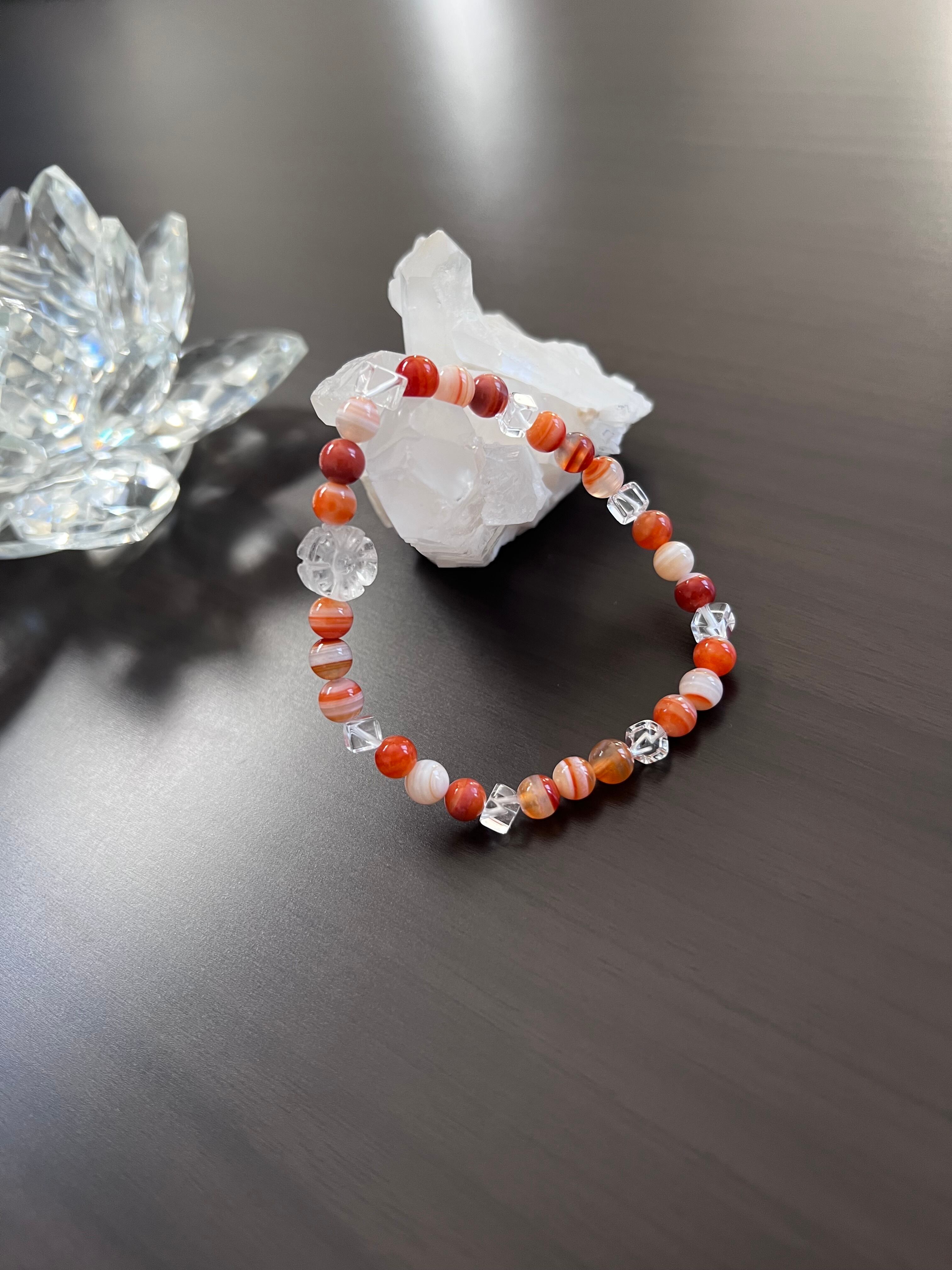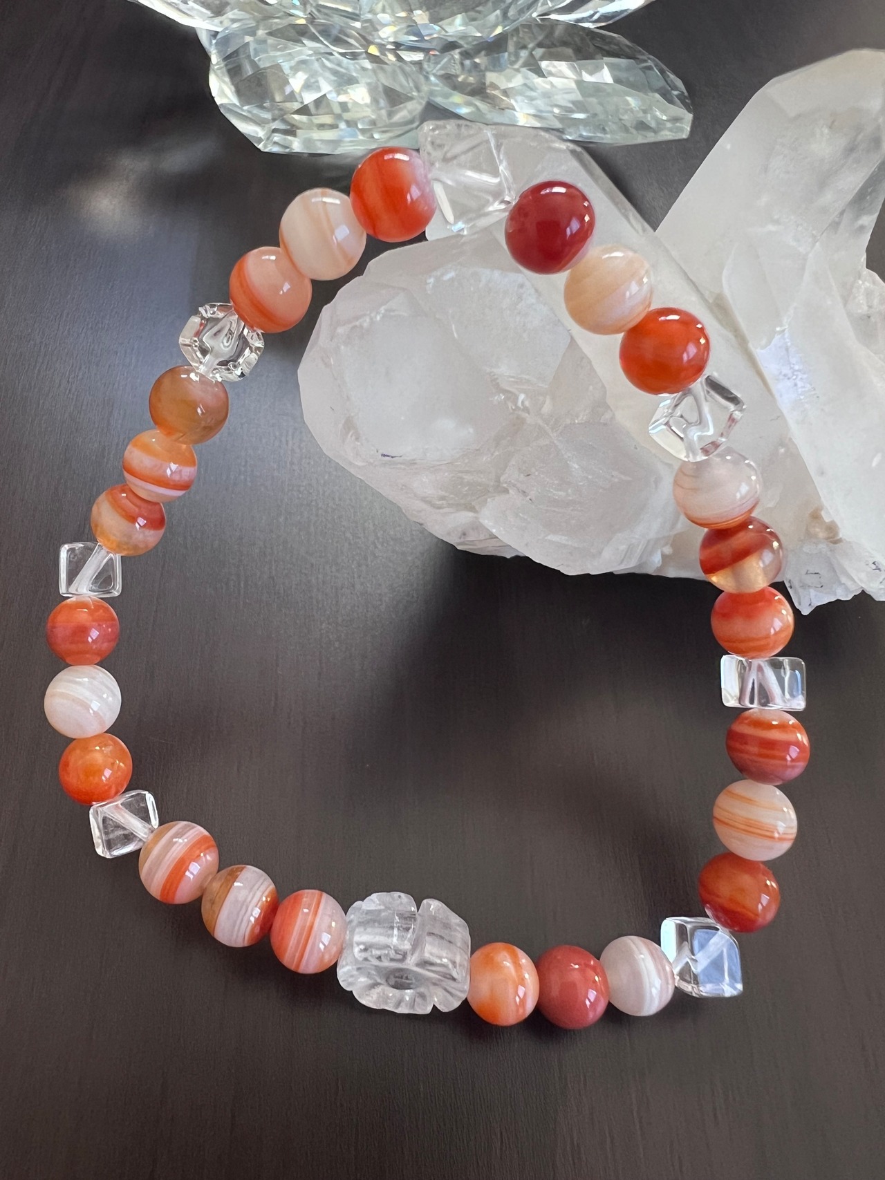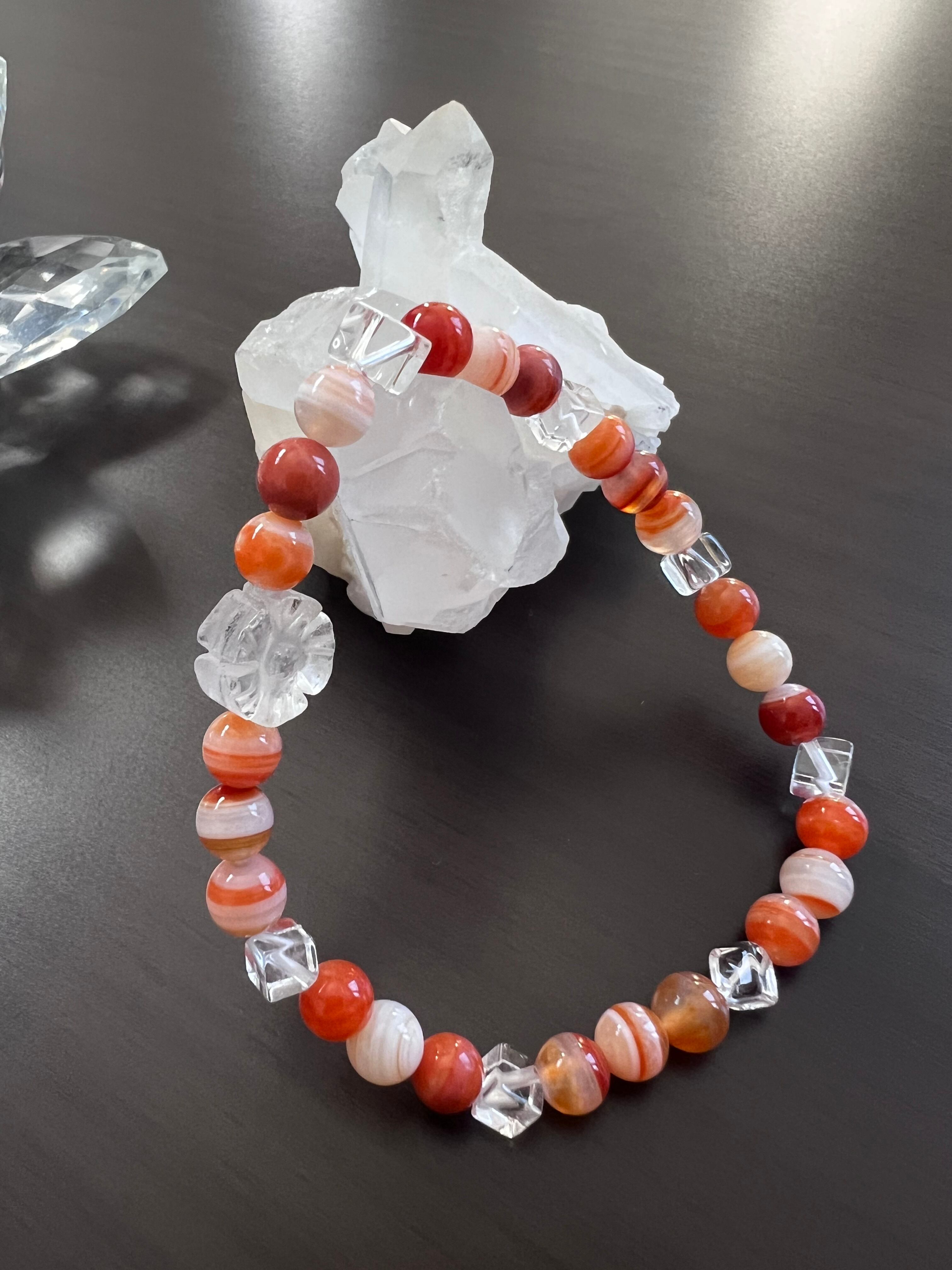 このブレスレットは、集中力、内面的な成長、クリエイティビティを求める方に最適です! サードオニキス、フラワーカット水晶、キューブカット水晶の美しい調和が、あなたの日常に力強さと鮮やかさを与えることでしょう。