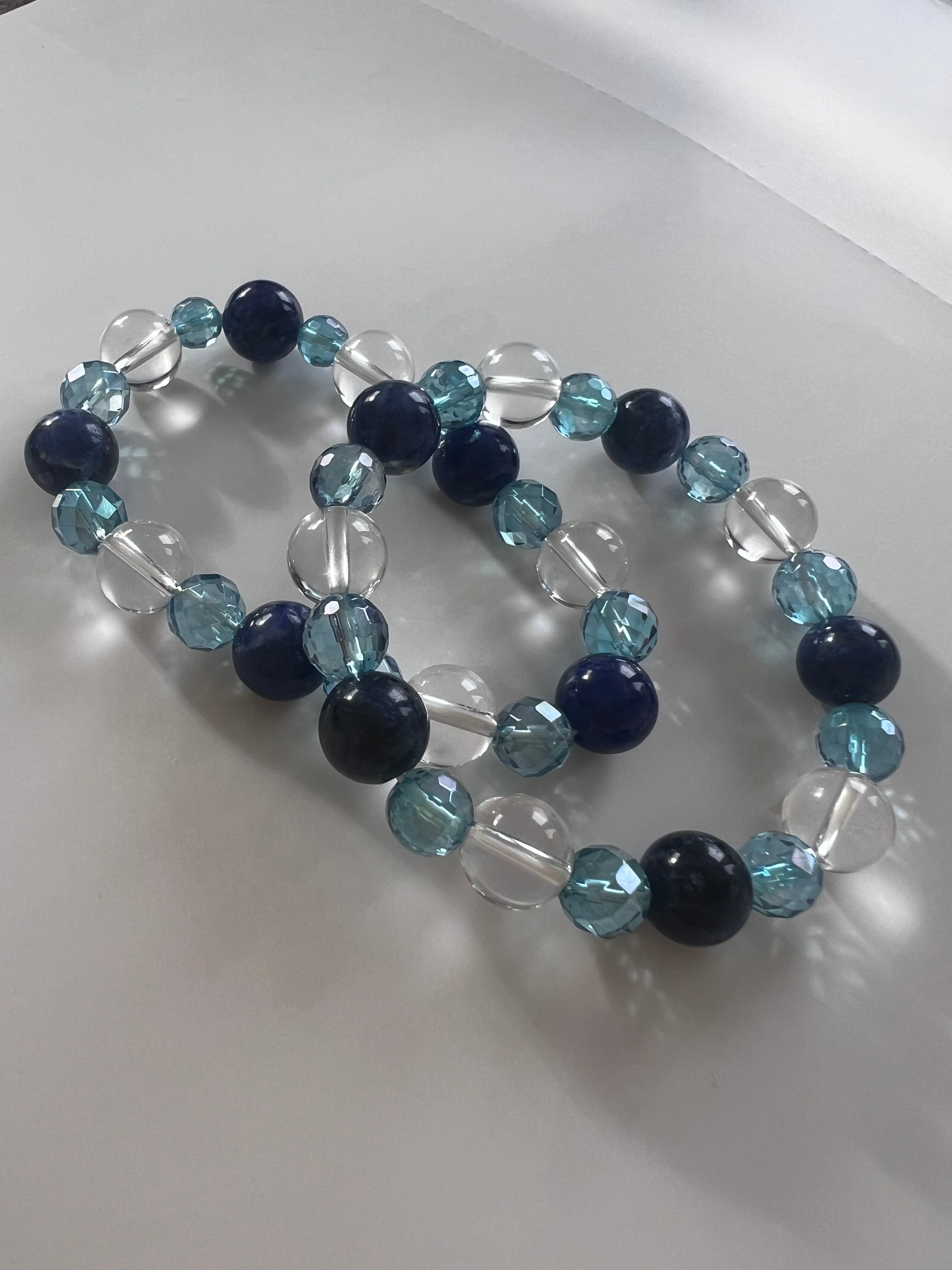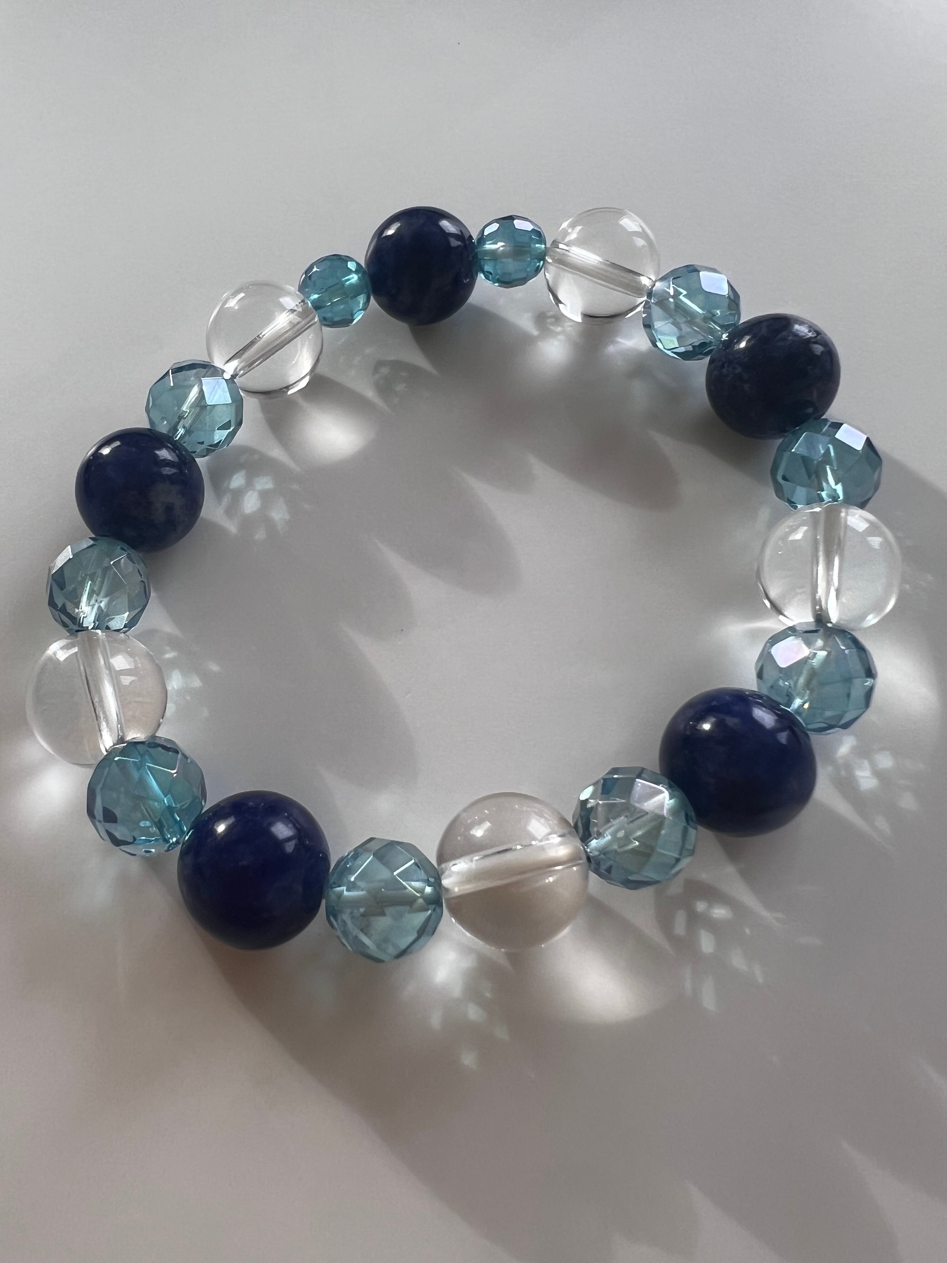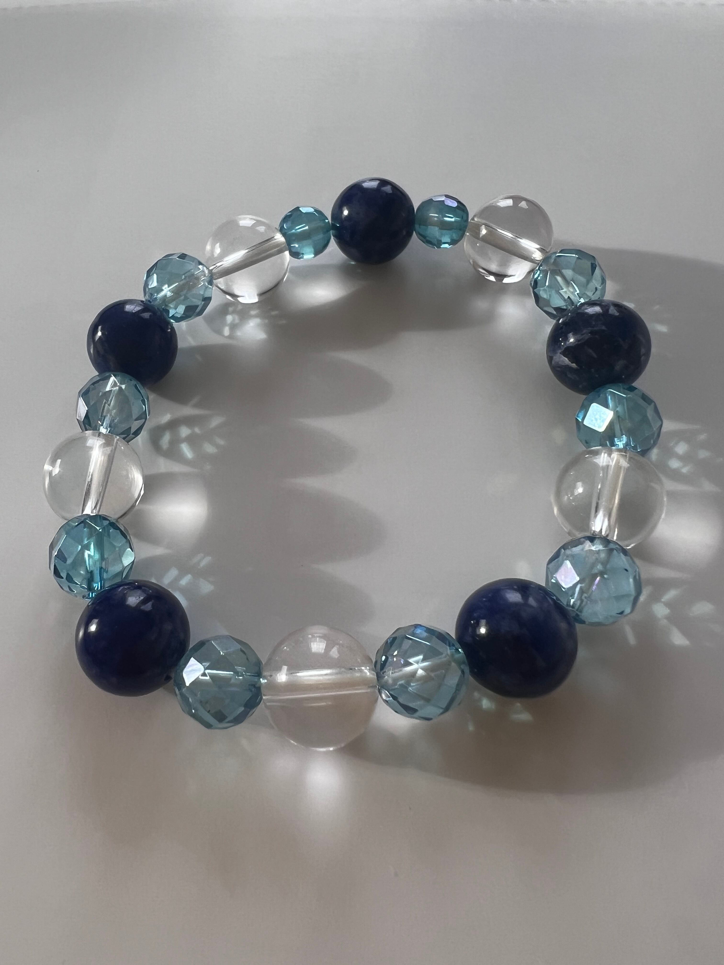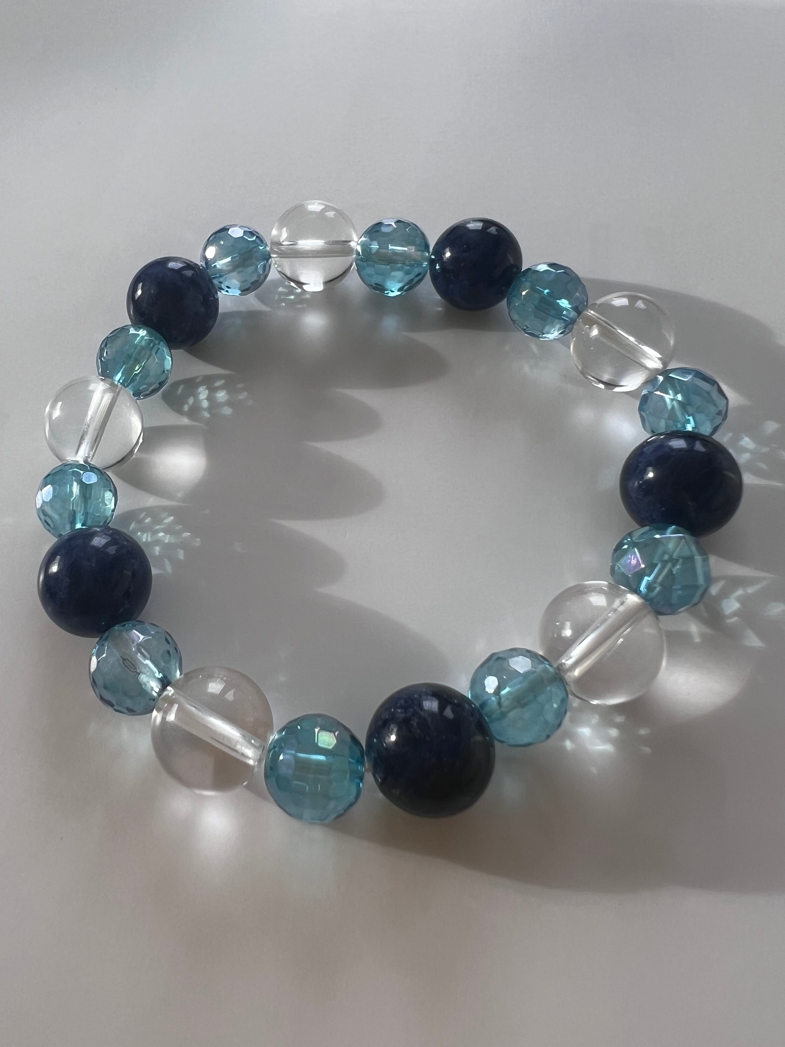 このブレスレットは、心の平安やコミュニケーションの力を求める方に最適です。ソーダライトの深い青とカットアクアオーラの輝きが、あなたの日常に癒しとインスピレーションをもたらすことでしょう!