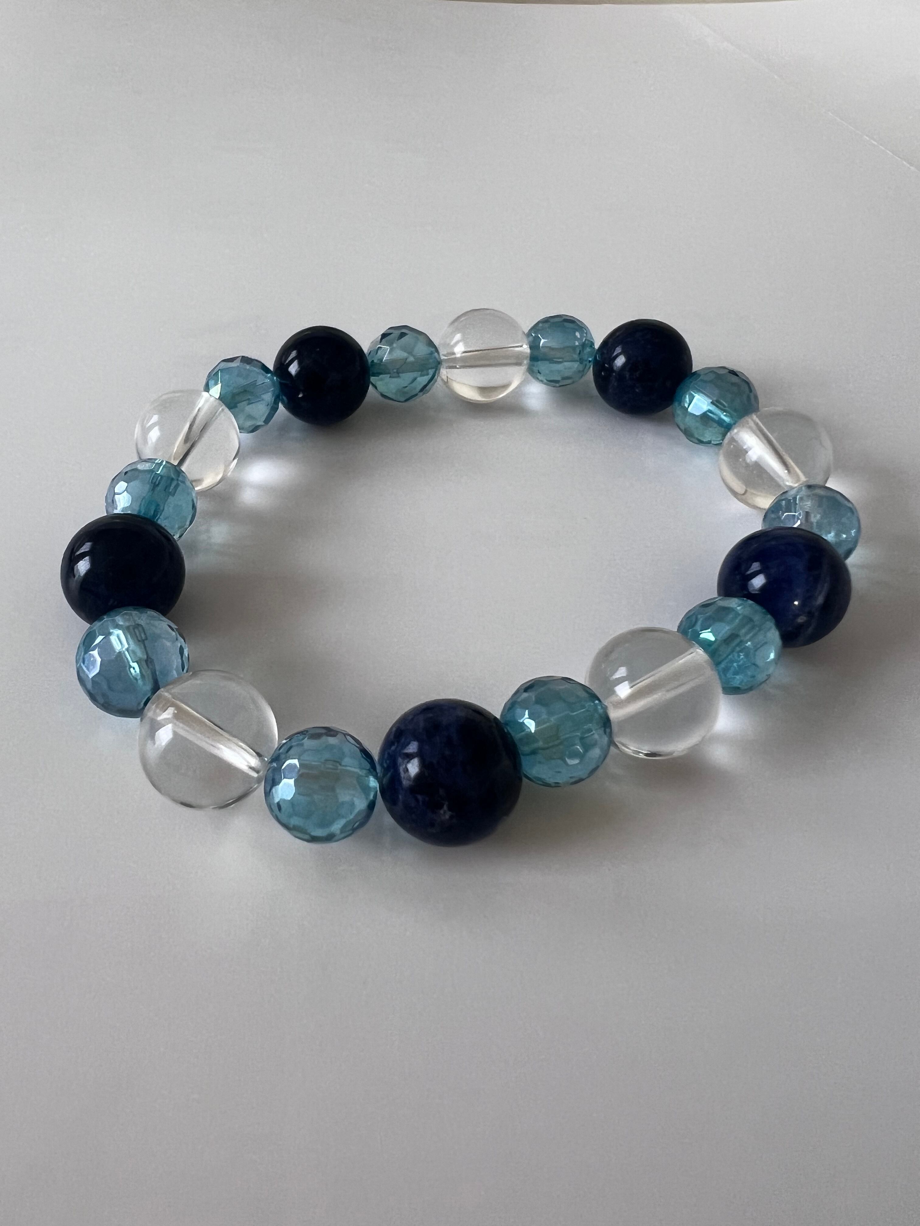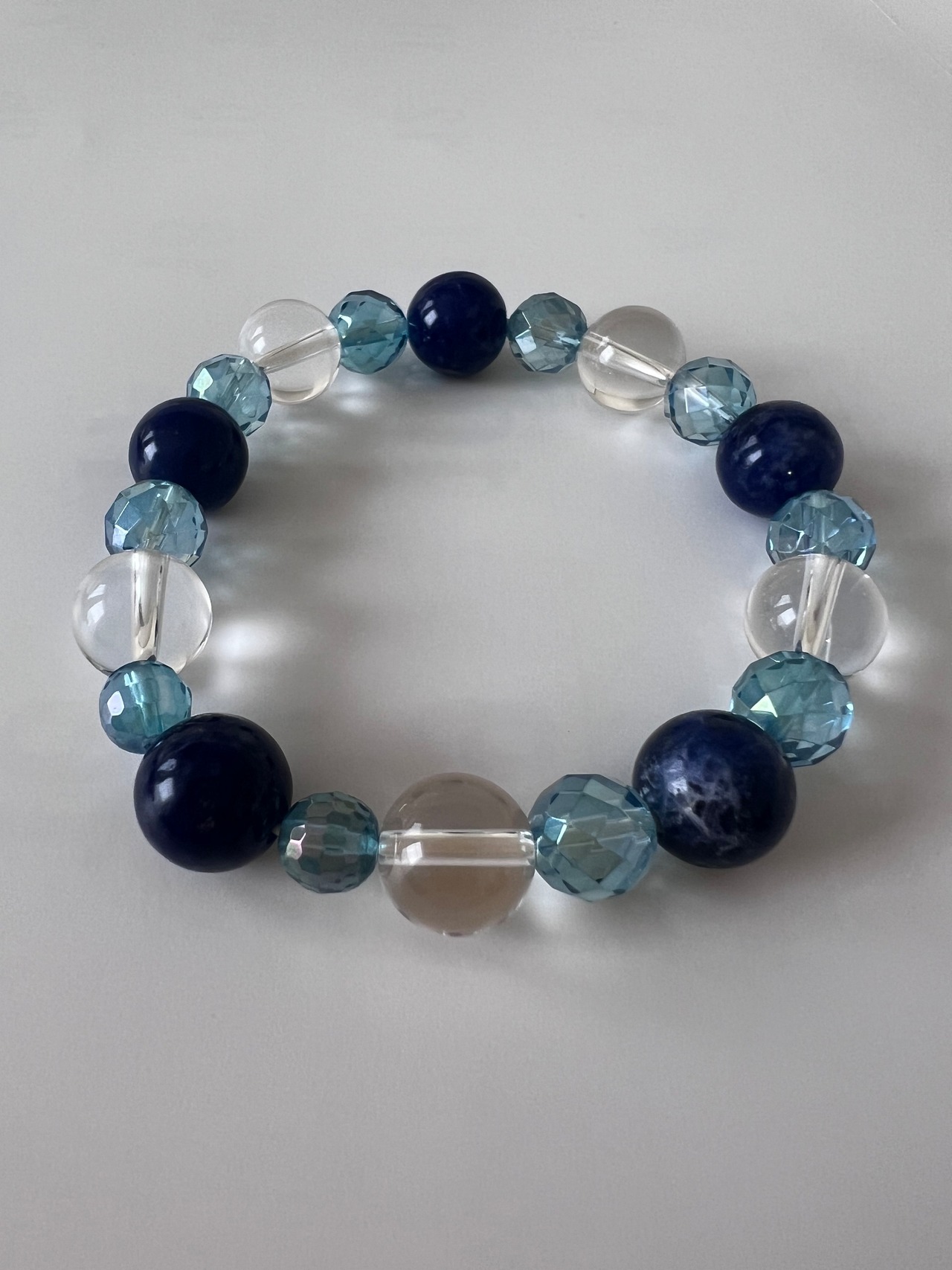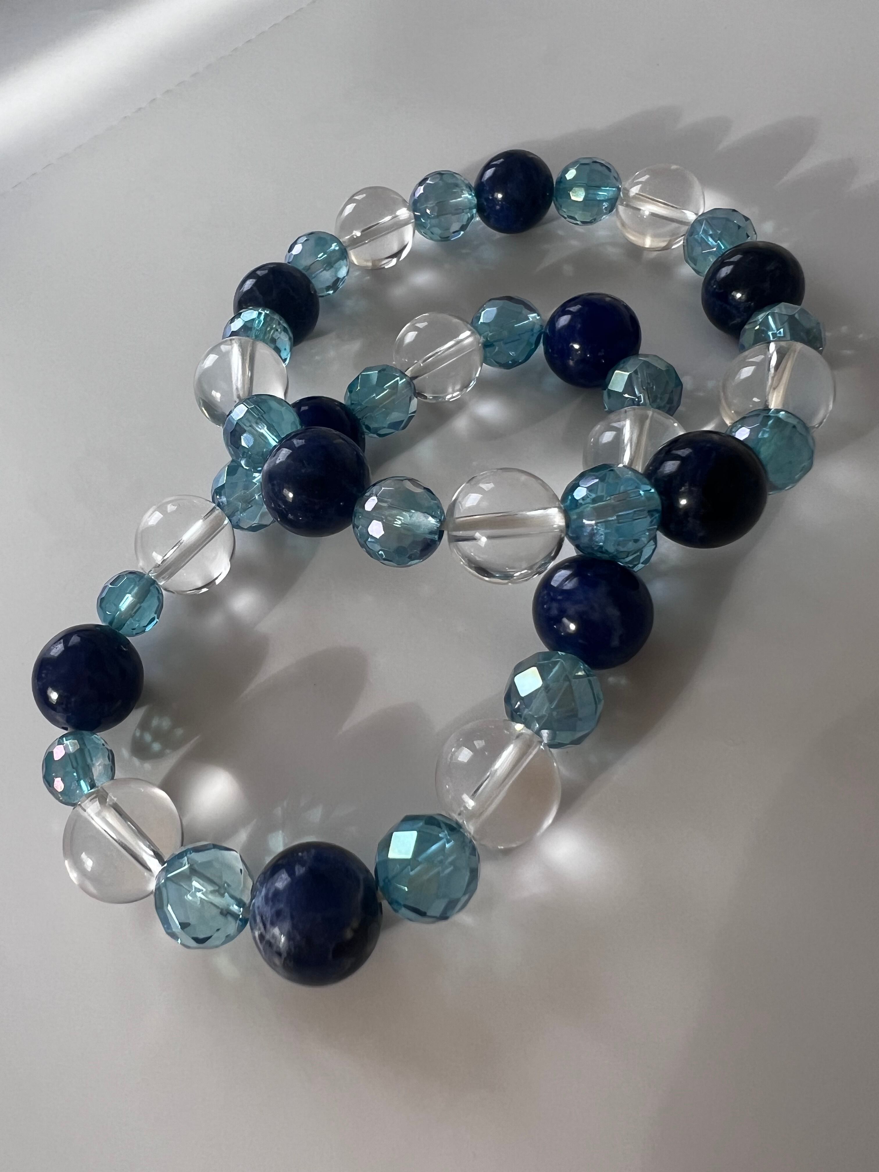 このブレスレットは、心の平安やコミュニケーションの力を求める方に最適です。ソーダライトの深い青とカットアクアオーラの輝きが、あなたの日常に癒しとインスピレーションをもたらすことでしょう!