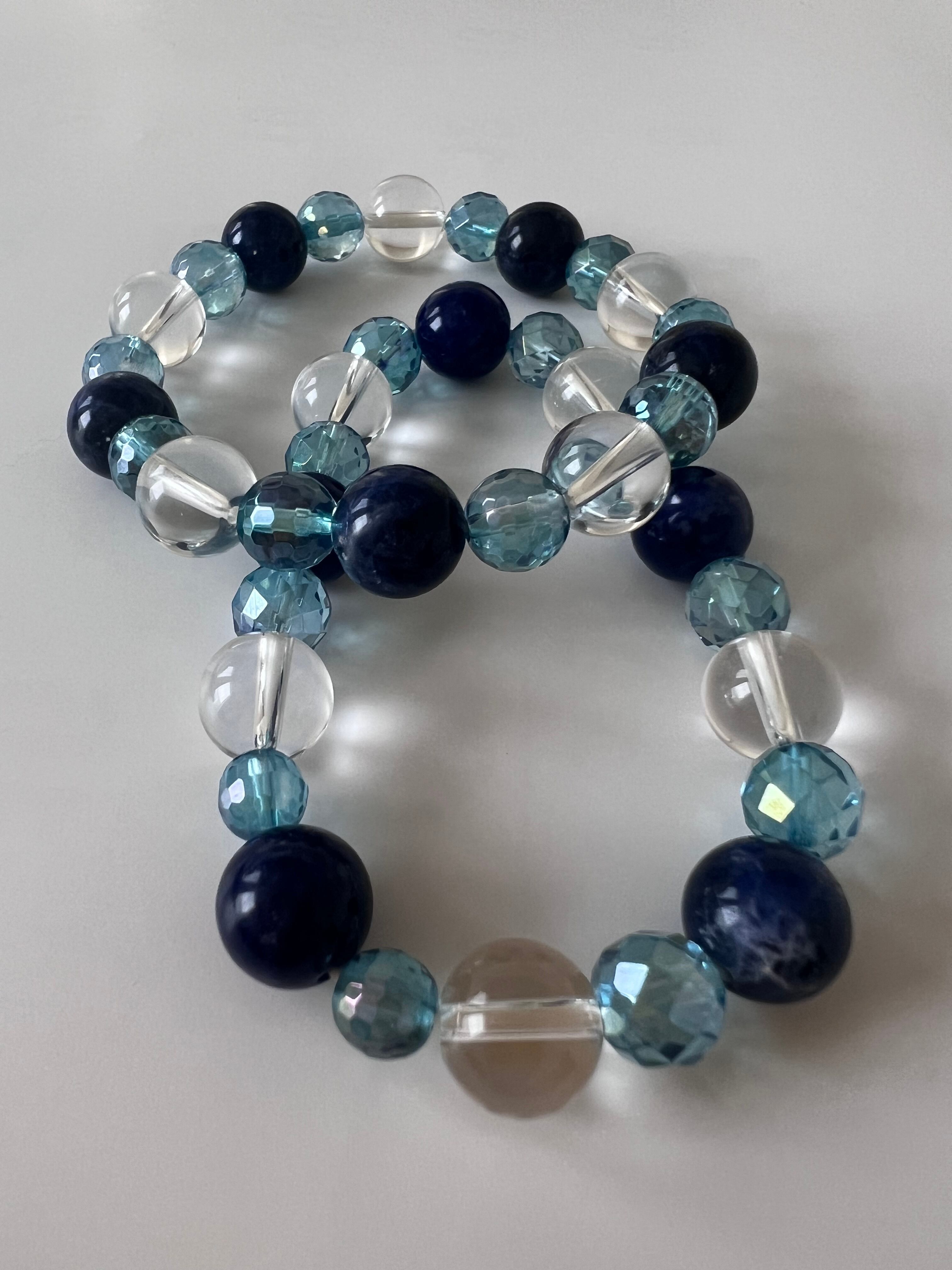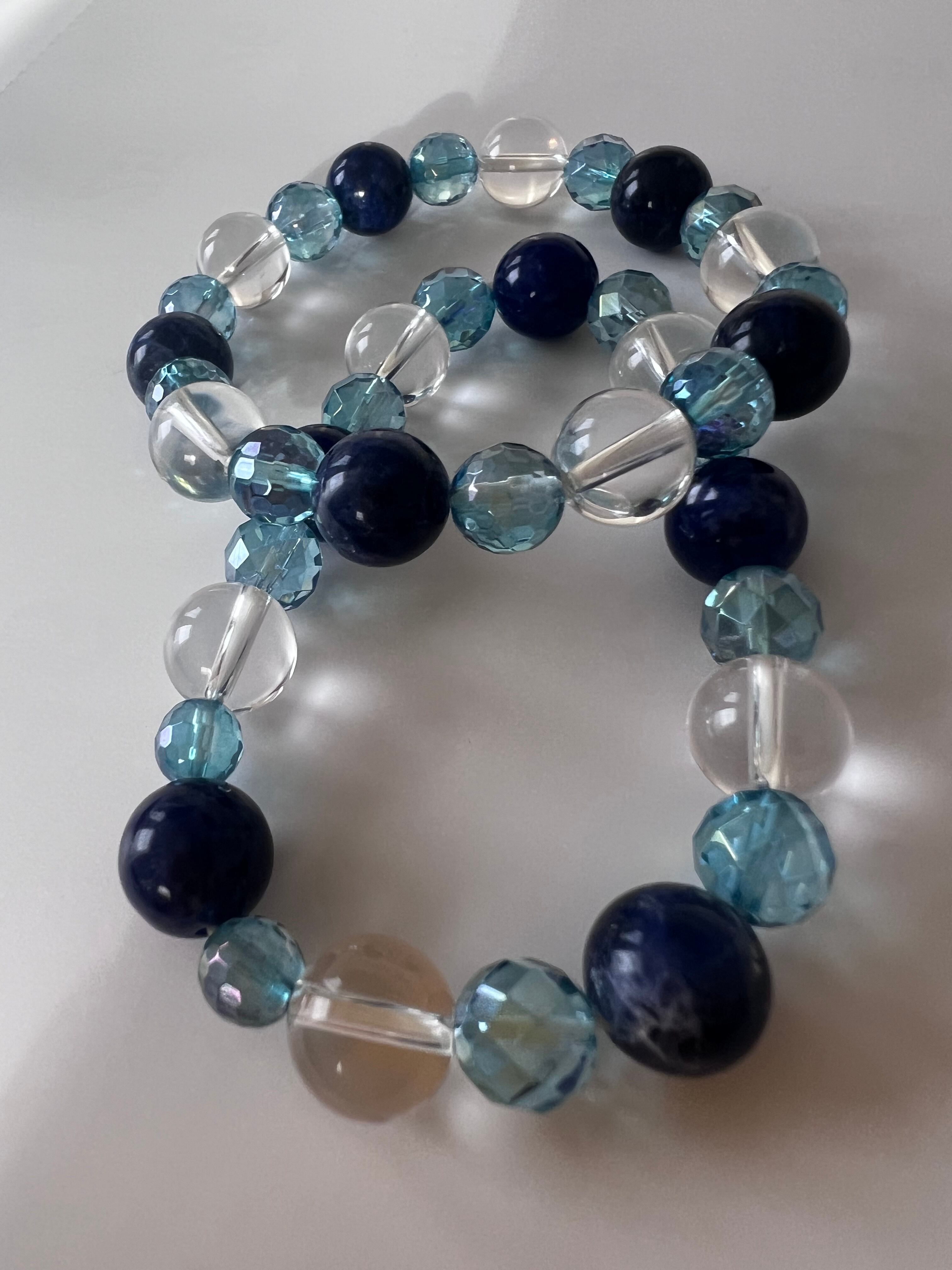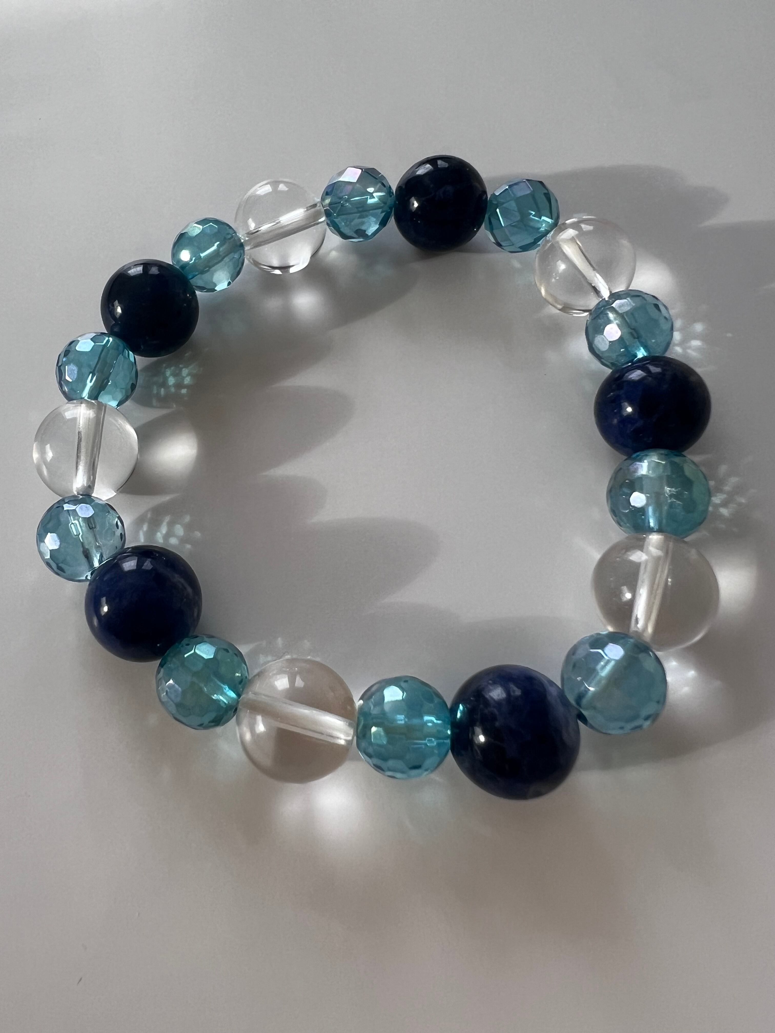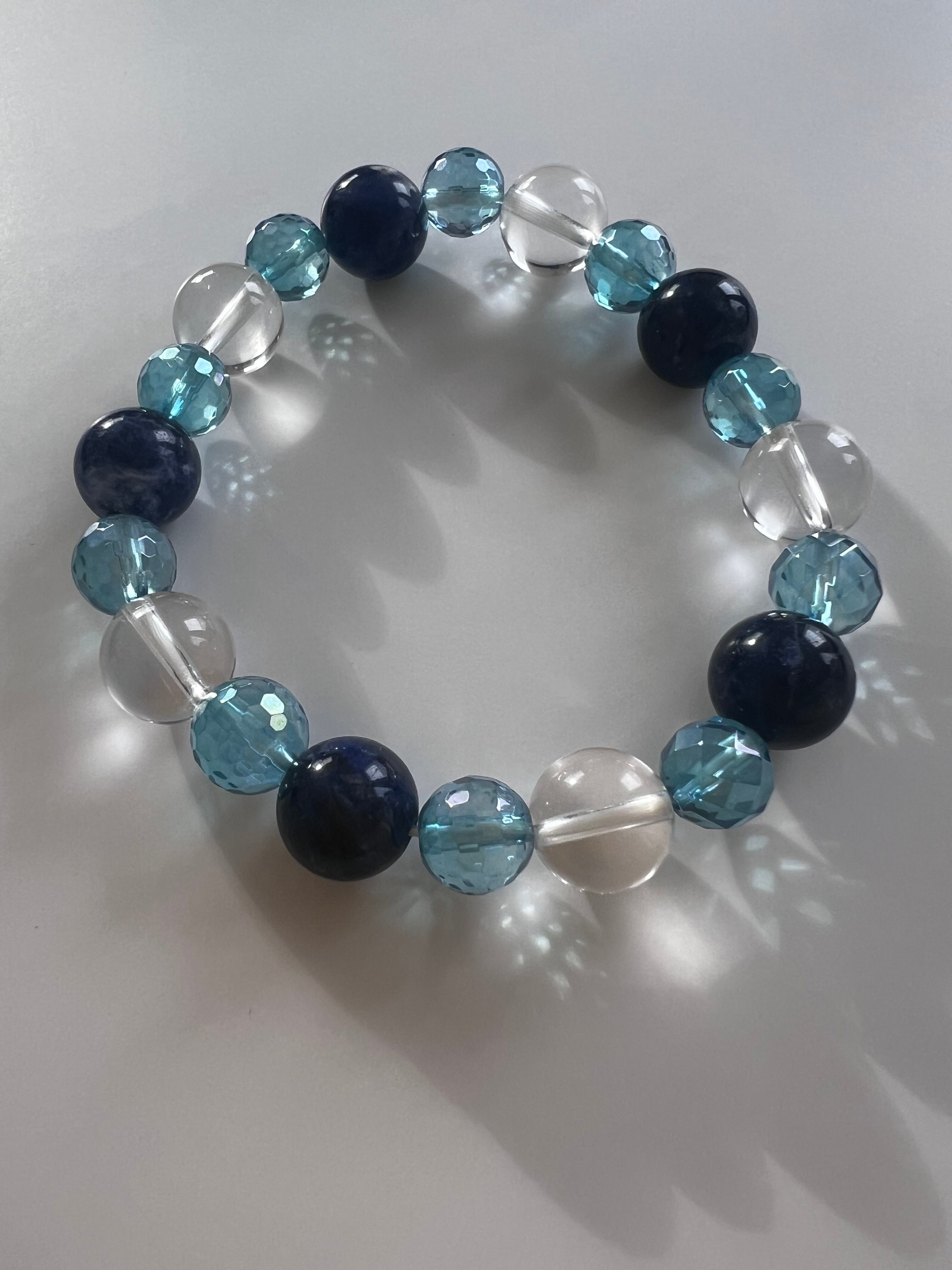 このブレスレットは、心の平安やコミュニケーションの力を求める方に最適です。ソーダライトの深い青とカットアクアオーラの輝きが、あなたの日常に癒しとインスピレーションをもたらすことでしょう!