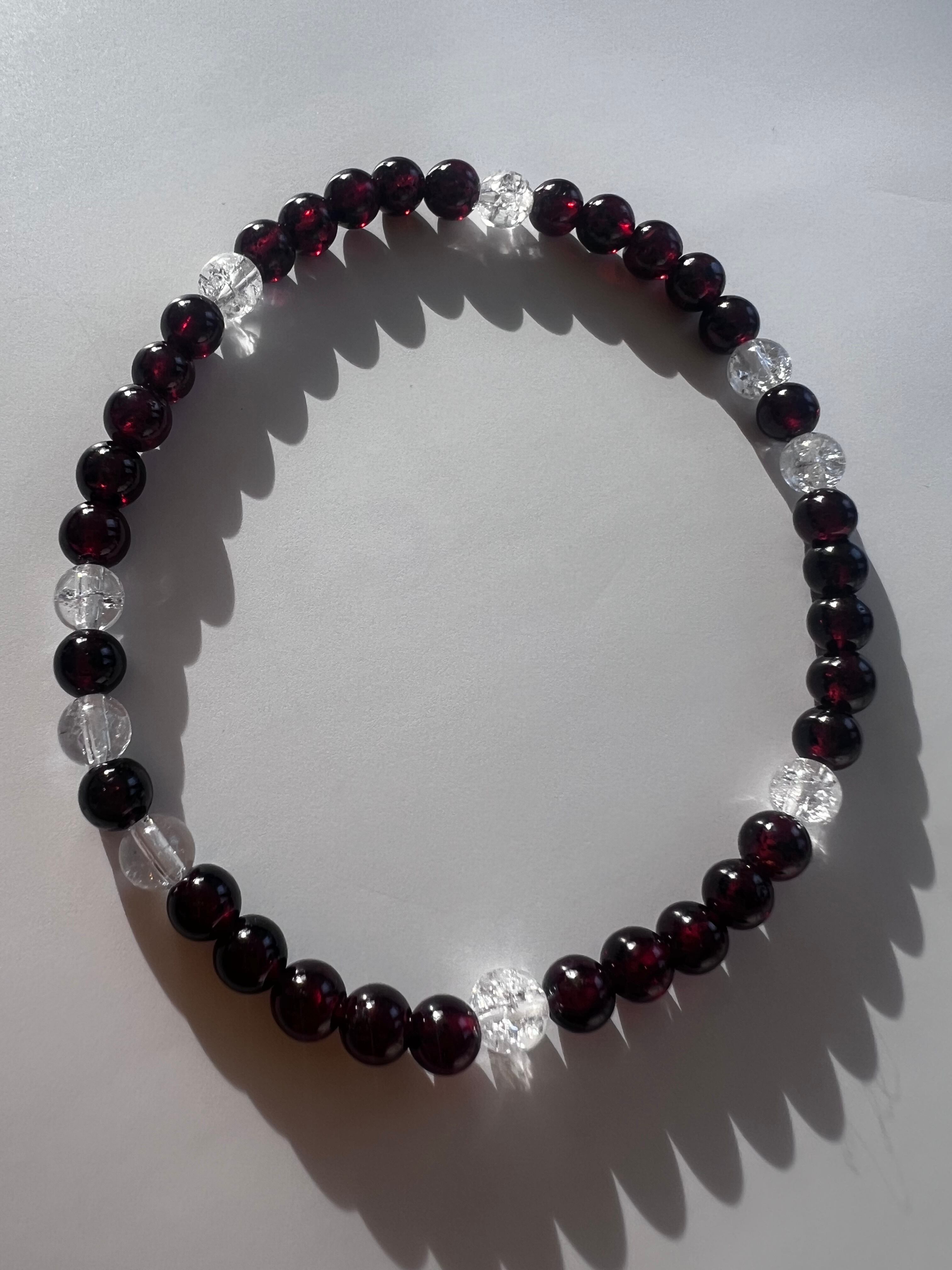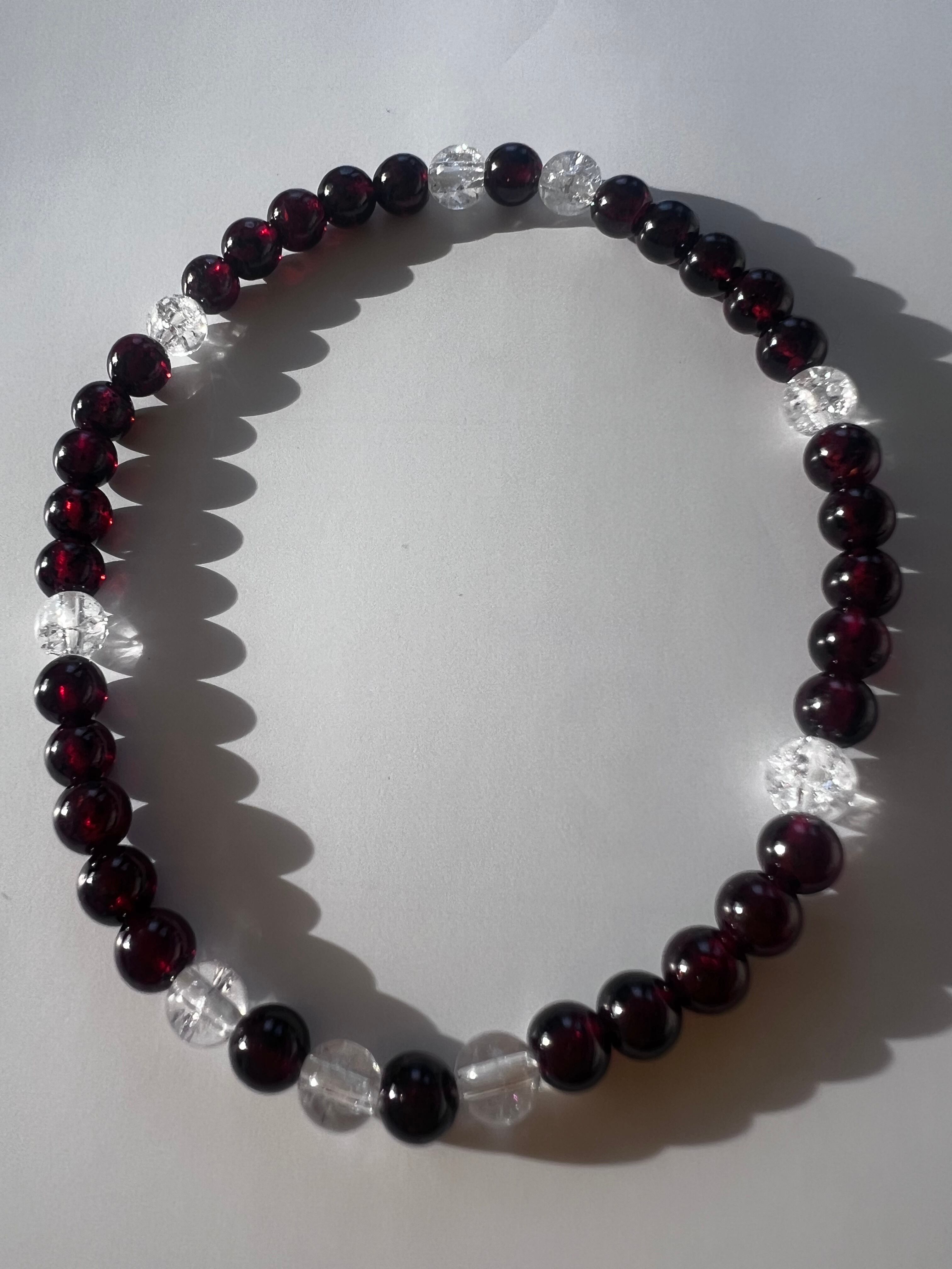 このブレスレットは、情熱あふれるエネルギーや心の平穏を求める方に最適です。ガーネットの情熱的な輝きとクラック水晶のユニークな模様が、あなたの日常にバイタリティと豊かさをもたらすことでしょう!