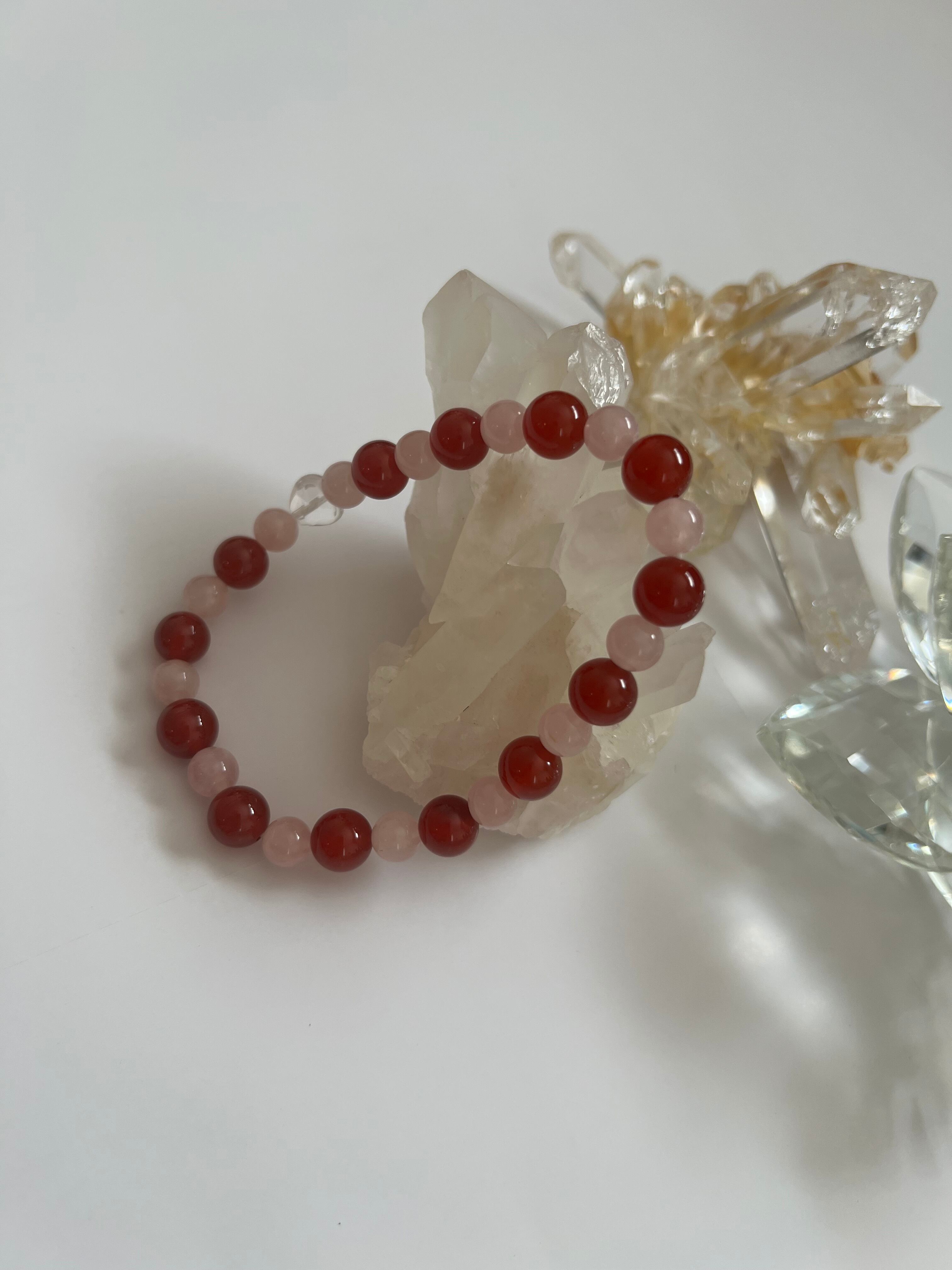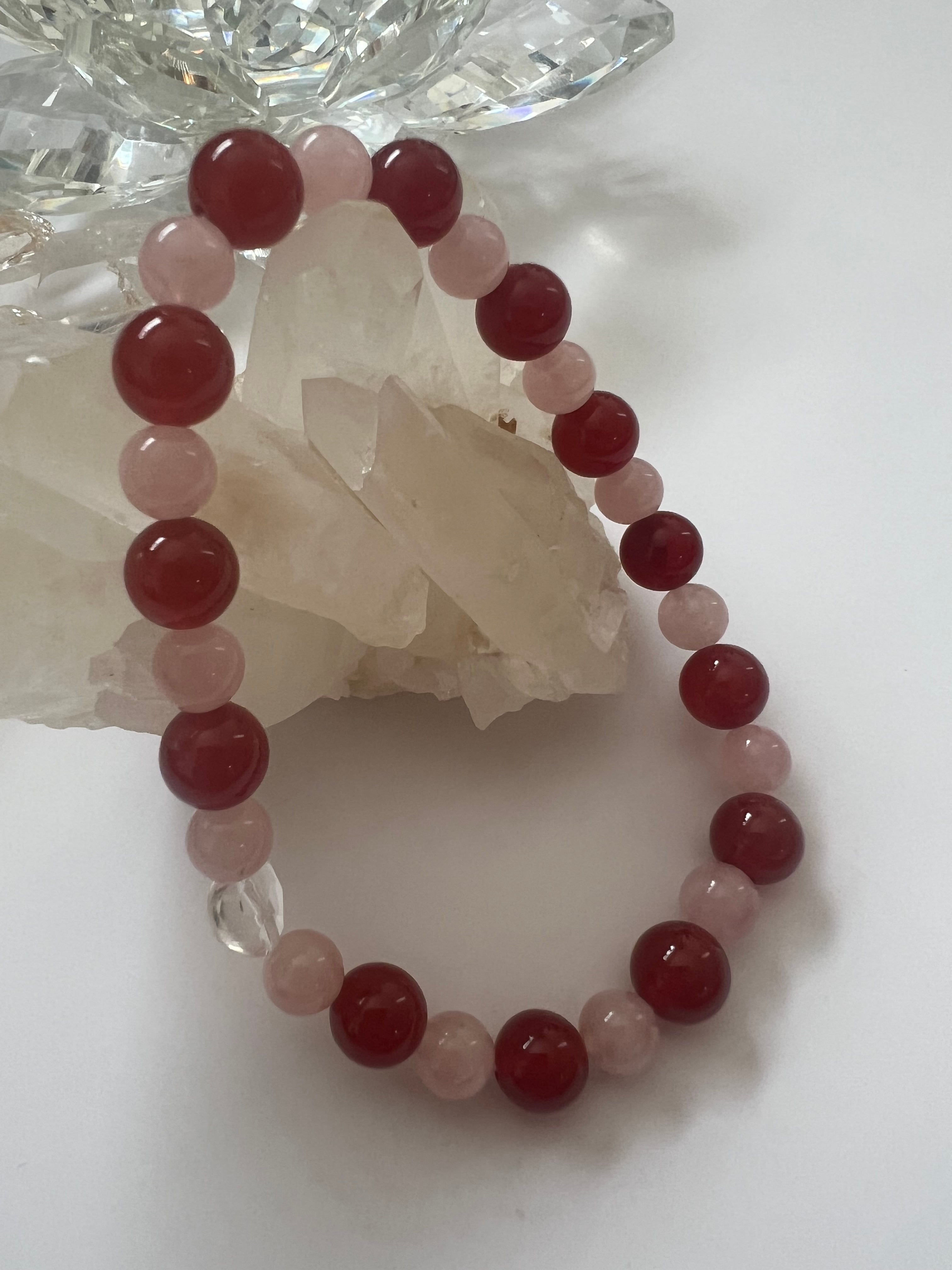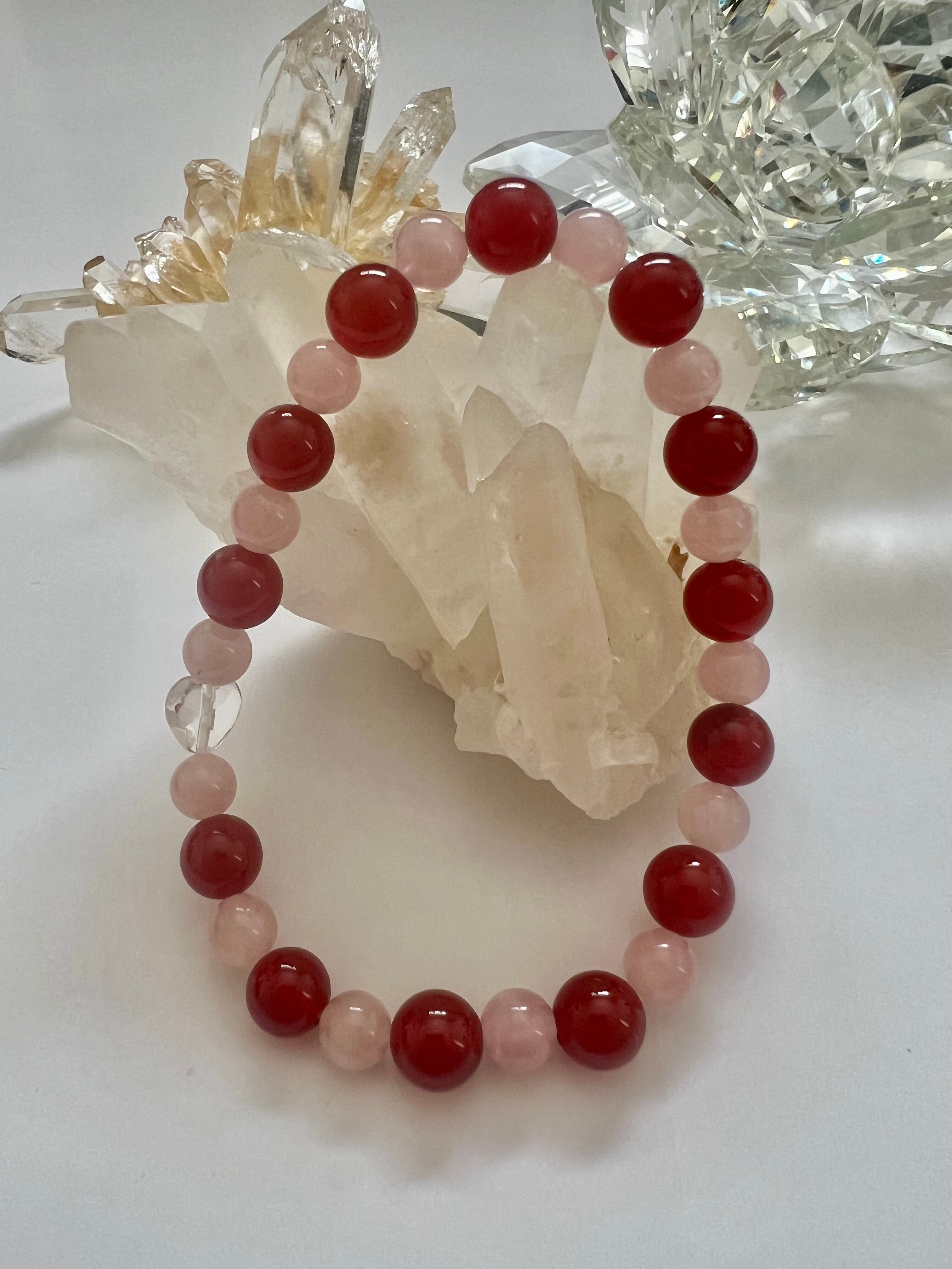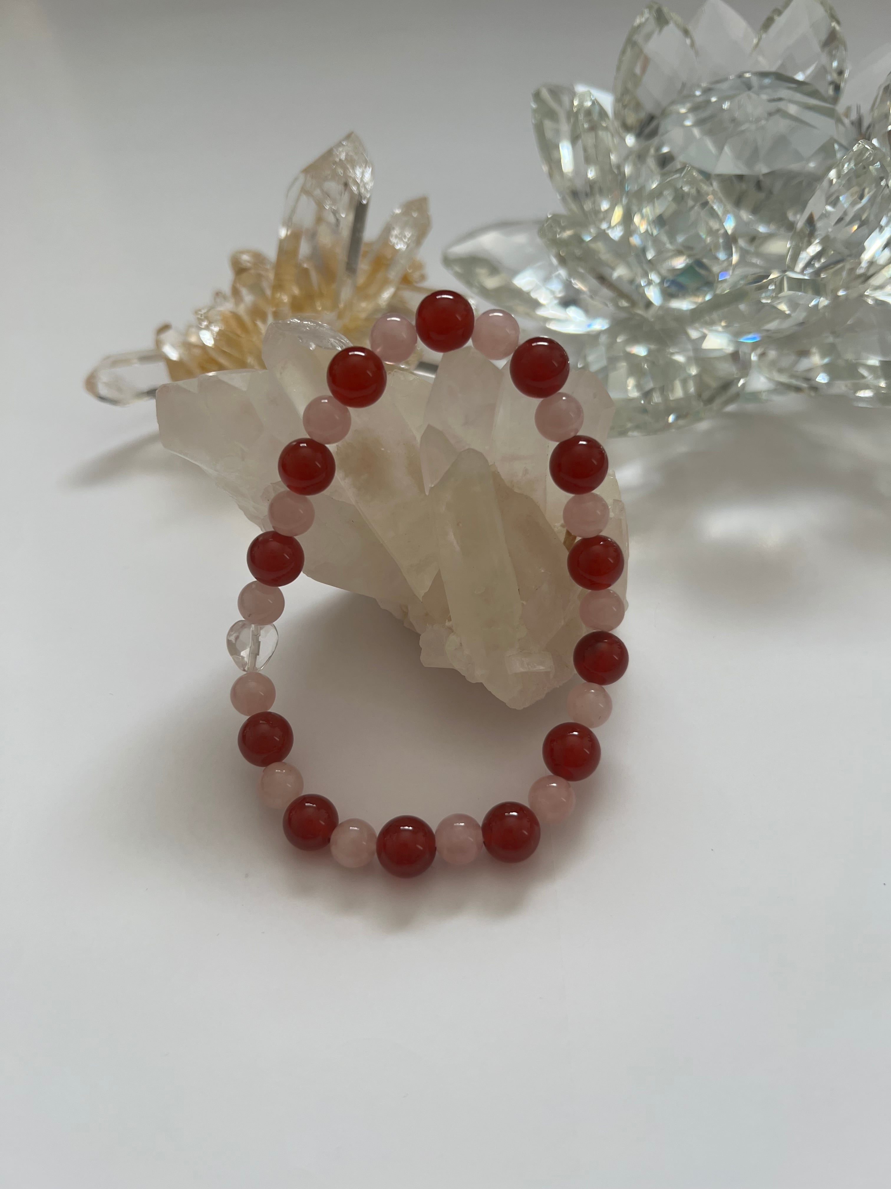 このブレスレットは、愛や自己表現を大切にしたい方に最適です。カーネリアンのエネルギー、ローズクォーツの優しさ、そしてハートカット水晶の浄化力が、あなたの日常に幸せと安らぎをもたらすことでしょう!