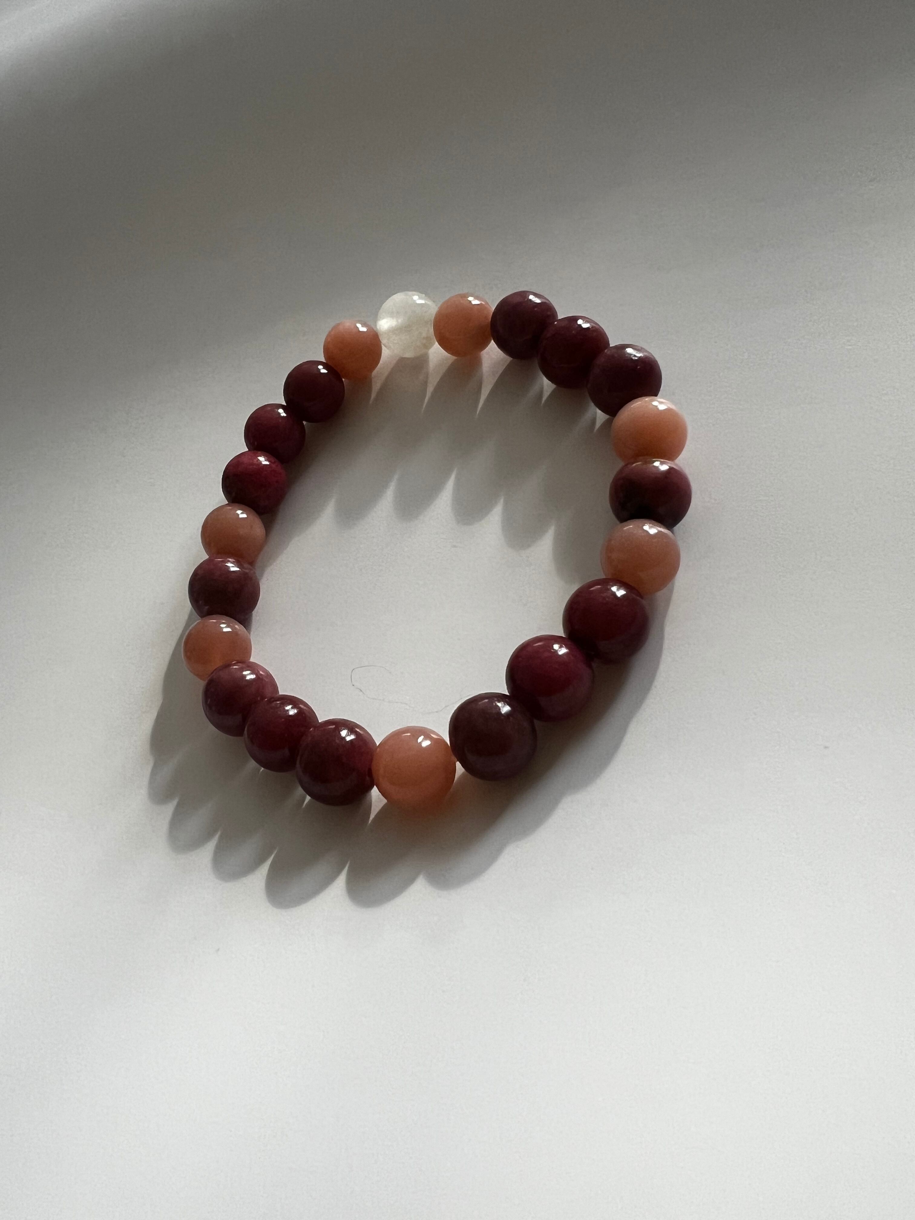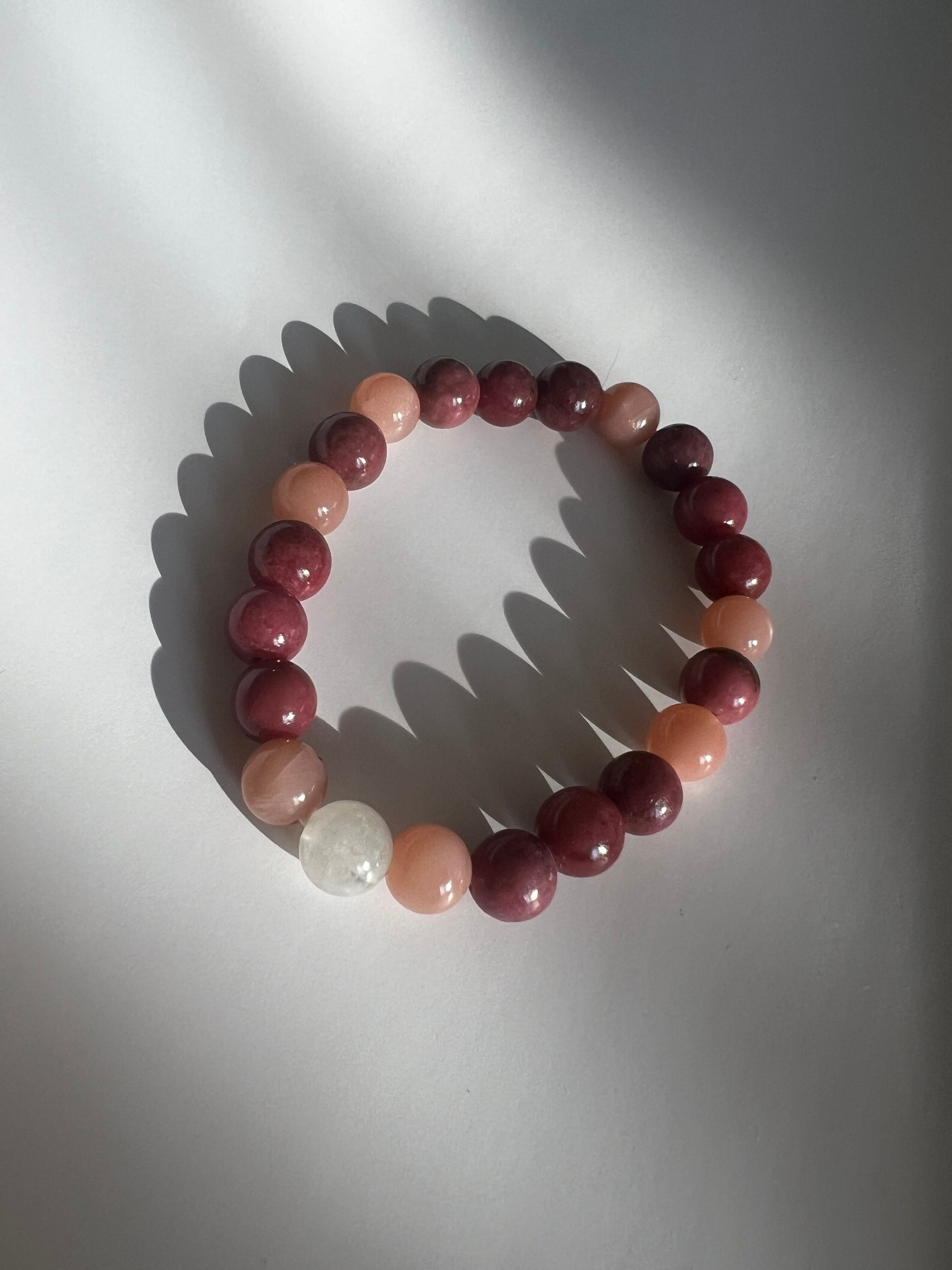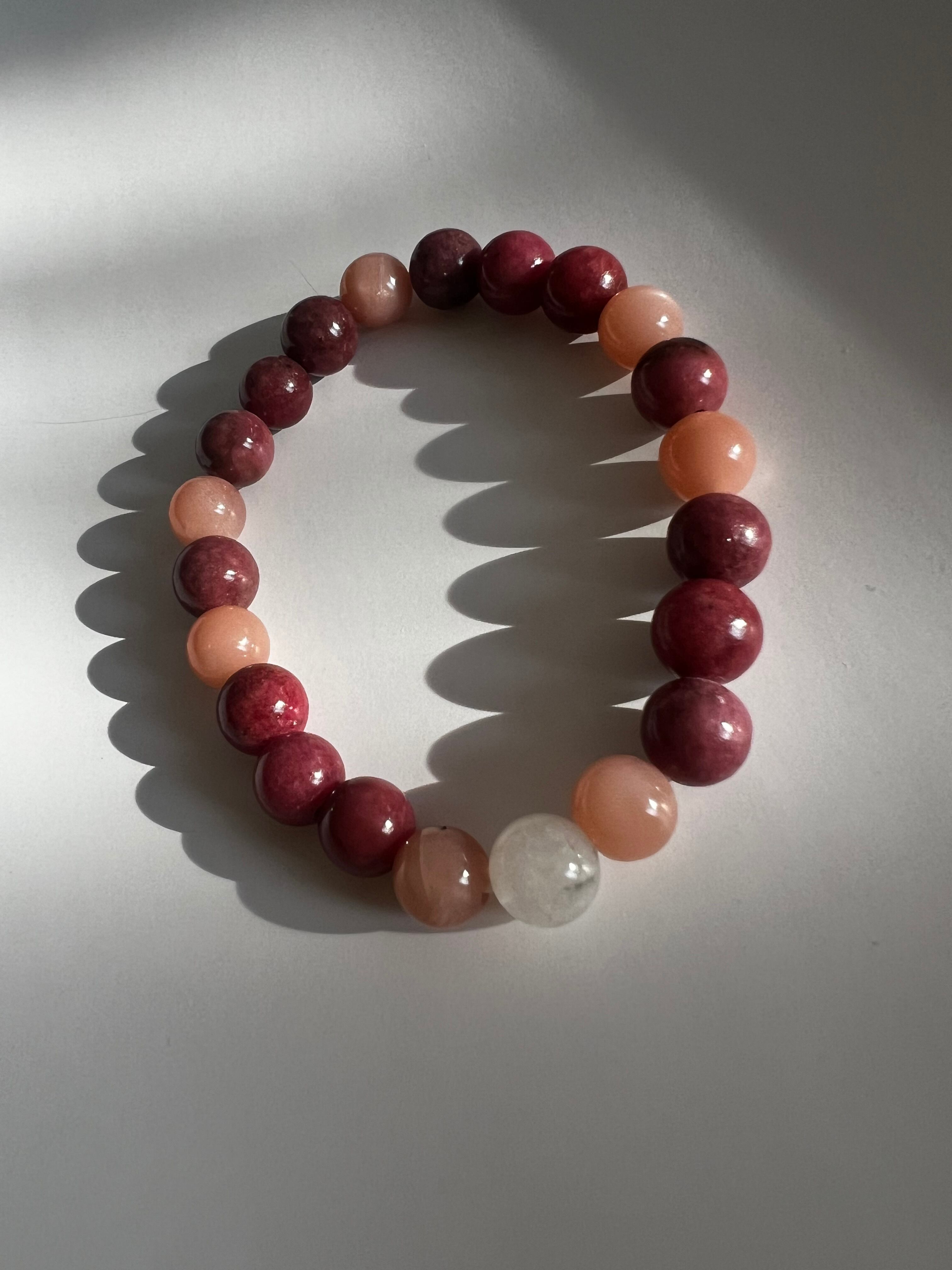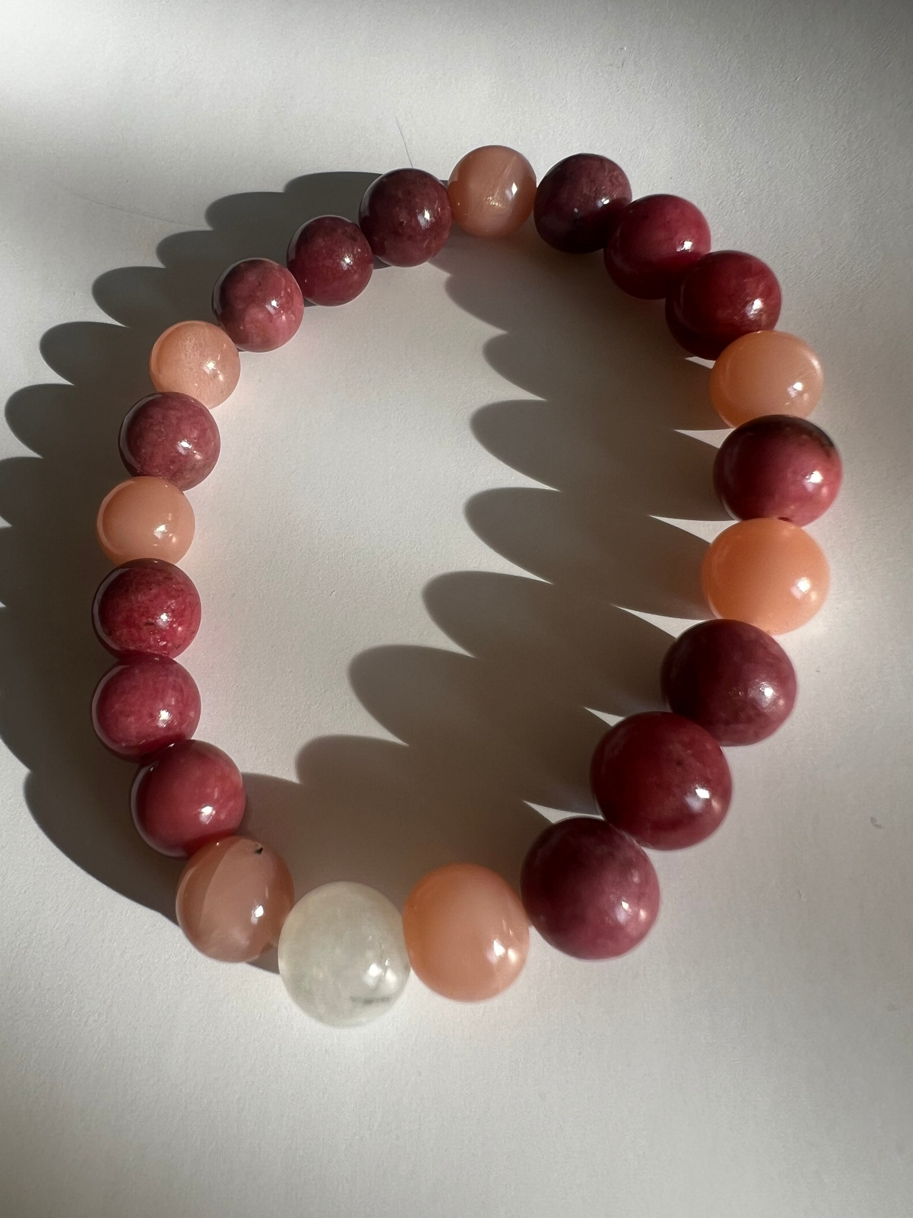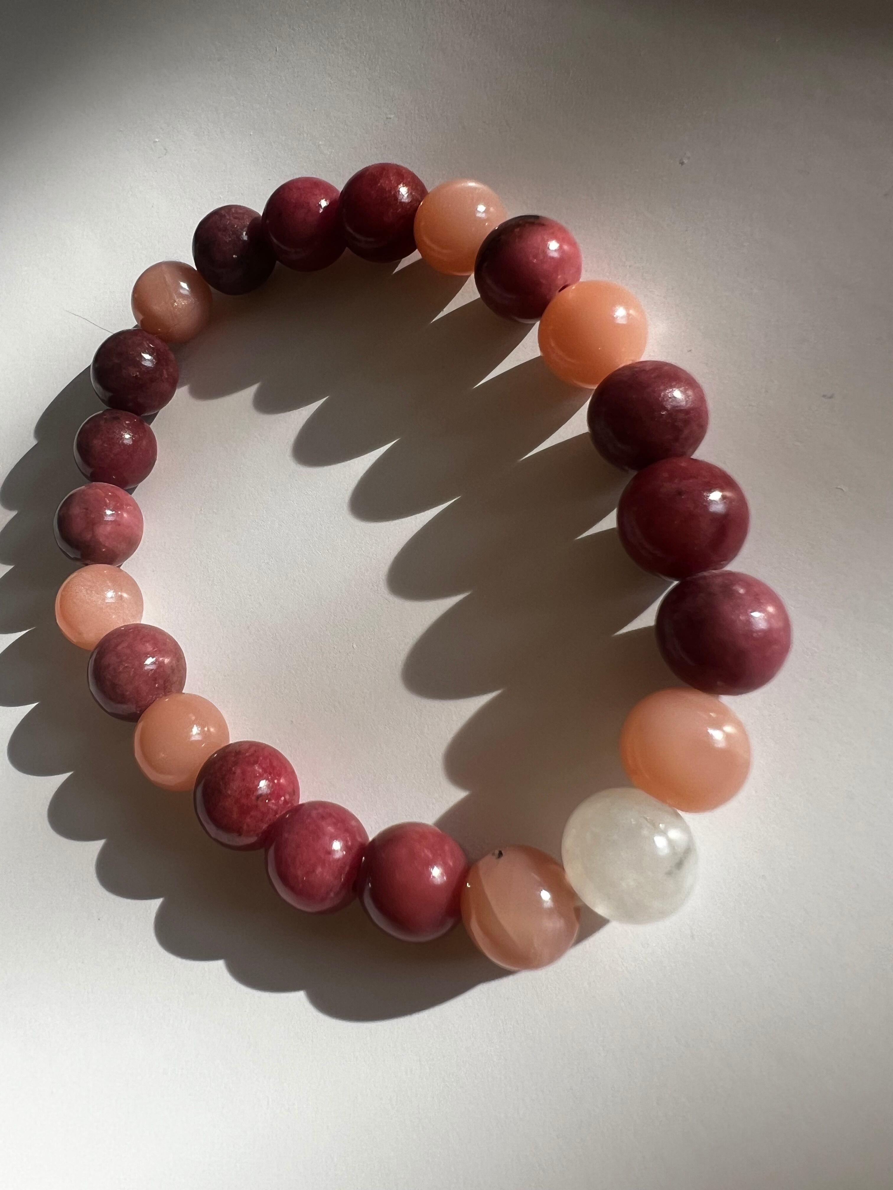 このブレスレットは、愛や感情のサポートを求める方に最適です。ロードナイトの愛情、ピーチムーンストーンの安らぎ、そしてムーンストーンの直感力が、あなたの日常に幸福と平穏をもたらすことでしょう!