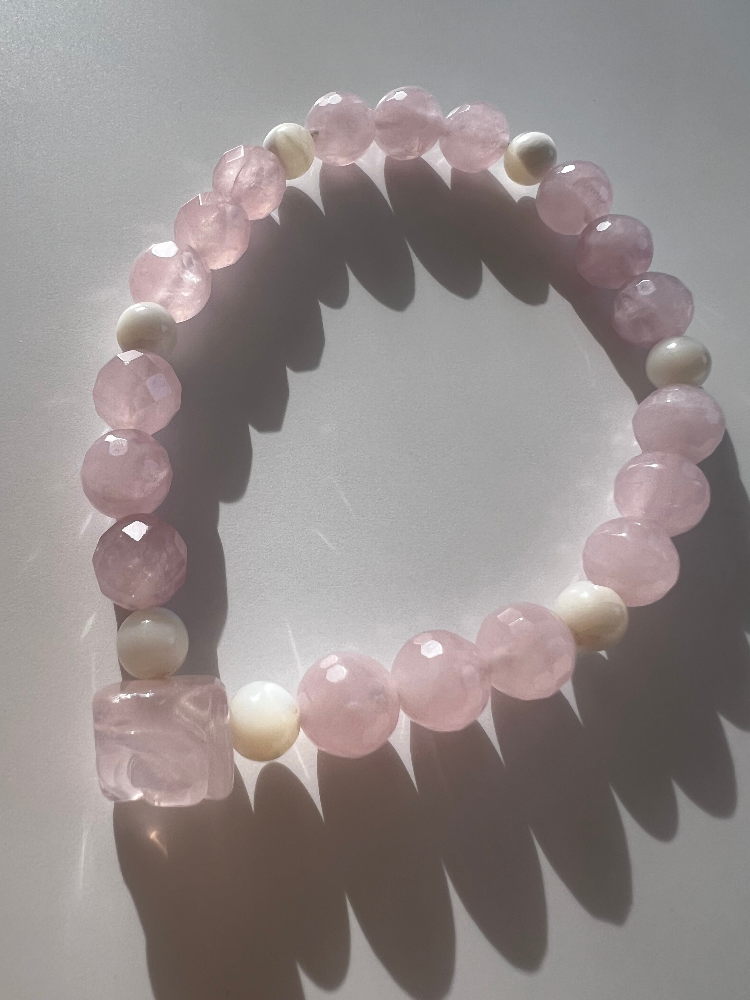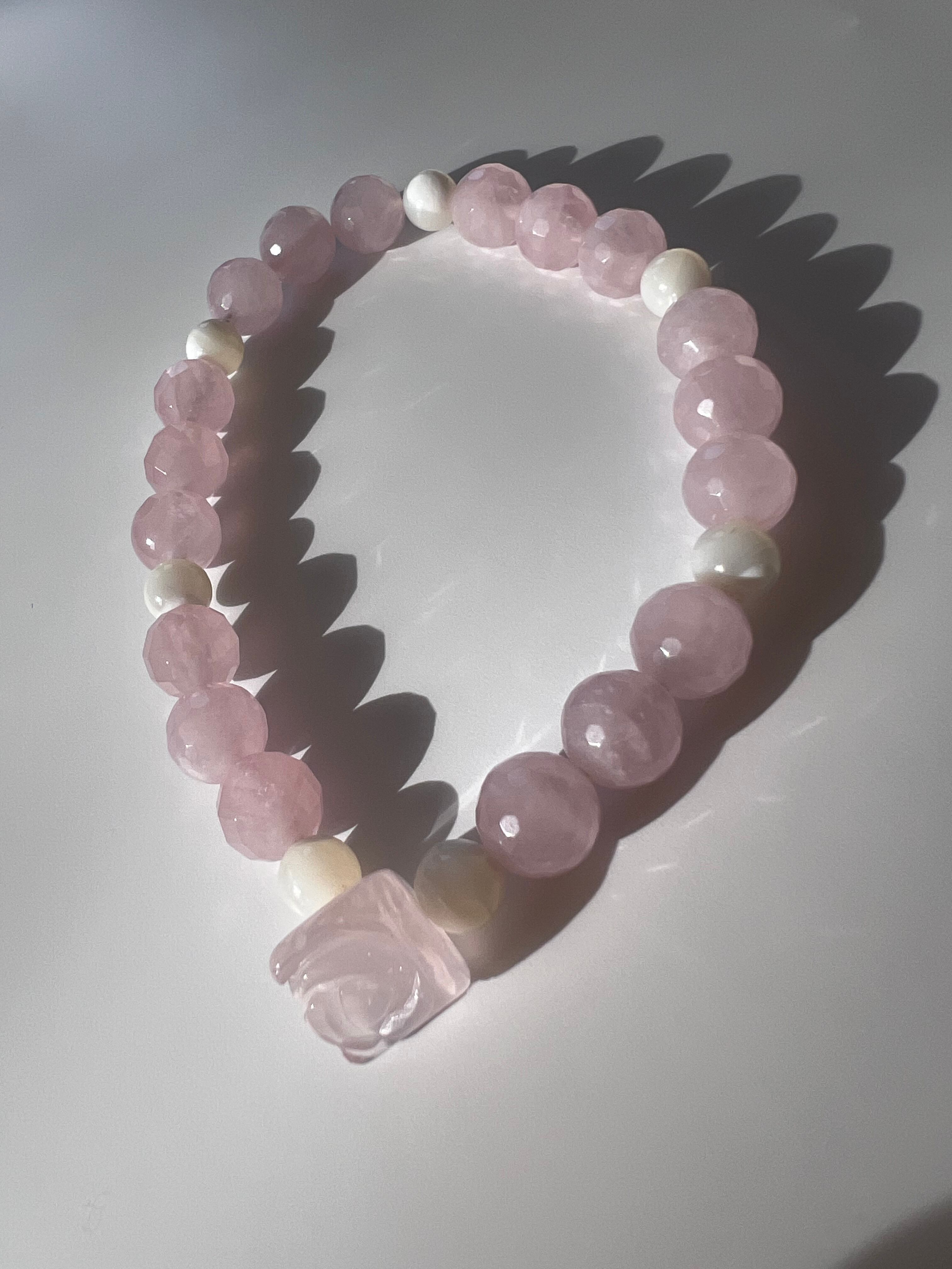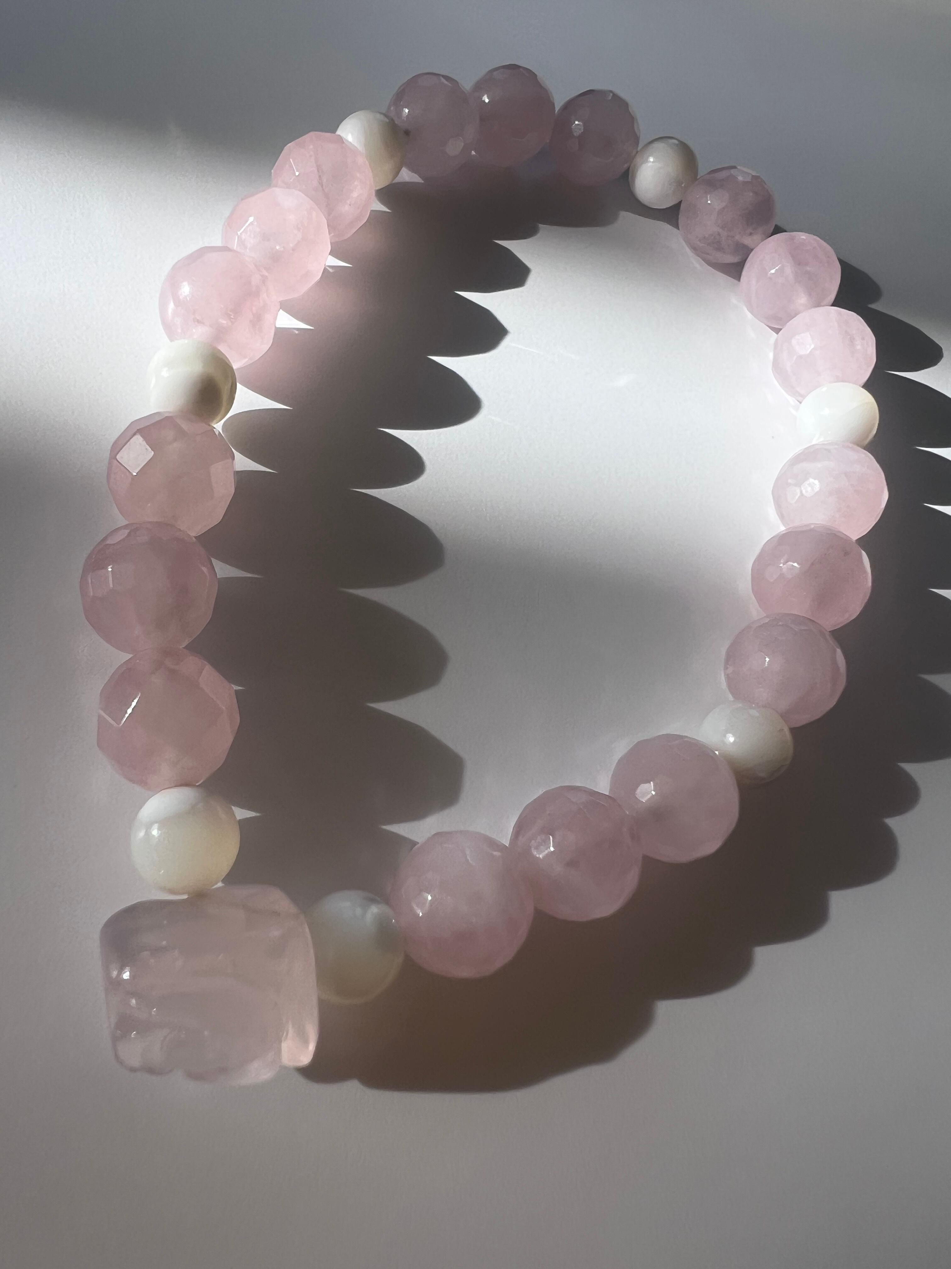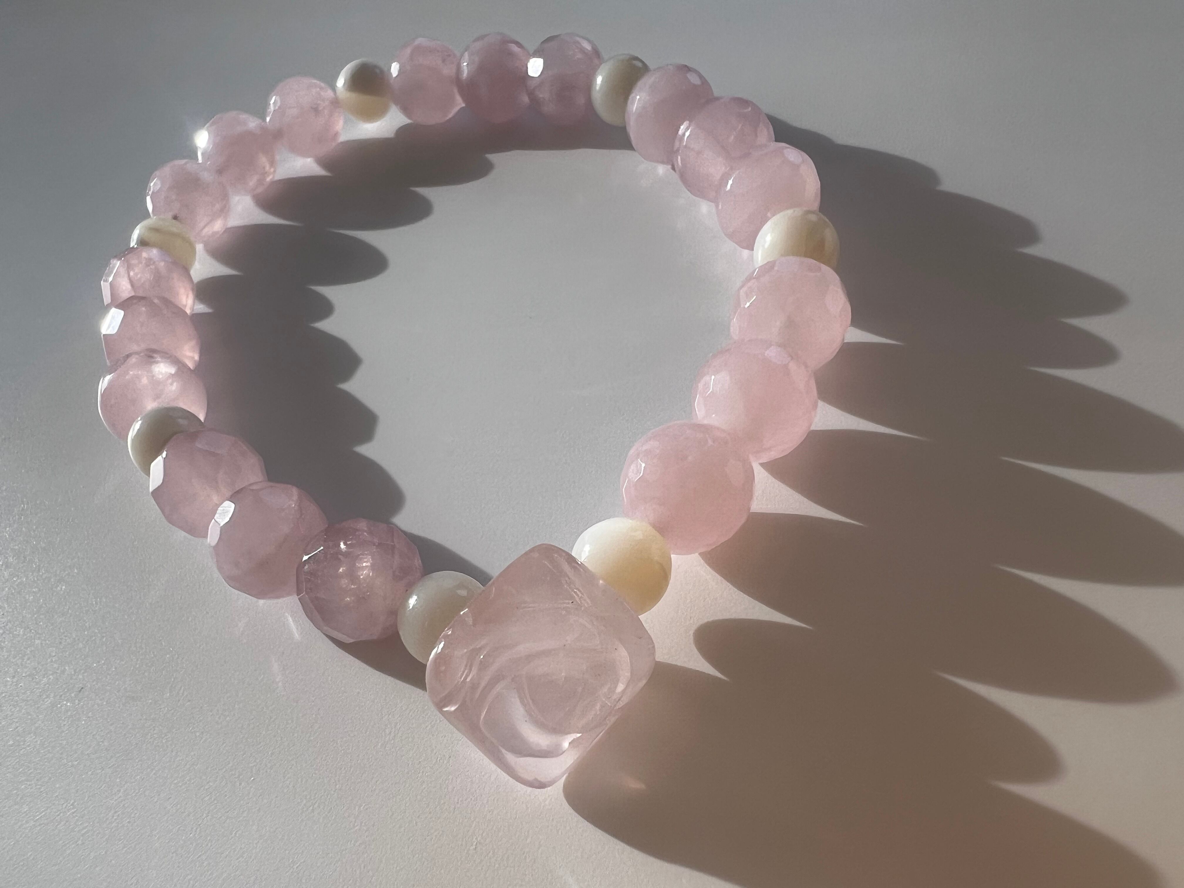 このブレスレットは、愛や人間関係の改善を望む方に最適です。薔薇カットローズクォーツの優しさ、マザーオブパールの安心感、そしてカットローズクォーツの幸福感が、あなたの日常に明るさと温もりをもたらすことでしょう!