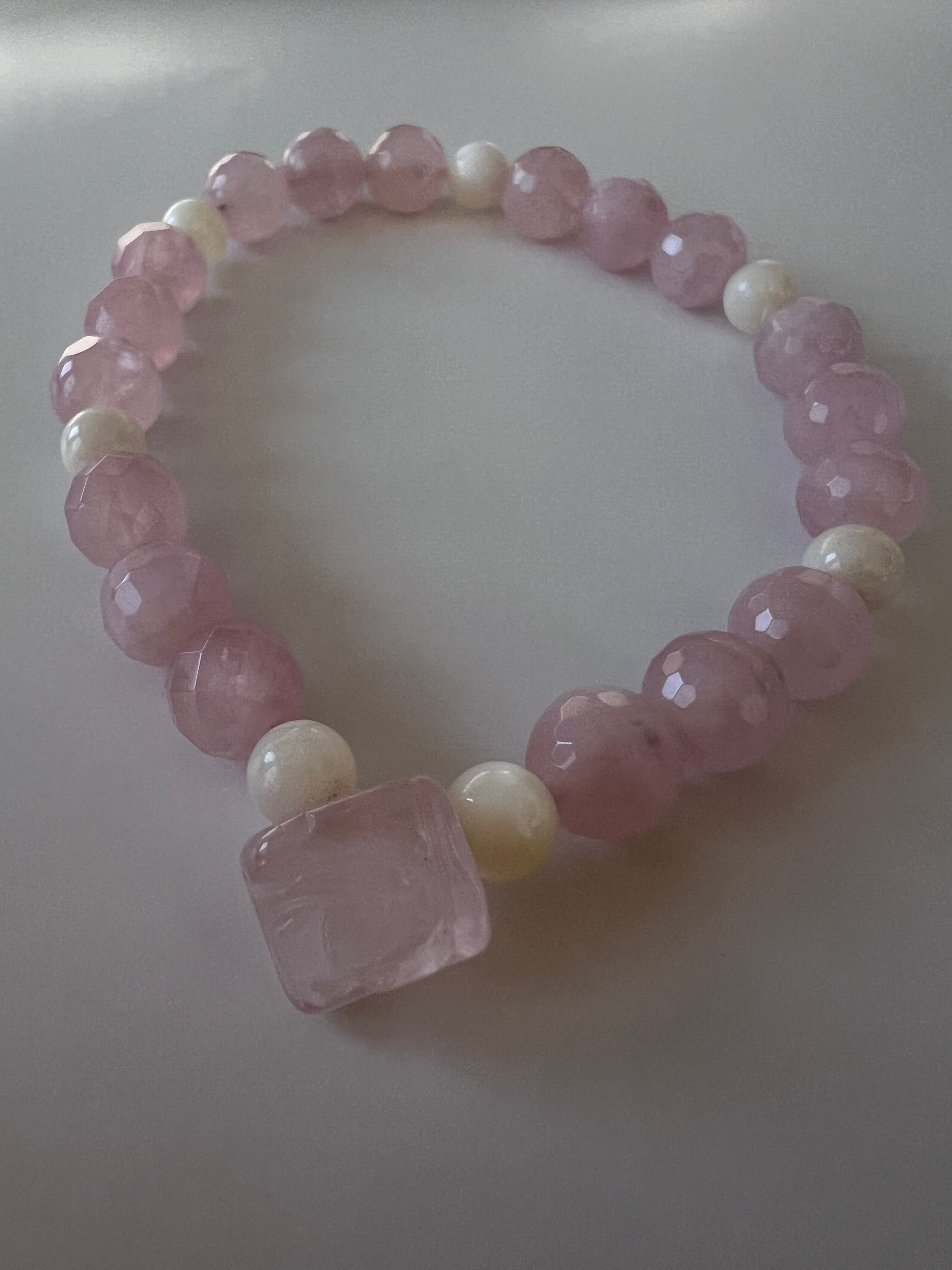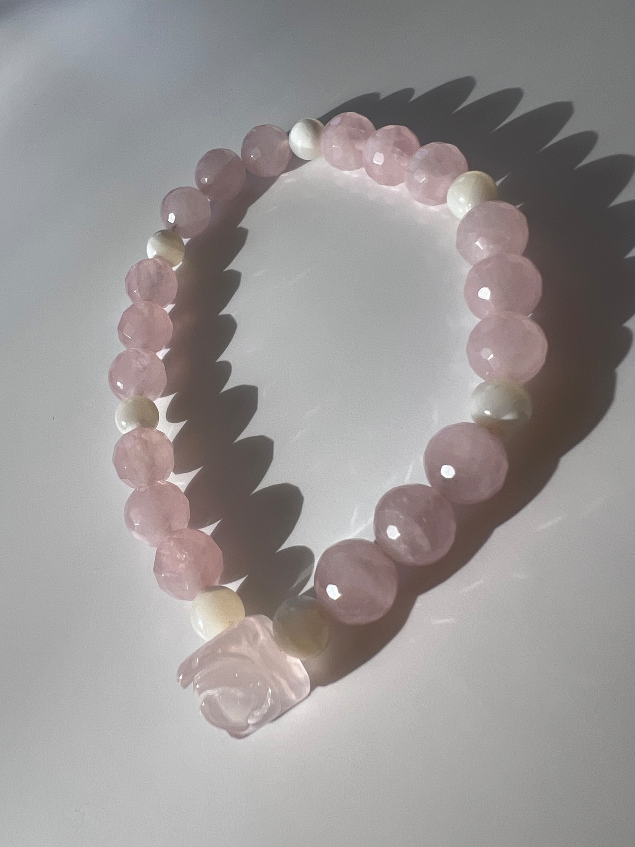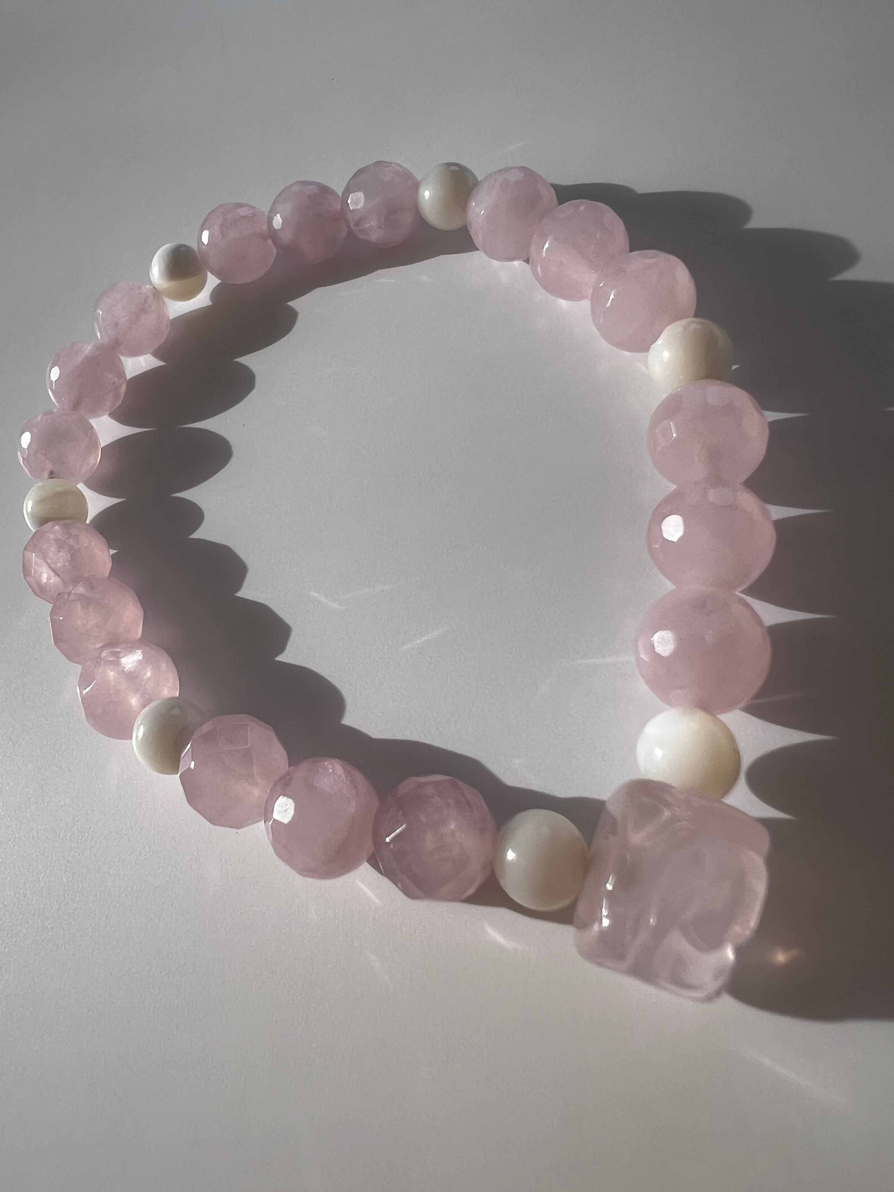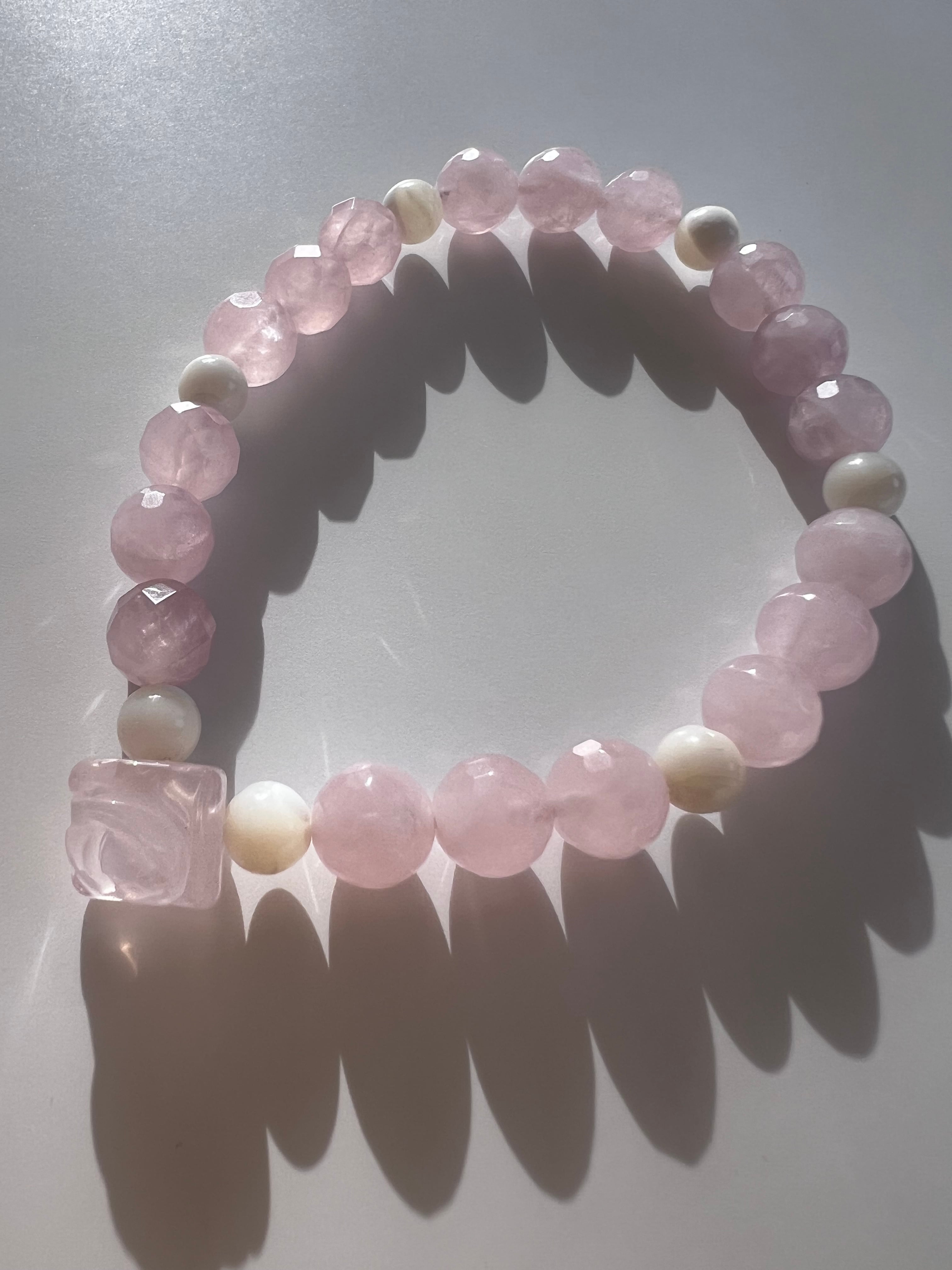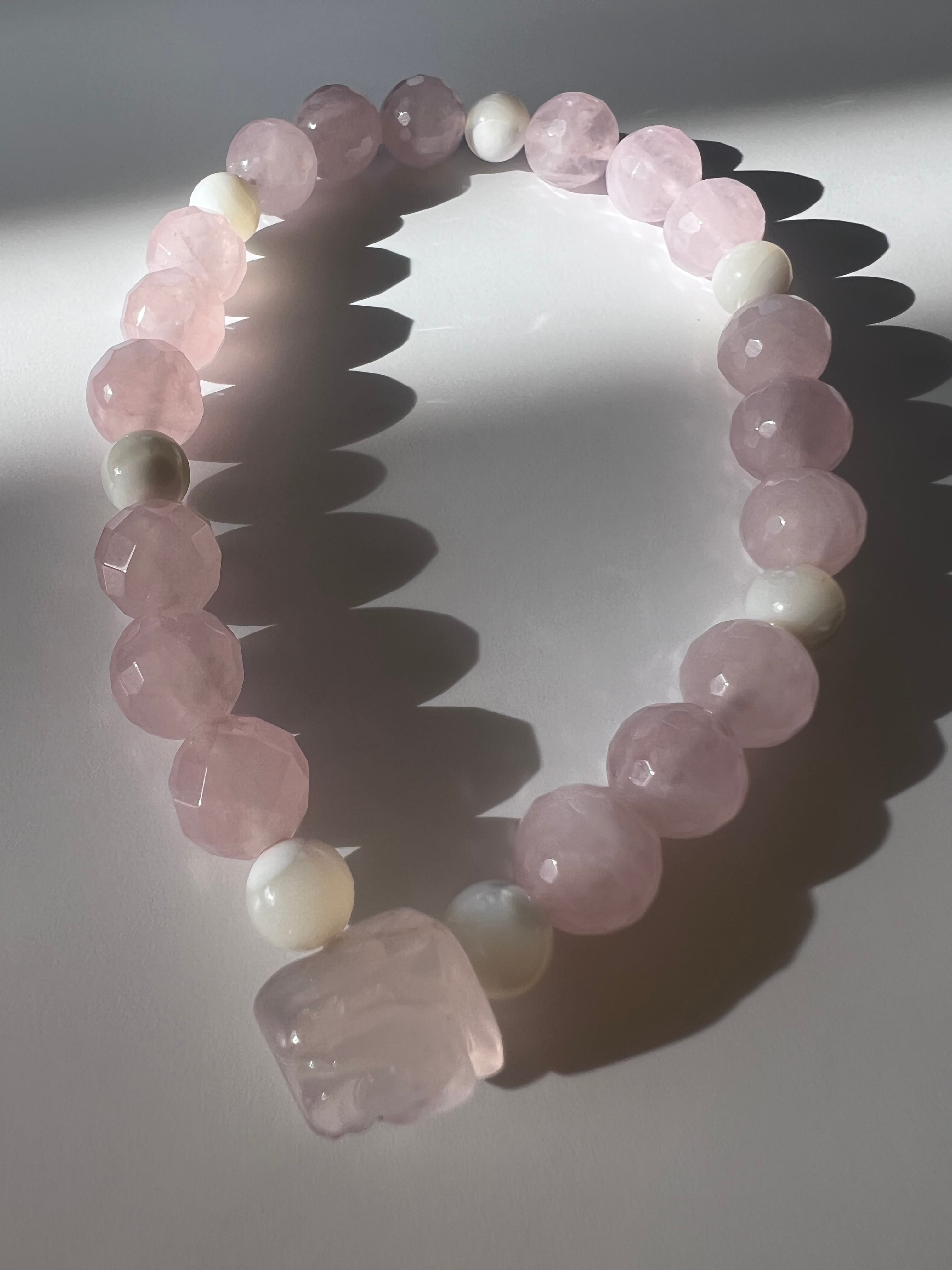このブレスレットは、愛や人間関係の改善を望む方に最適です。薔薇カットローズクォーツの優しさ、マザーオブパールの安心感、そしてカットローズクォーツの幸福感が、あなたの日常に明るさと温もりをもたらすことでしょう!