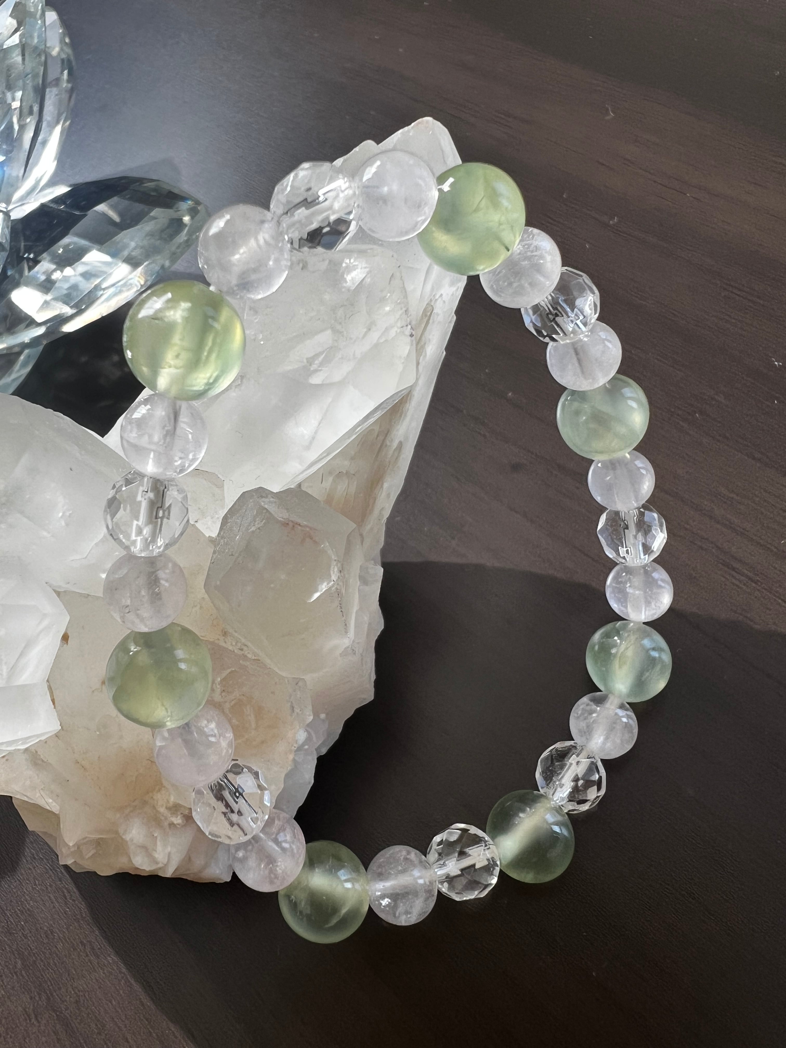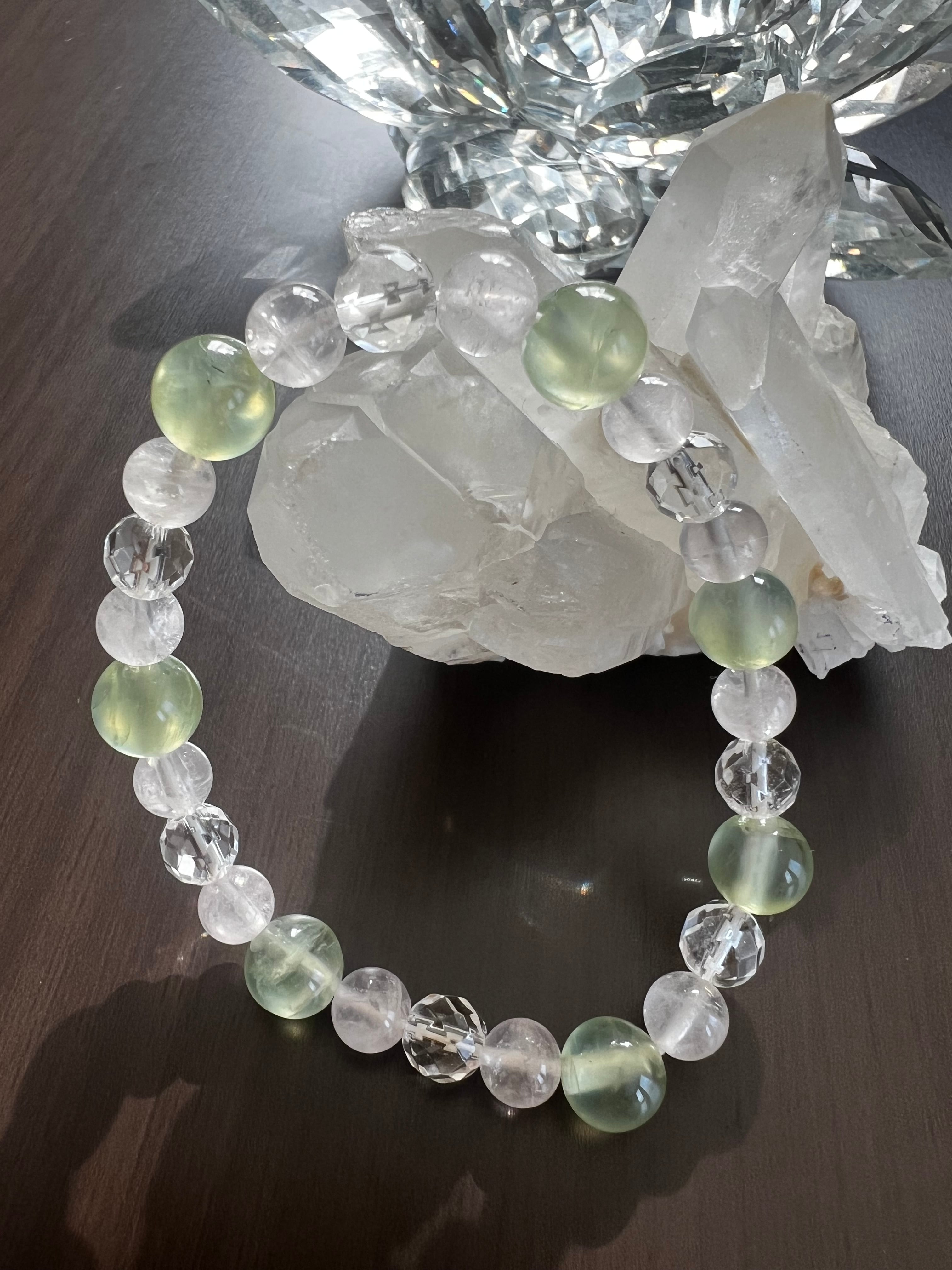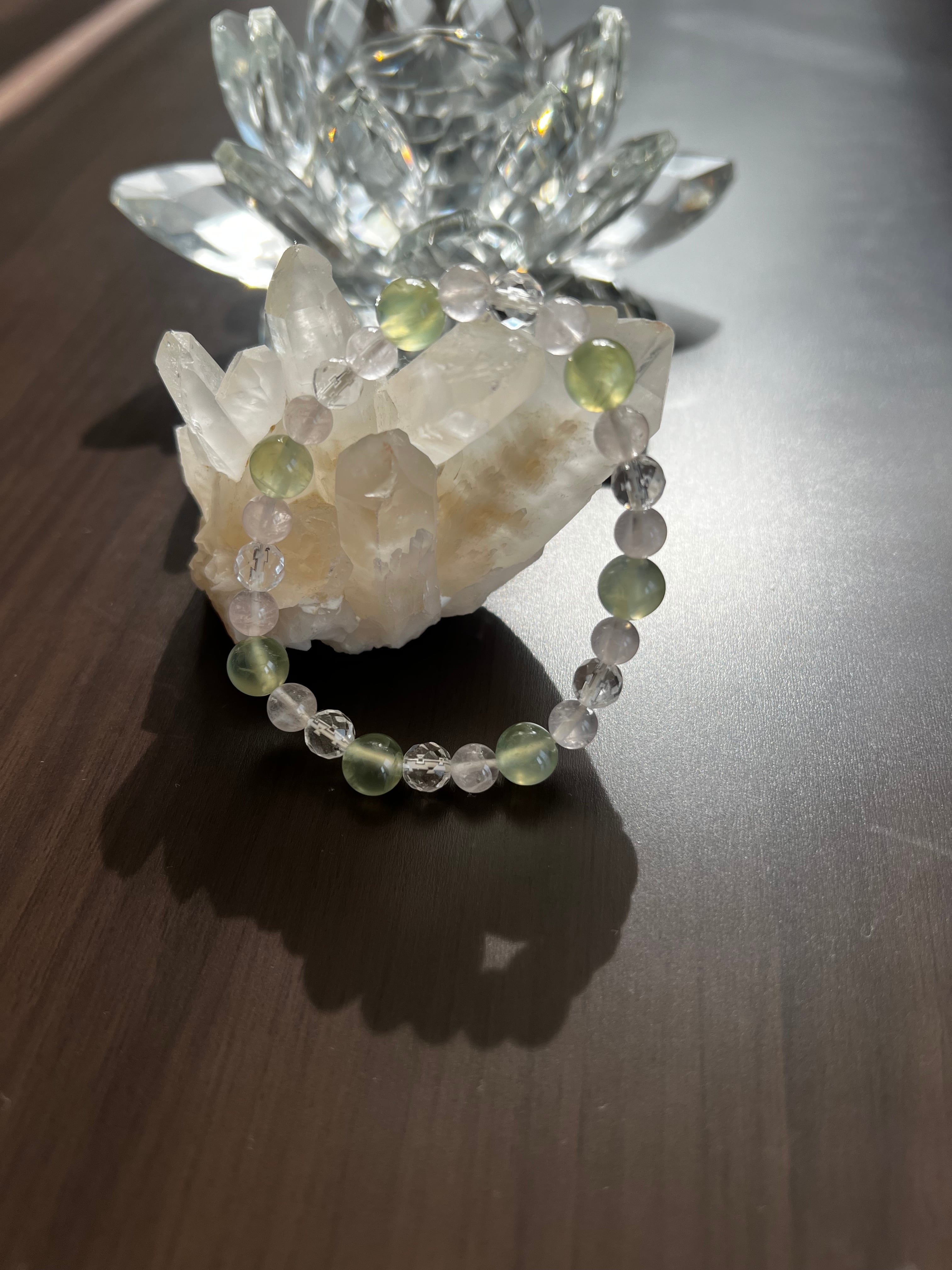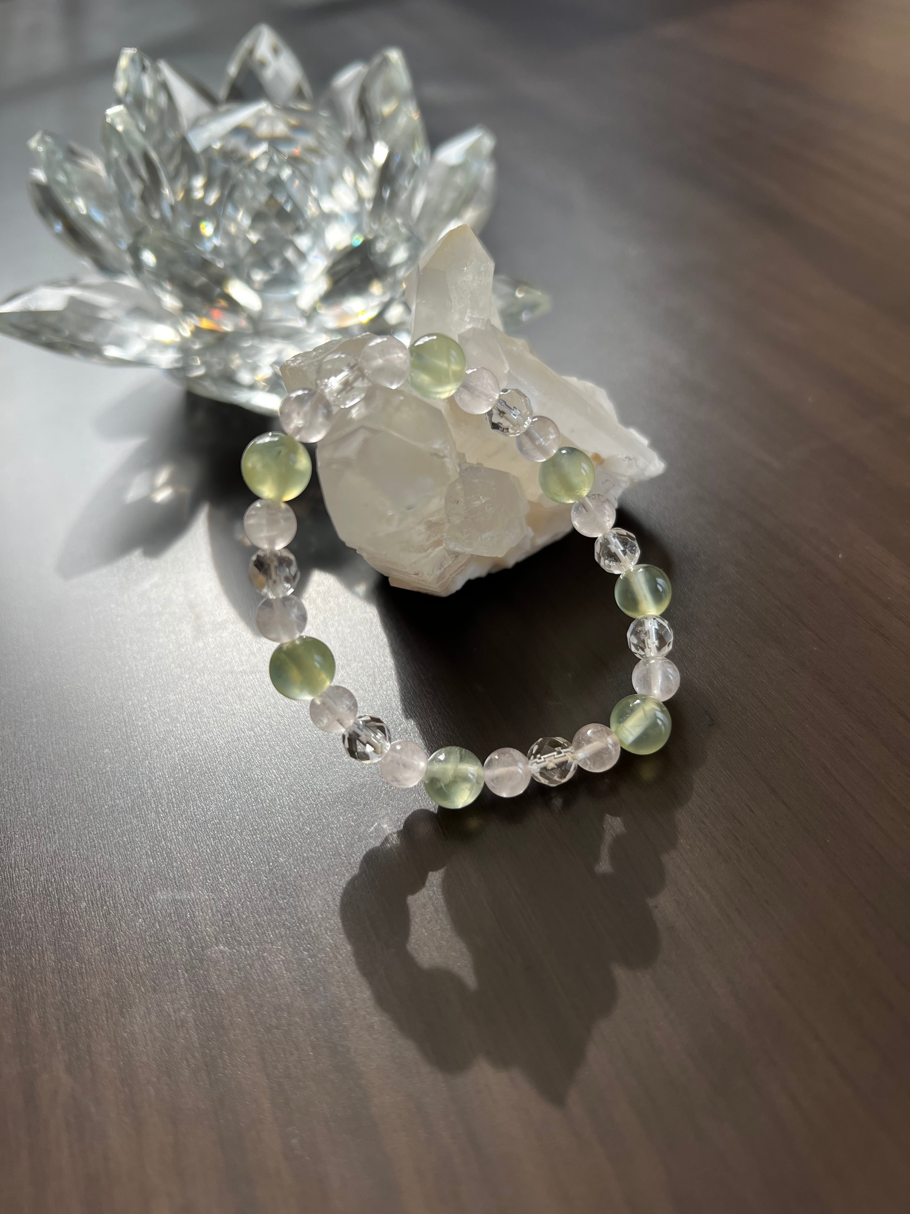 このブレスレットは、心の癒しや愛のエネルギーを求める方に最適です。プレナイトの穏やかさ、ミラーボールカット水晶の煌めき、そしてローズクォーツの優しさが、あなたの日常に明るさと温もりをもたらすことでしょう!