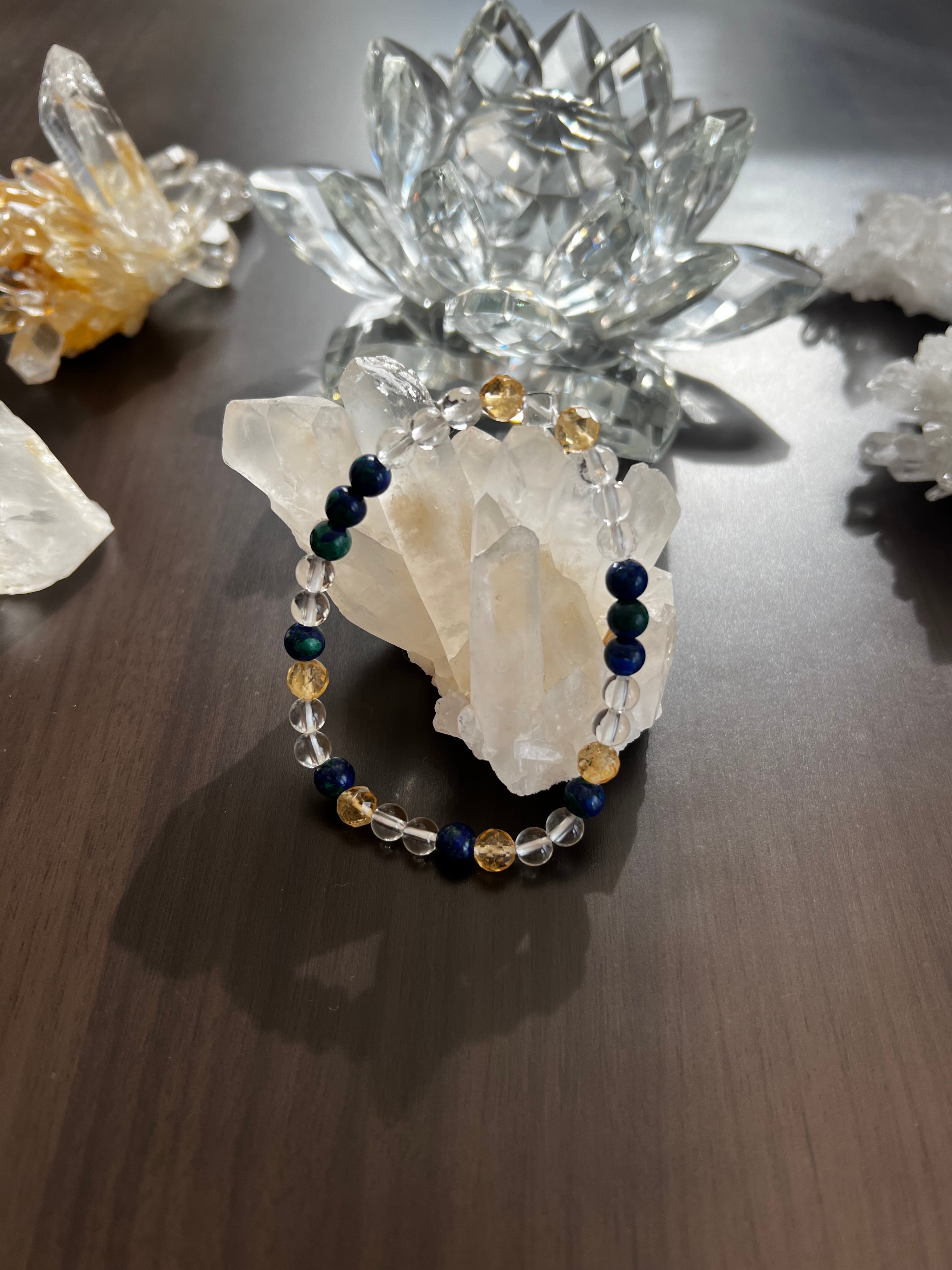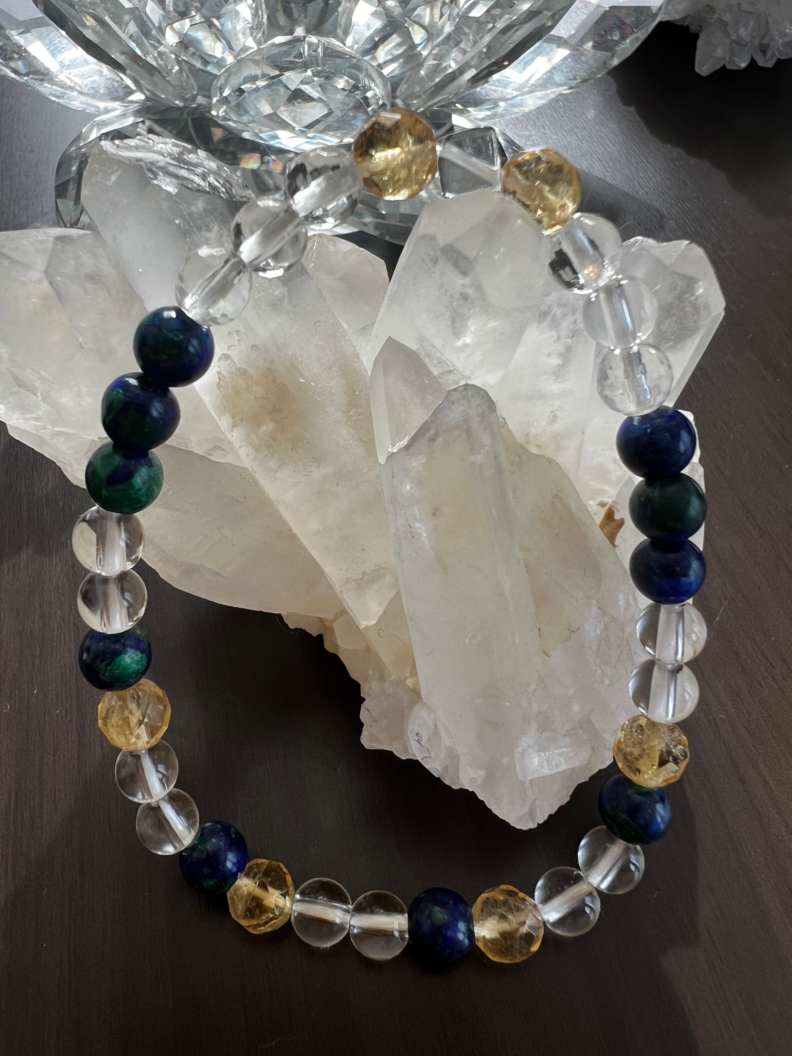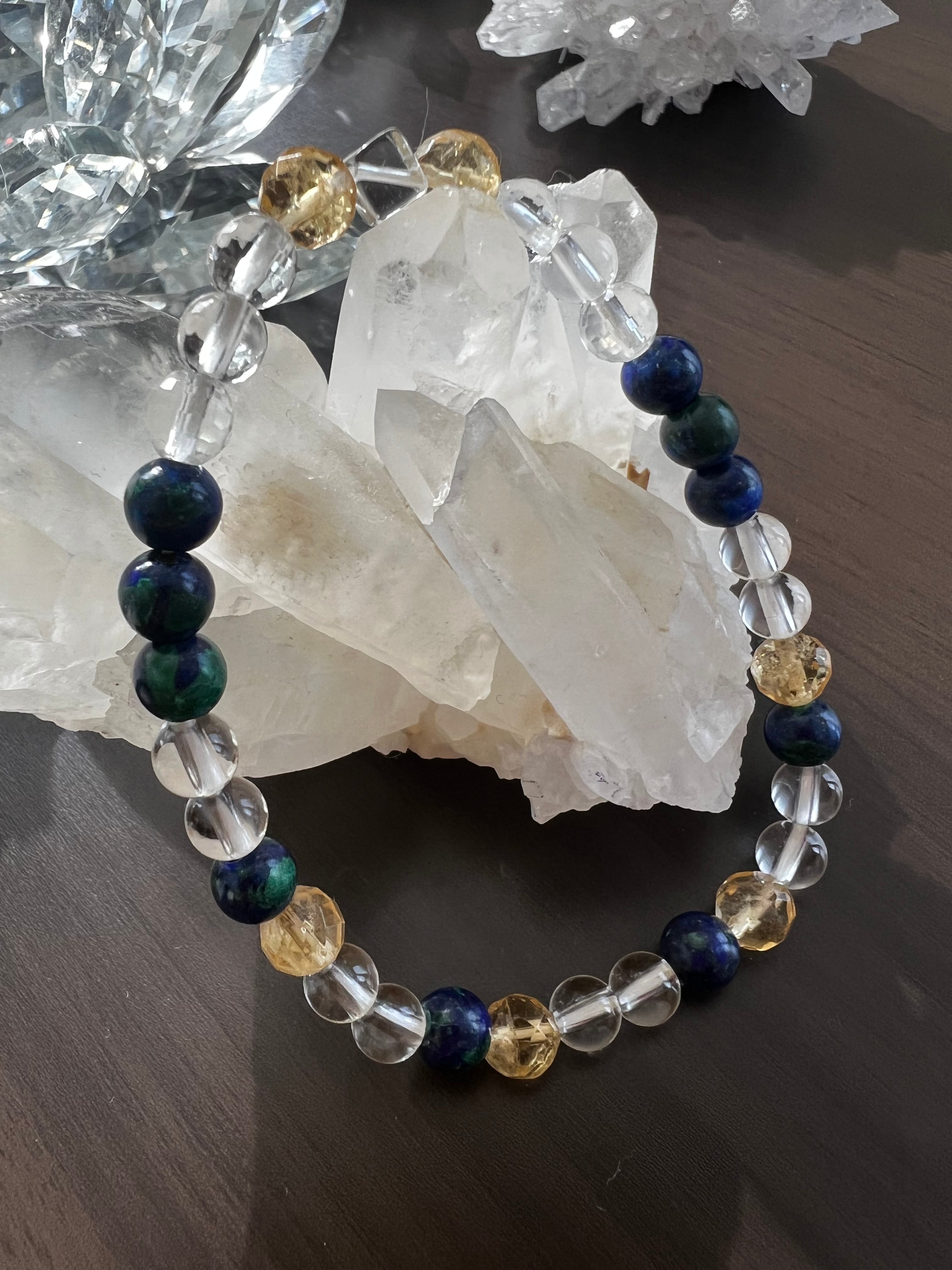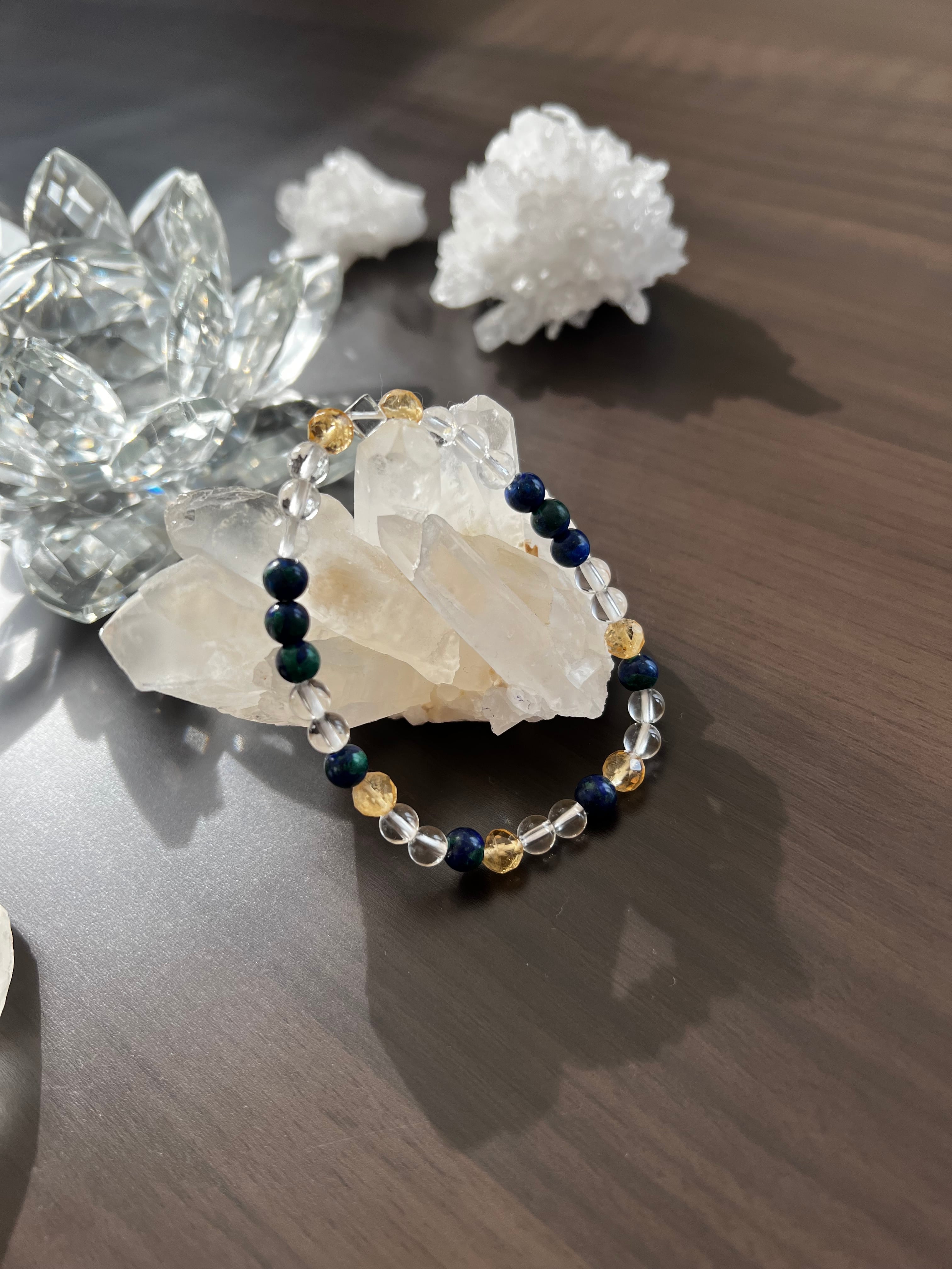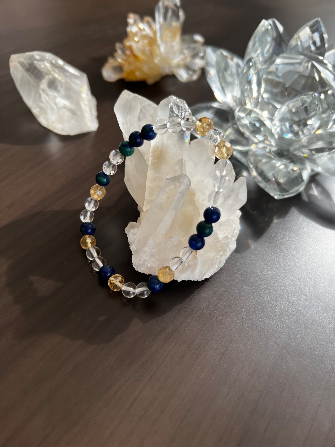 このブレスレットは、内なる成長や豊かさを求める方に最適です。アズライトの深い知恵、ミラーボールカットシトリンの明るさ、そしてミラーボールカット水晶の輝きが、あなたの日常にさらなる幸運と充実感をもたらすことでしょう!