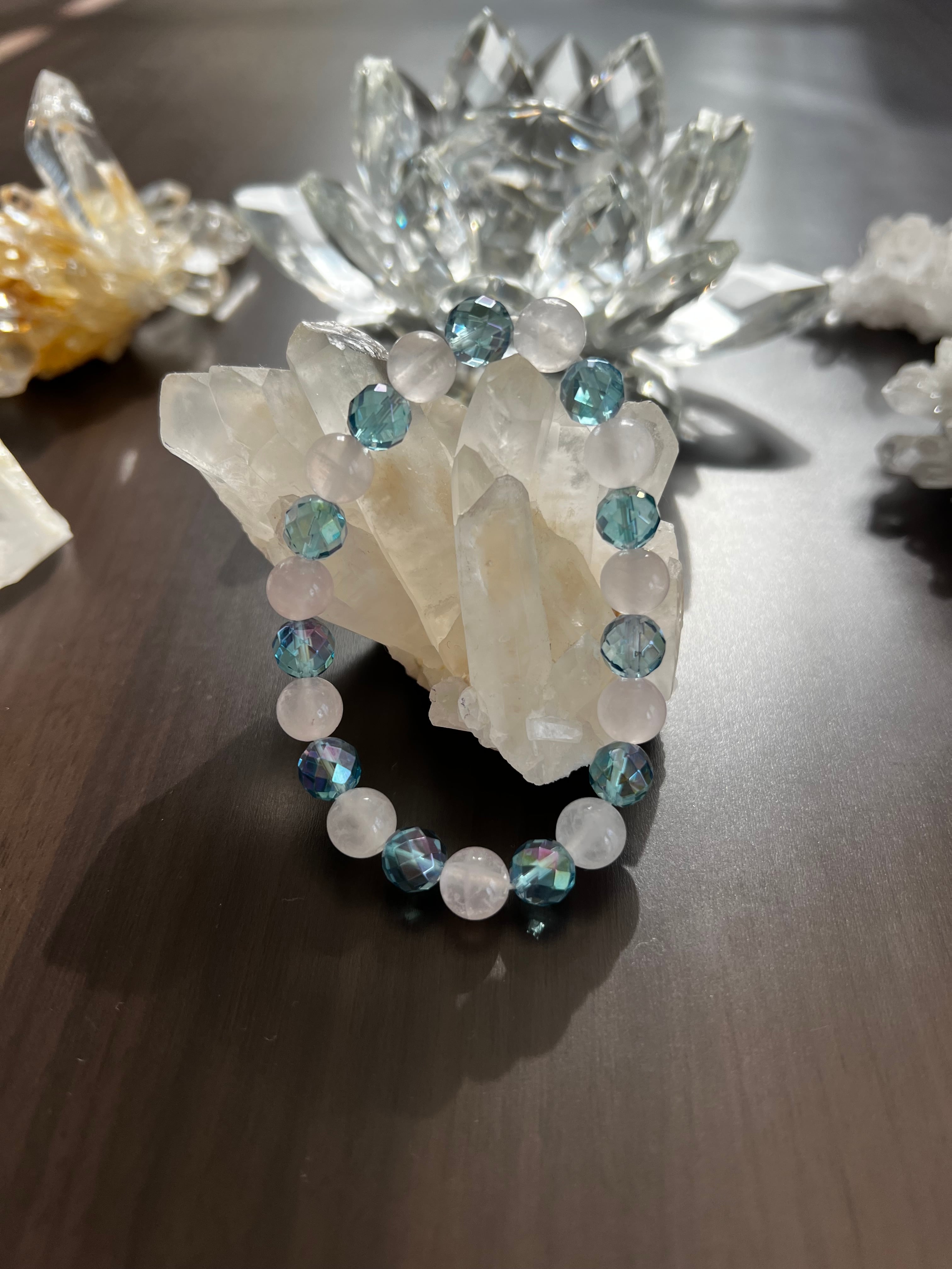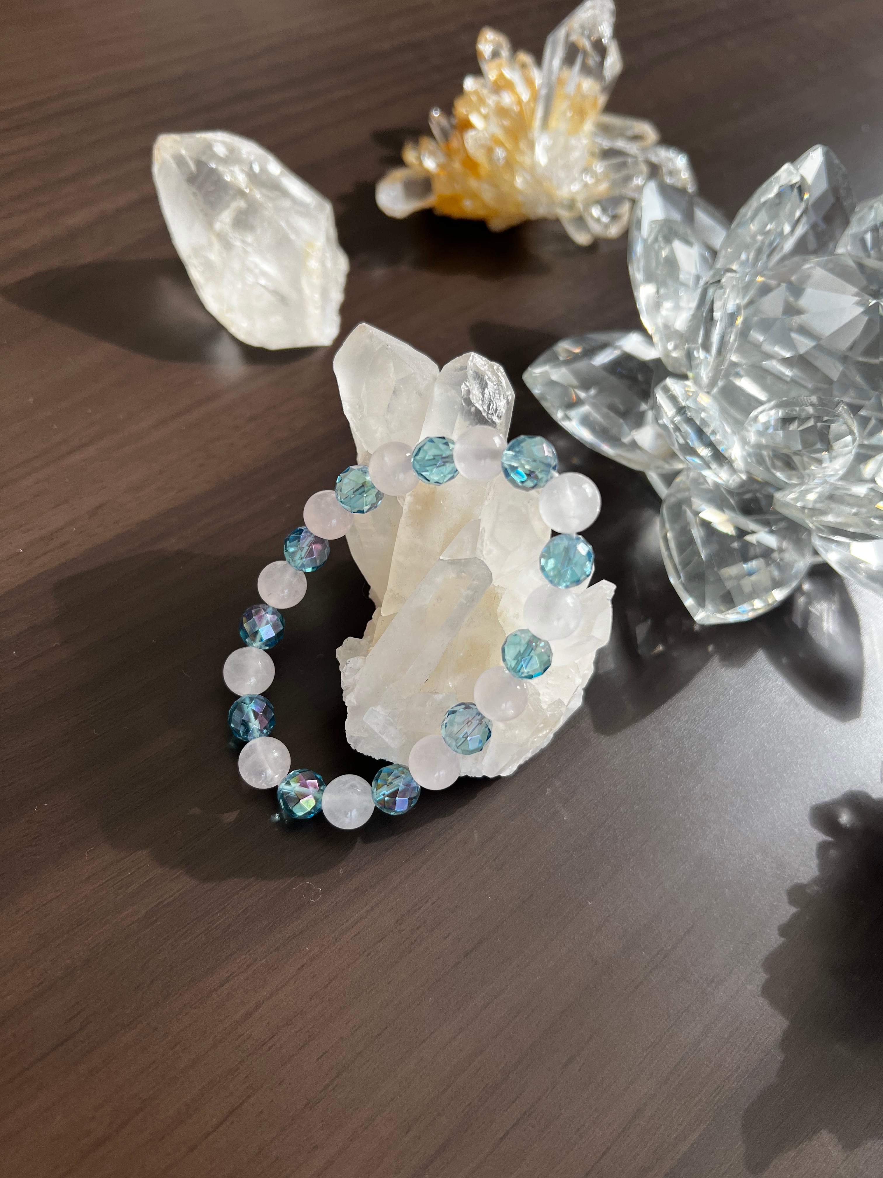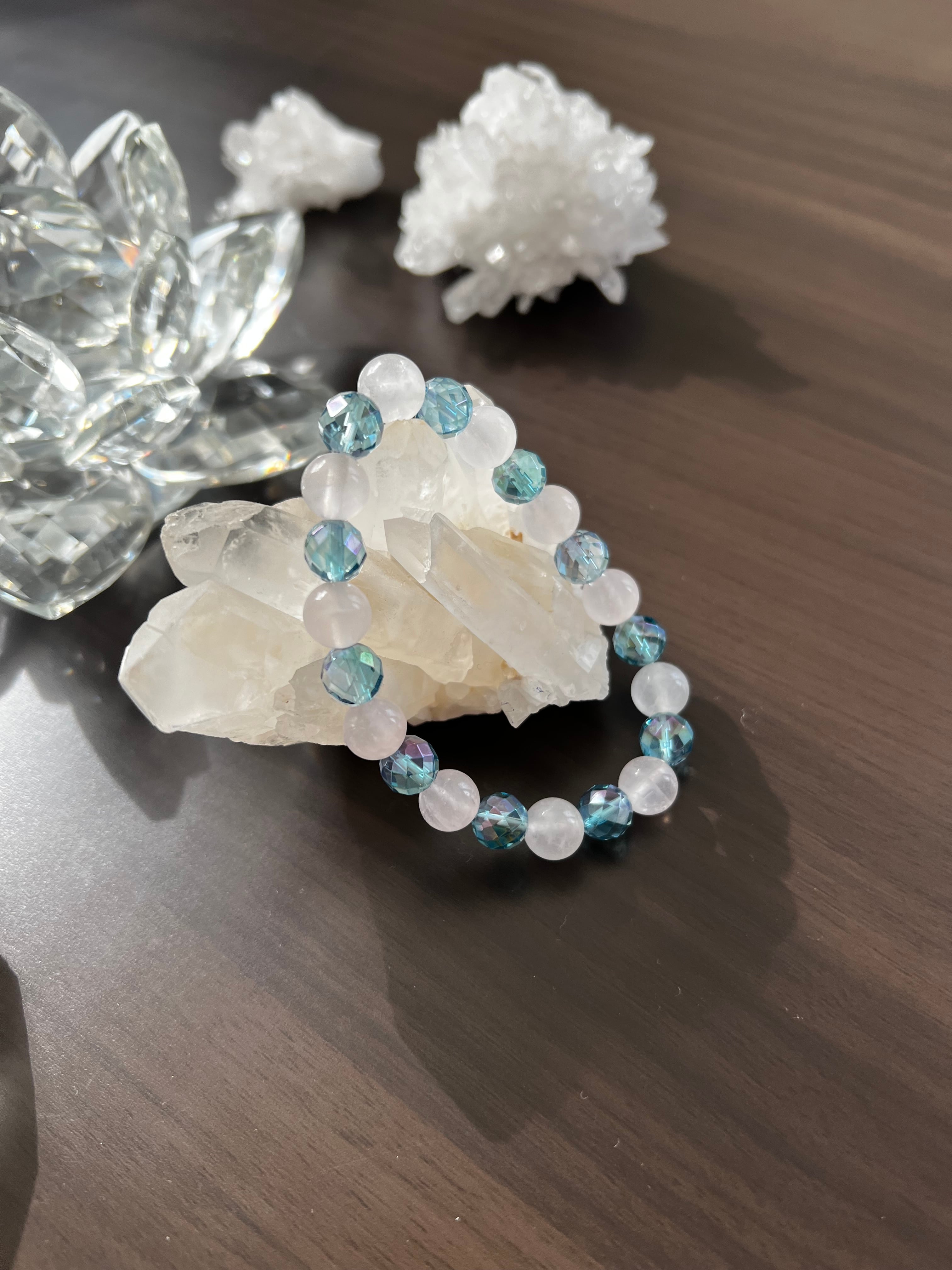 このブレスレットは、愛とコミュニケーションのエネルギーを求める方に最適です。ローズクォーツの優しさとミラーボールカットアクアオーラの清らかさが、あなたの日常にさらなる調和と安らぎをもたらすことでしょう!