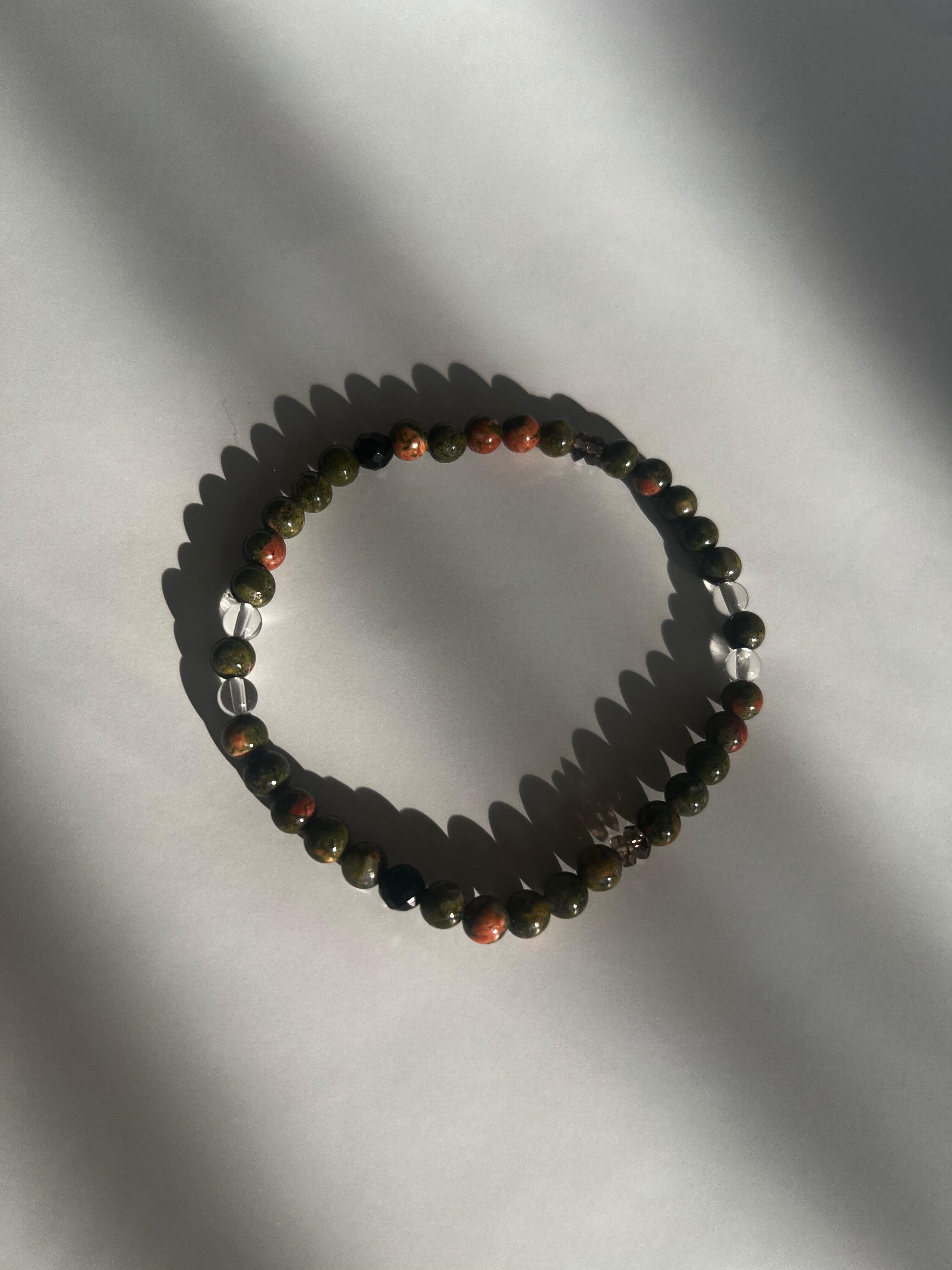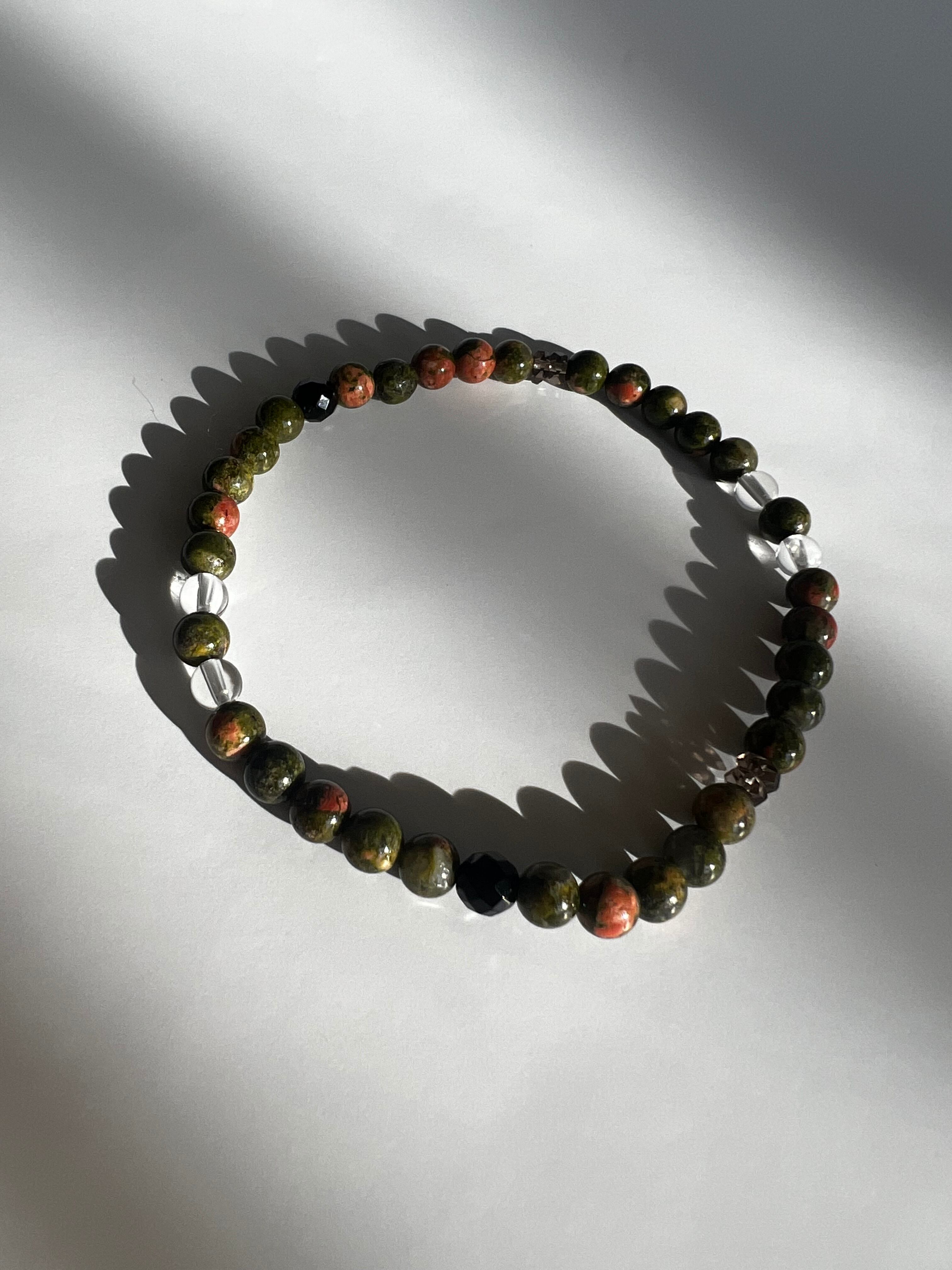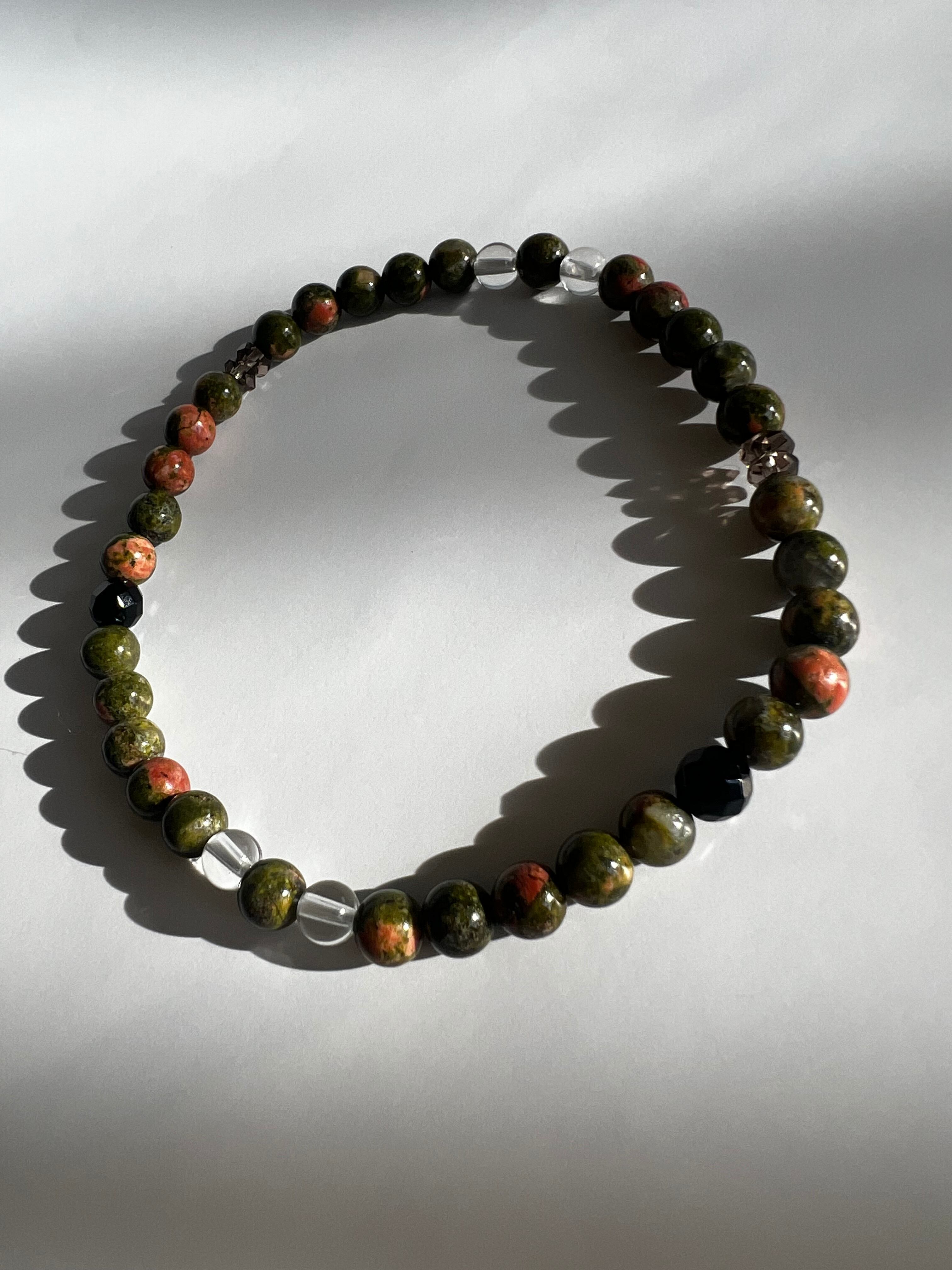 このブレスレットは、心のバランスと活力を求める方に最適です。ユナカイトの安らぎ、カットブラックトルマリンの活力、そしてスモーキークォーツと水晶の浄化作用が、あなたの日常にさらなる調和と幸福をもたらすことでしょう!