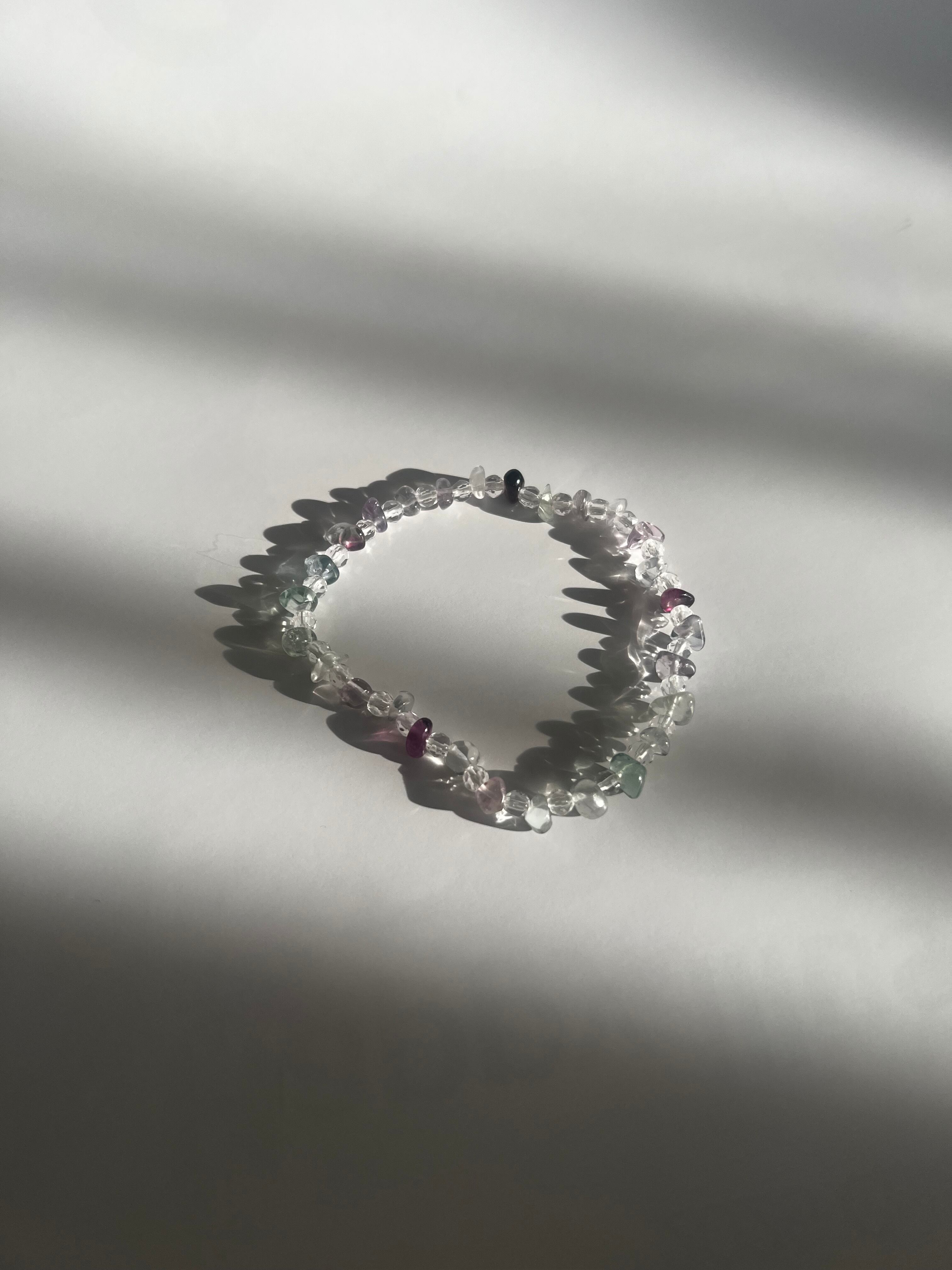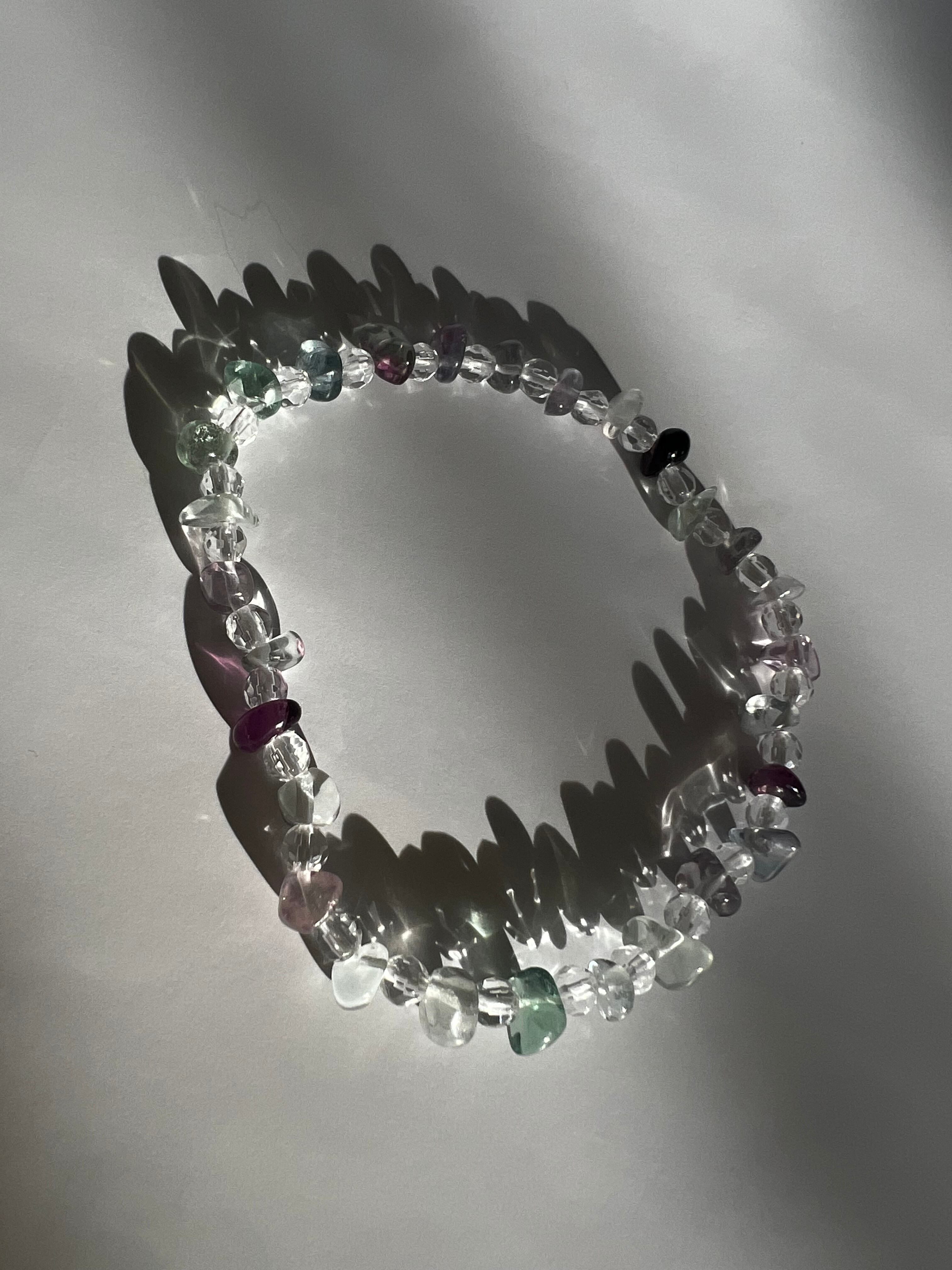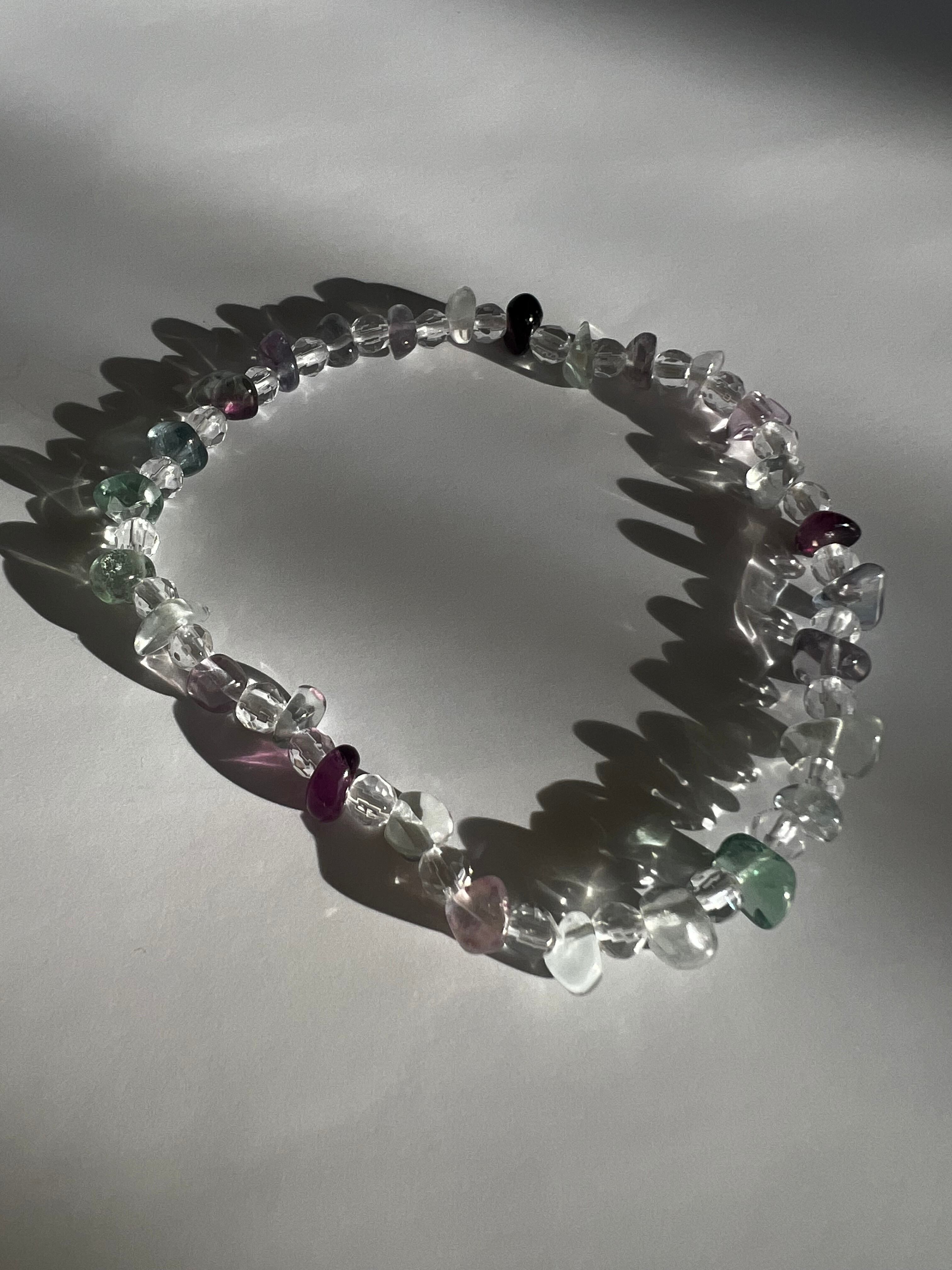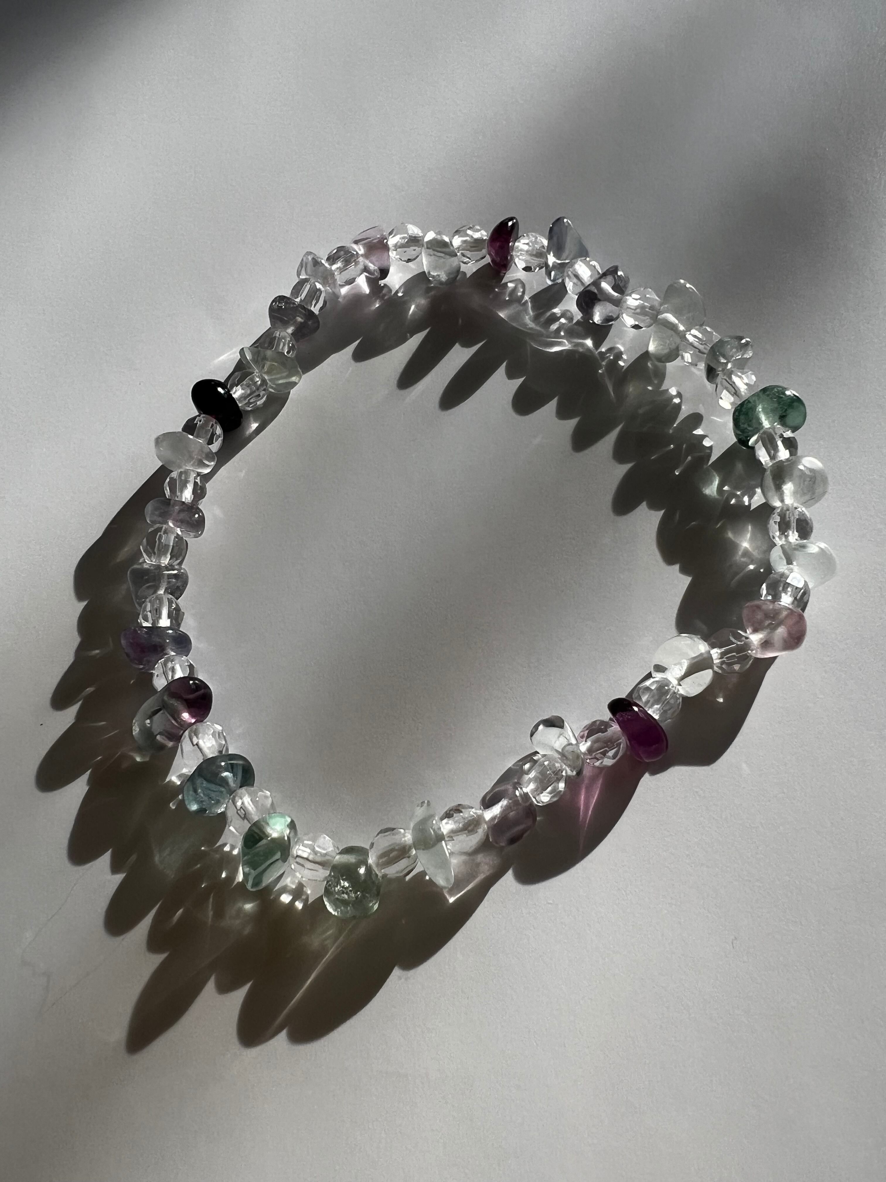 このブレスレットは、集中力とクリエイティブなエネルギーを求める方に最適です。さざれカットフローライトの多彩な色彩とカット水晶の浄化作用が、あなたの日常にさらなるインスピレーションと心の平穏をもたらすことでしょう!