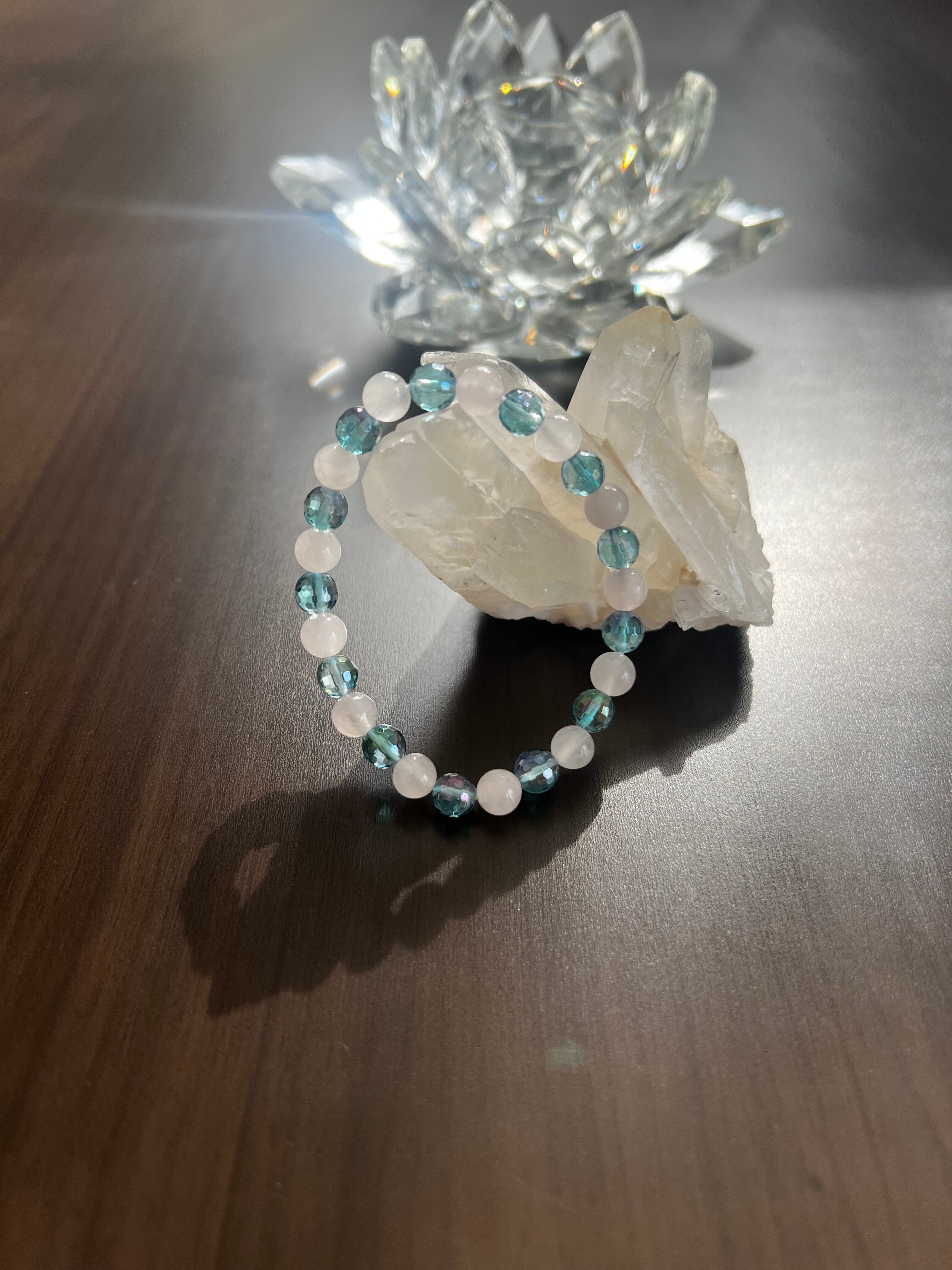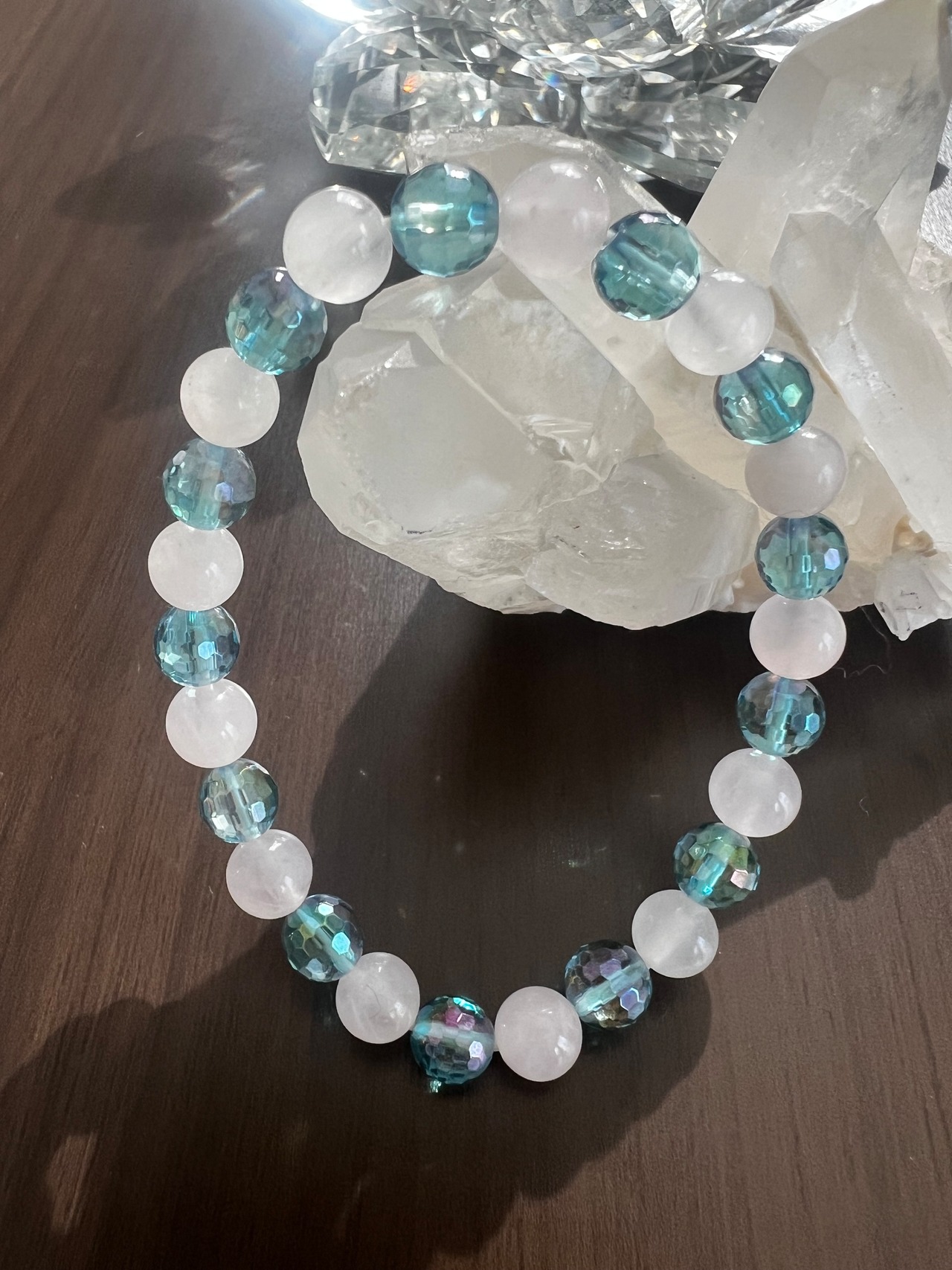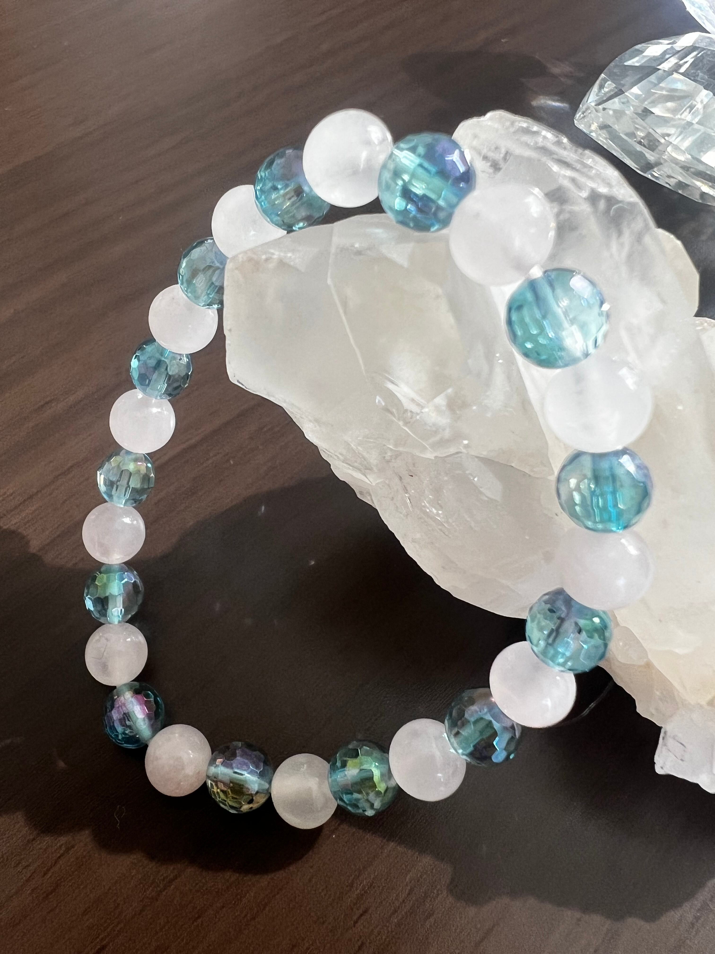 このブレスレットは、愛や平安、そして心のクリアさを求める方に最適です。ミラーボールカットアクアオーラの幸運を引き寄せる力、ローズクォーツの癒し、あなたの日常にさらなる幸福と安定をもたらすことでしょう!
