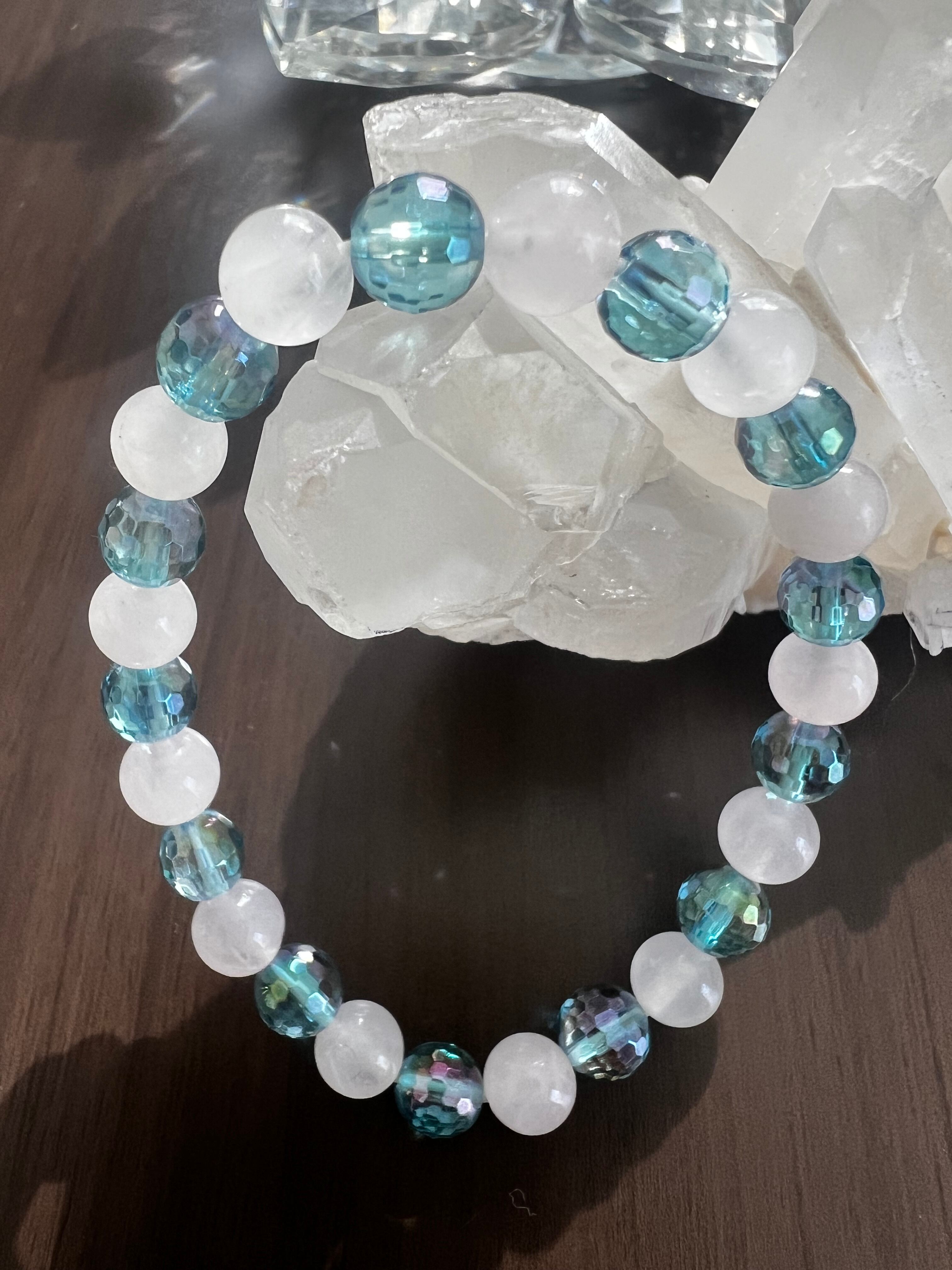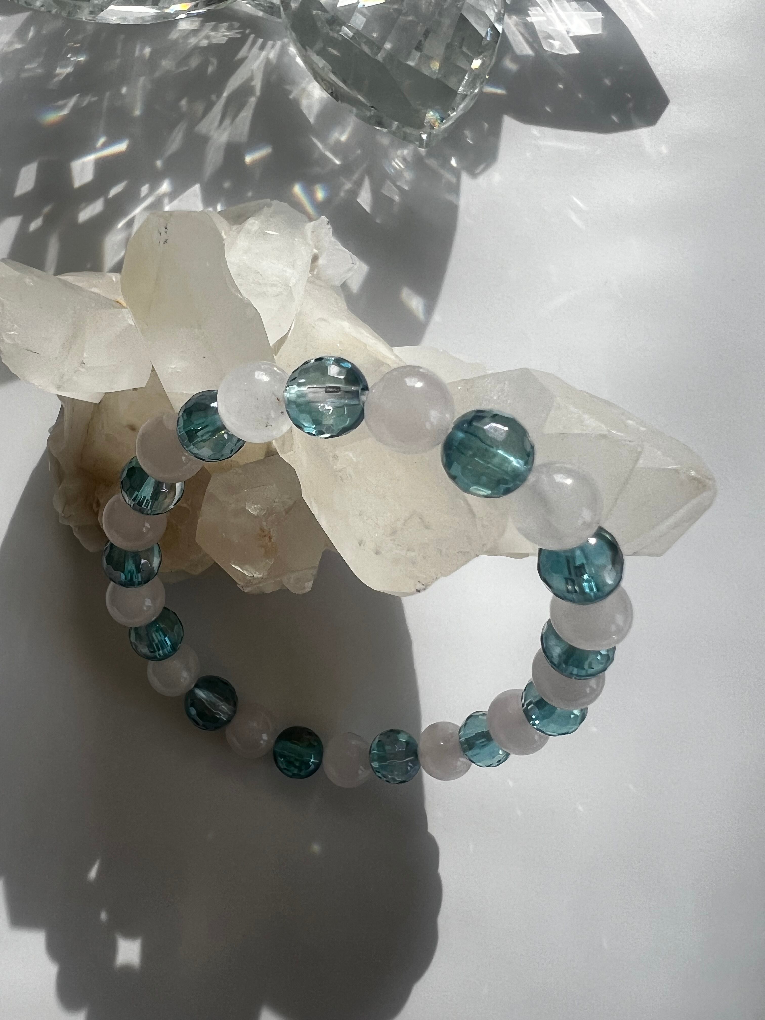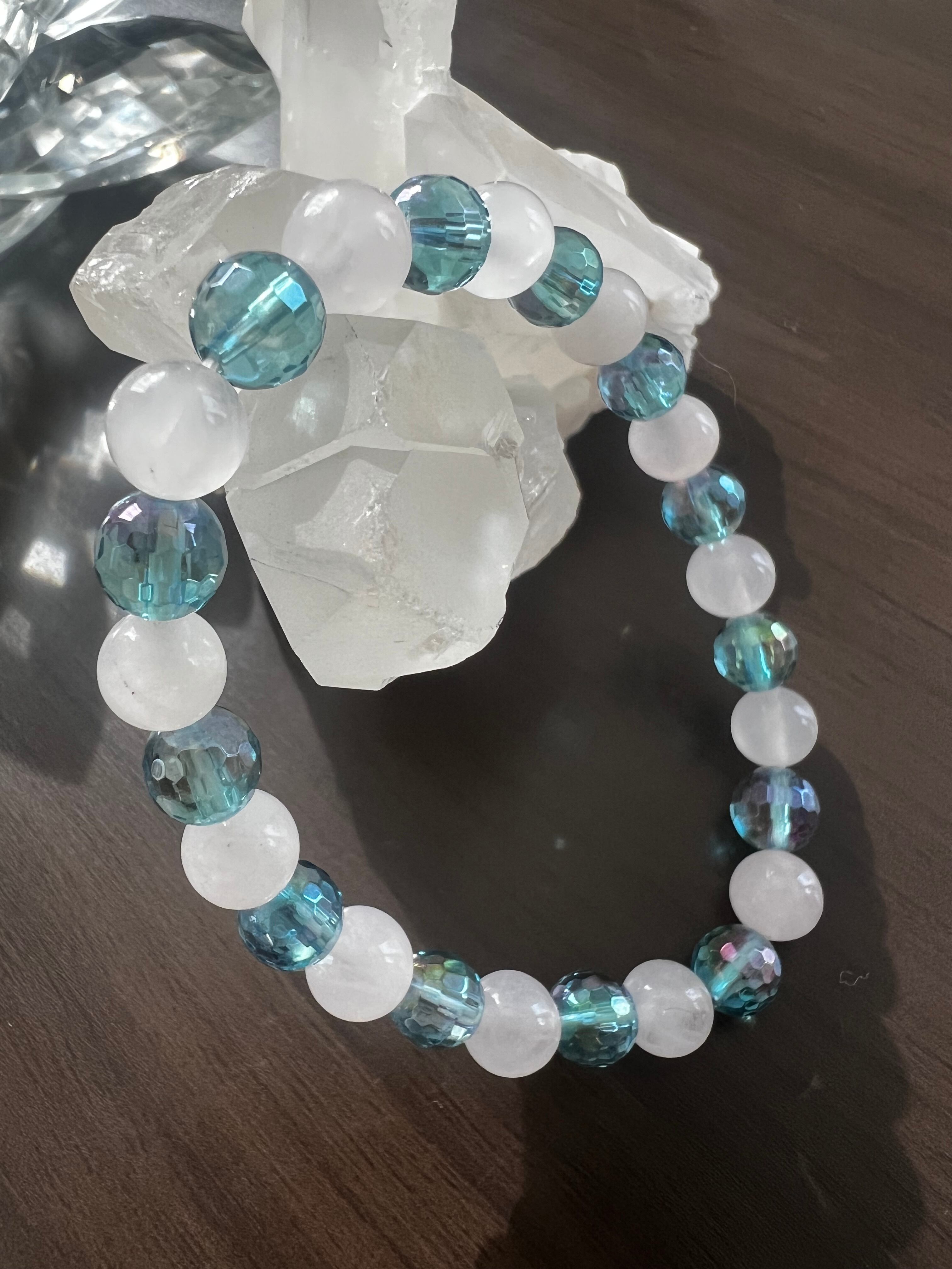 このブレスレットは、愛や平安、そして心のクリアさを求める方に最適です。ミラーボールカットアクアオーラの幸運を引き寄せる力、ローズクォーツの癒し、あなたの日常にさらなる幸福と安定をもたらすことでしょう!