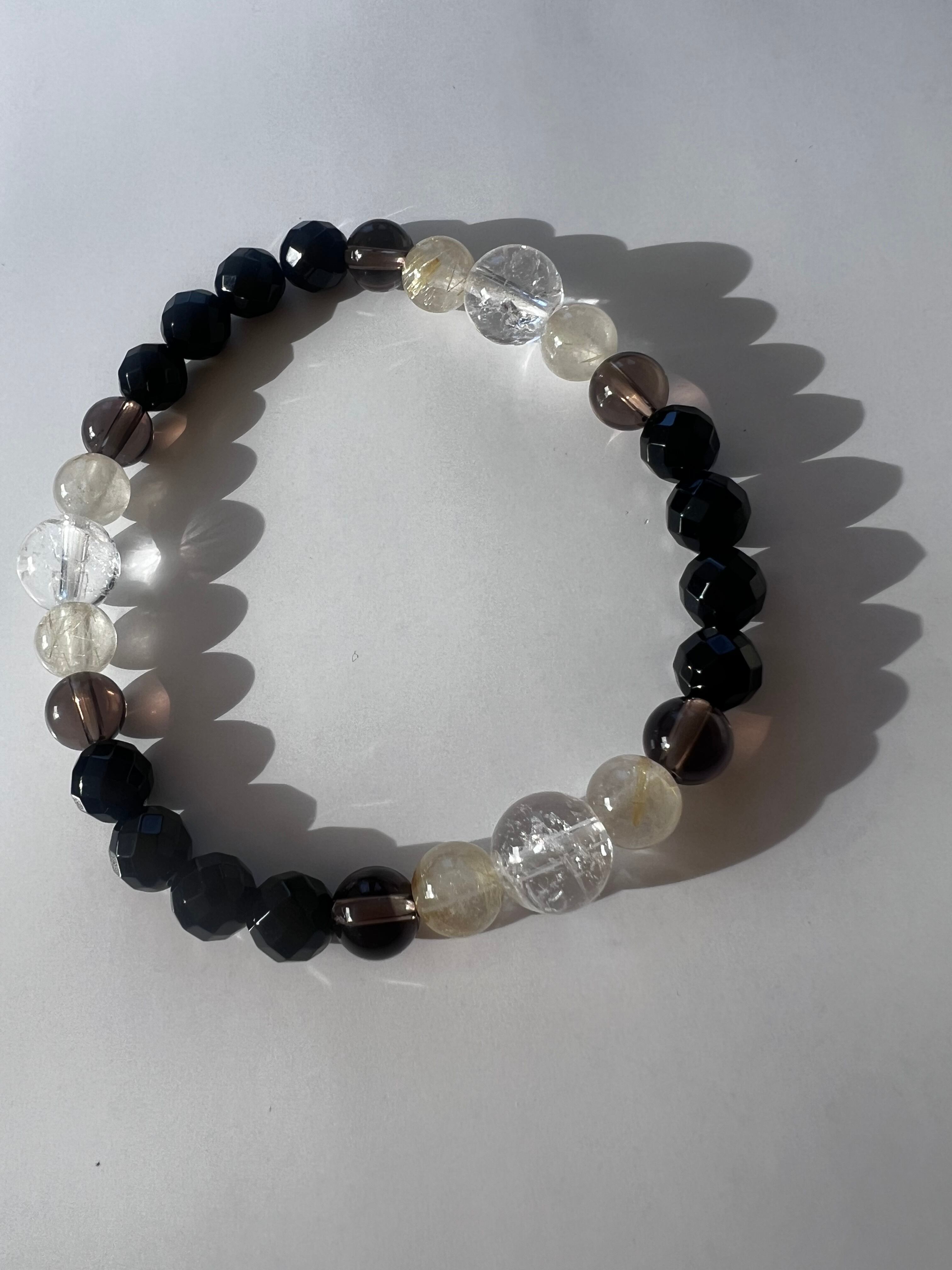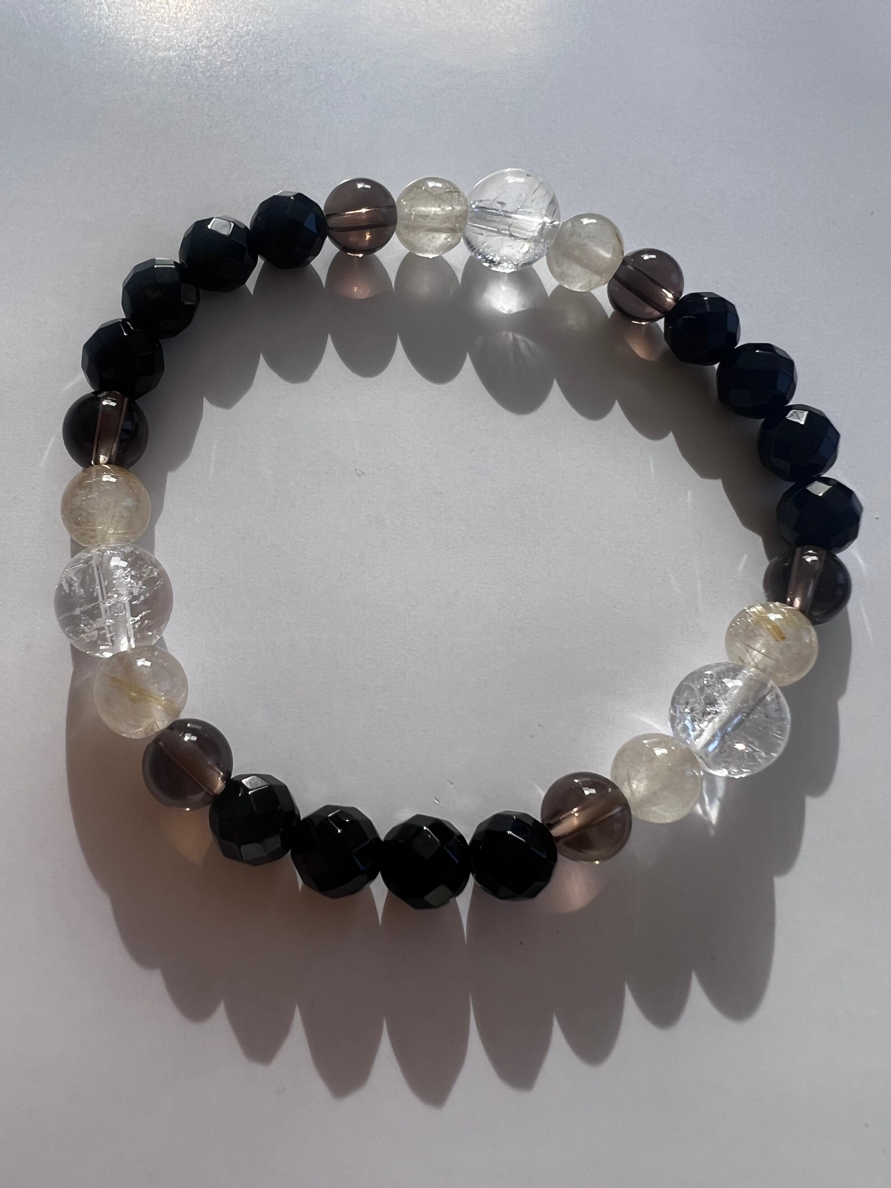 このブレスレットは、保護、自己成長、そして心の安定を求める方に最適です。カットブラックトルマリンの防御力、ルチルの自信、スモーキークォーツの安定感、クラック水晶の浄化が、あなたの日常にさらなる安心とポジティブなエネルギーをもたらすことでしょう!