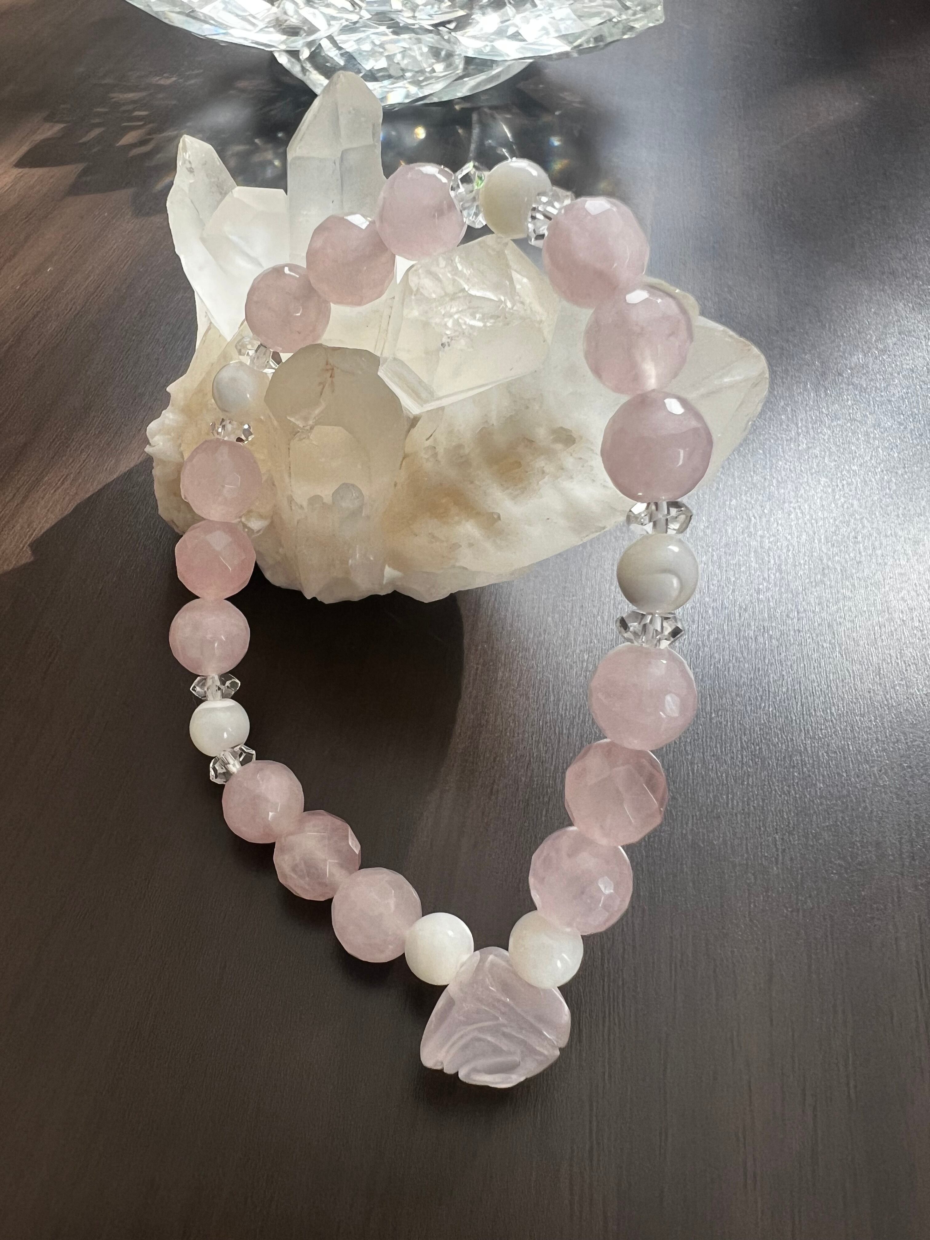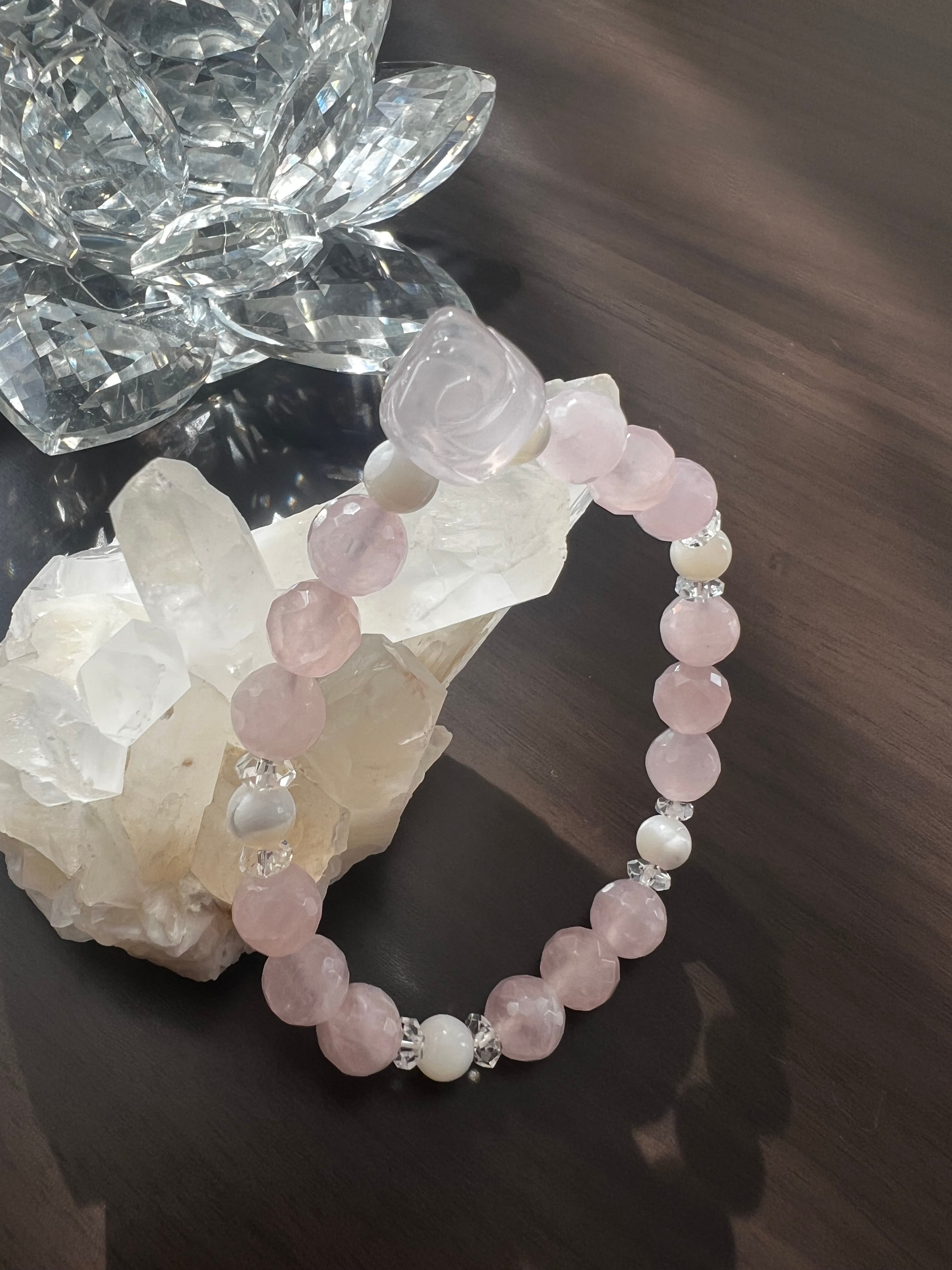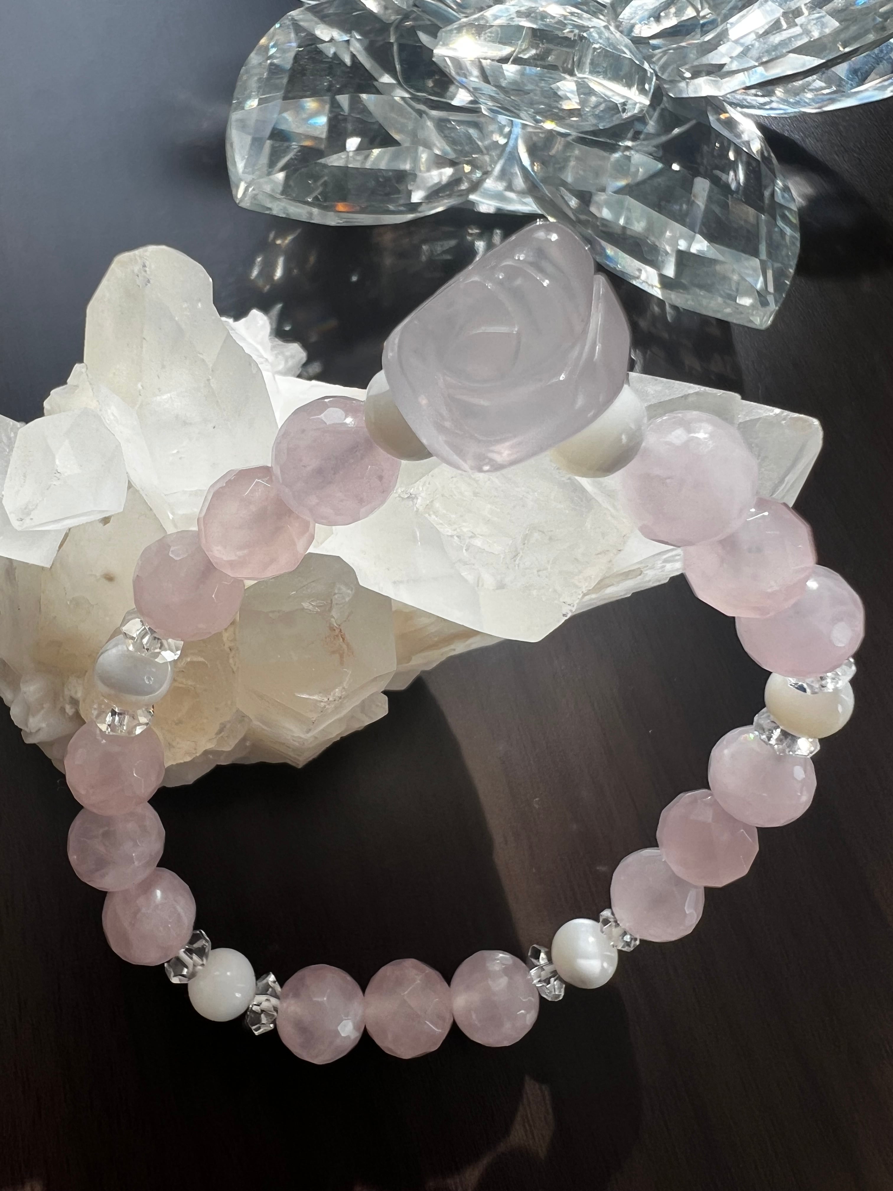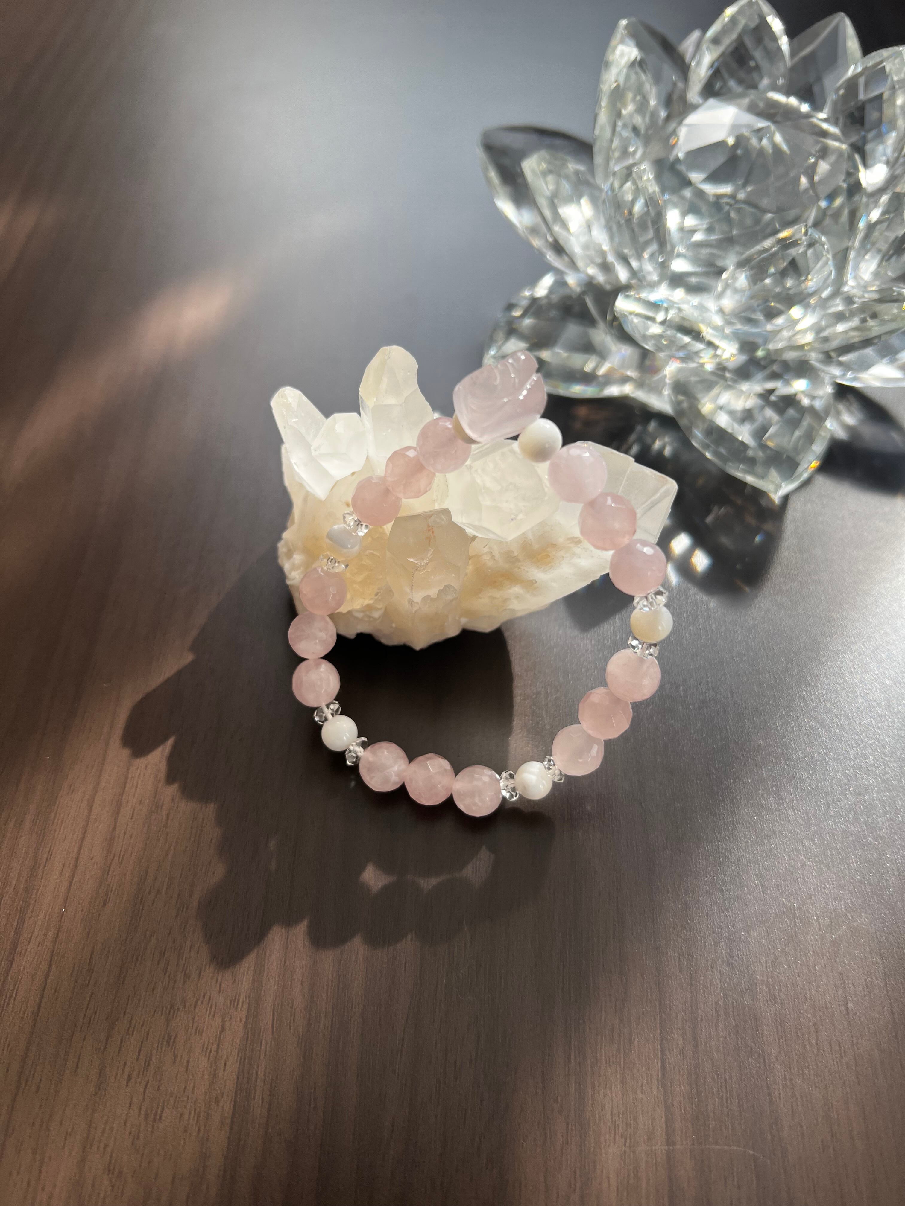 このブレスレットは、愛、感受性、そして心の癒しを求める方に最適です。バラカットローズクォーツとミラーボールカットローズクォーツの優しさ、マザーオブパールの穏やかさが、あなたの日常にさらなる愛情と平和をもたらすことでしょう!