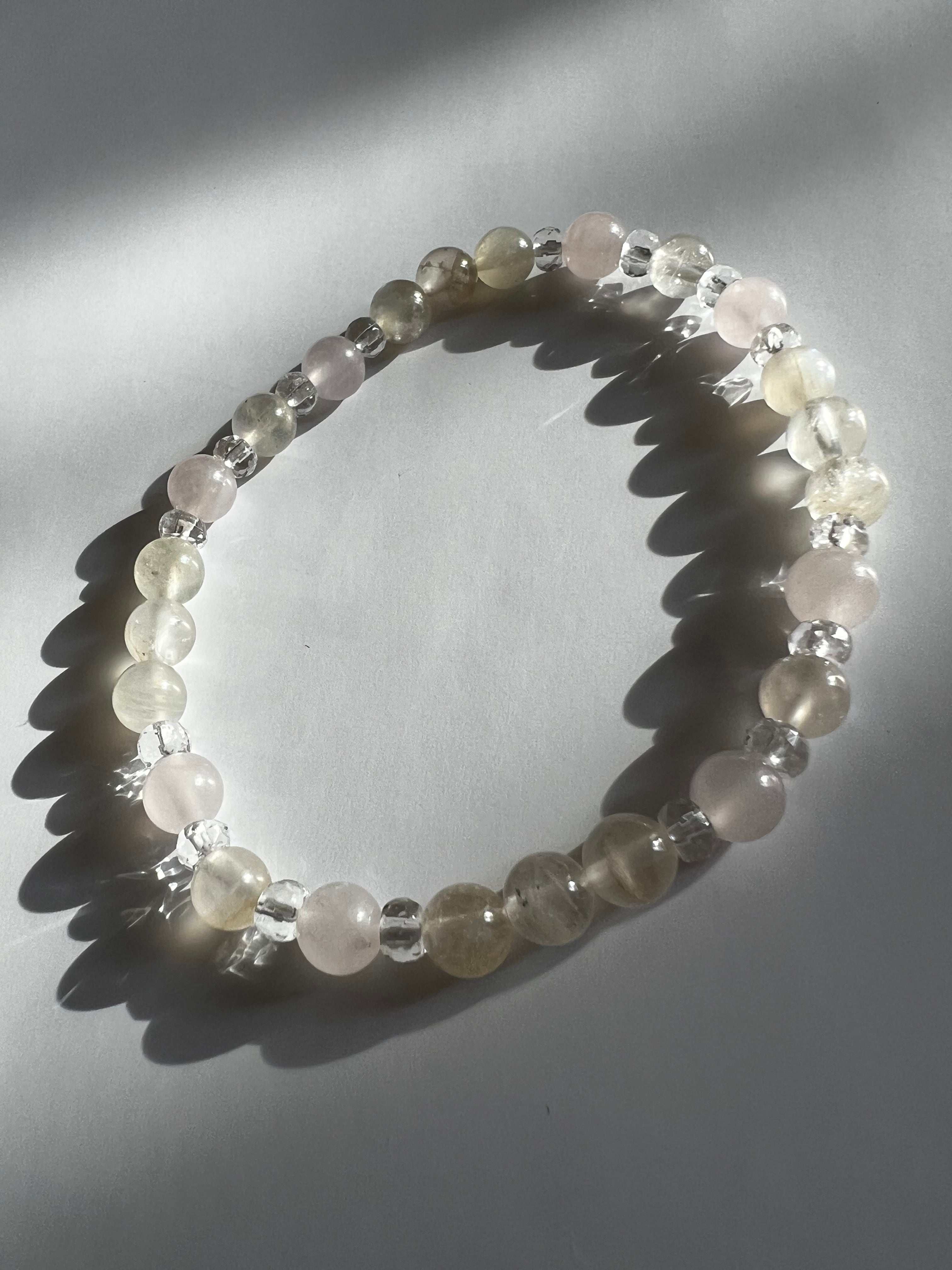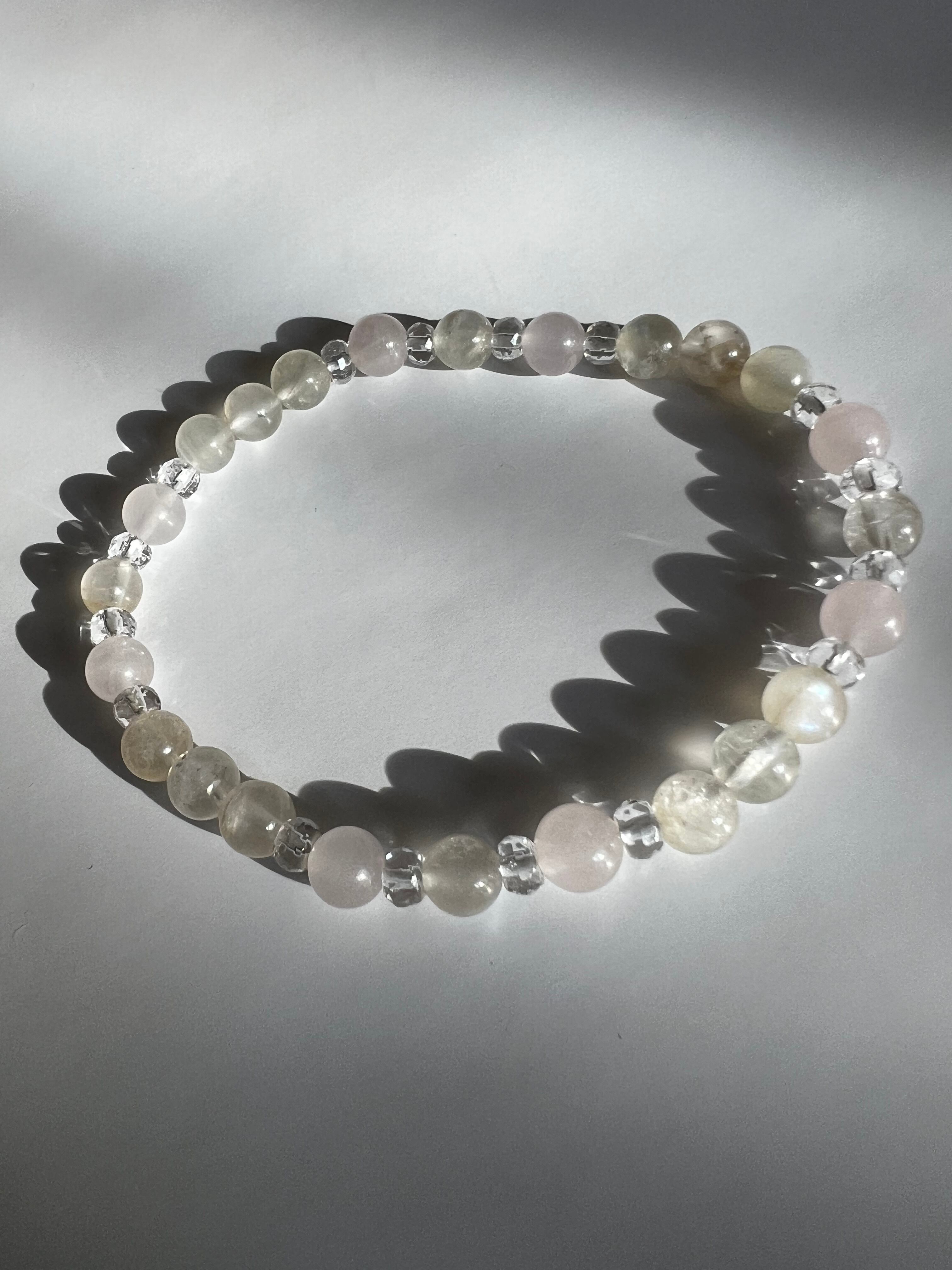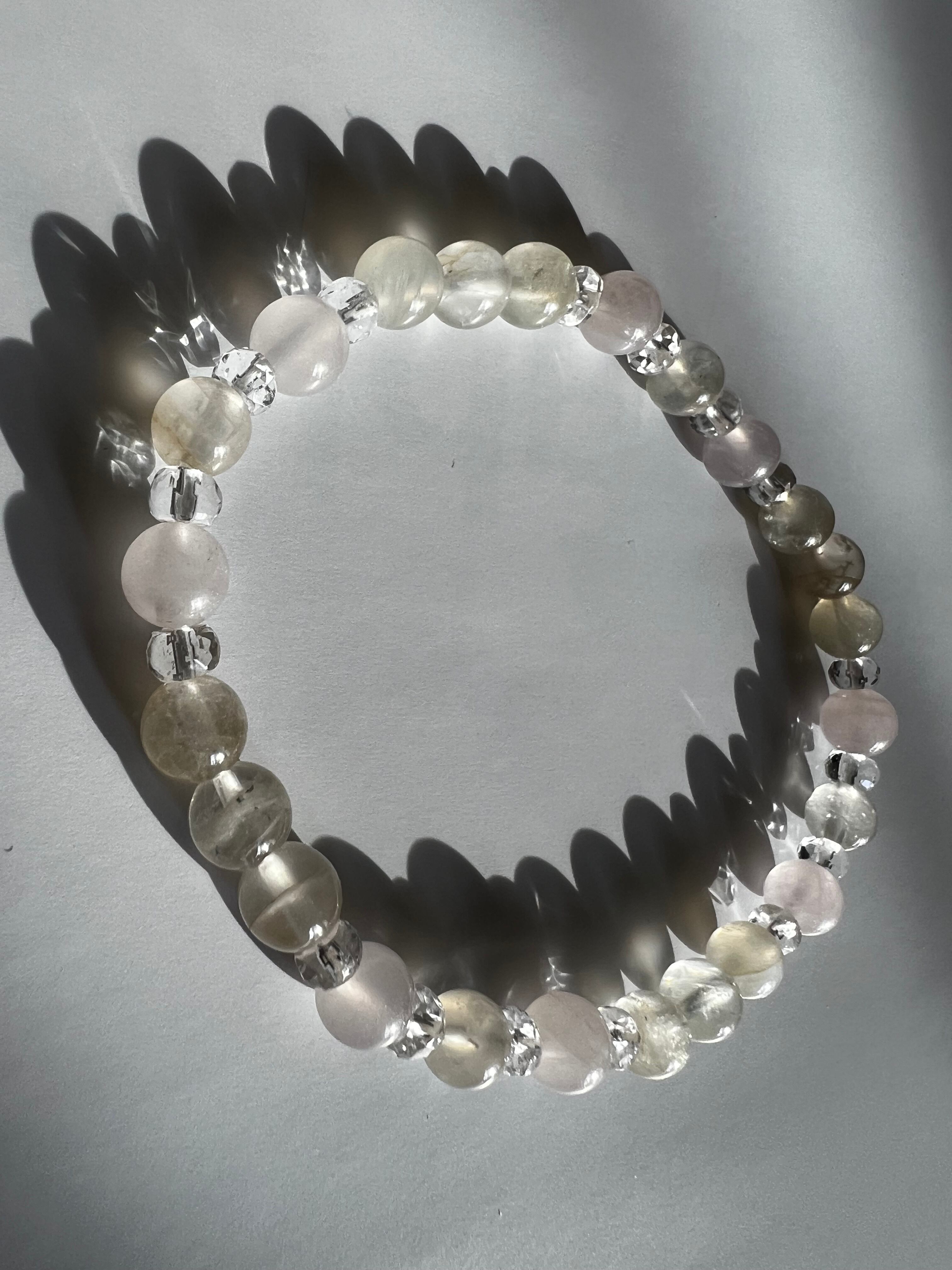 このブレスレットは、心の安定、愛情、そしてエネルギーを求める方に最適です。ムーンストーンの神秘的な力、ローズクォーツの優しさ、そして20面カット水晶の透明感が、あなたの日常に豊かさと調和をもたらすことでしょう!