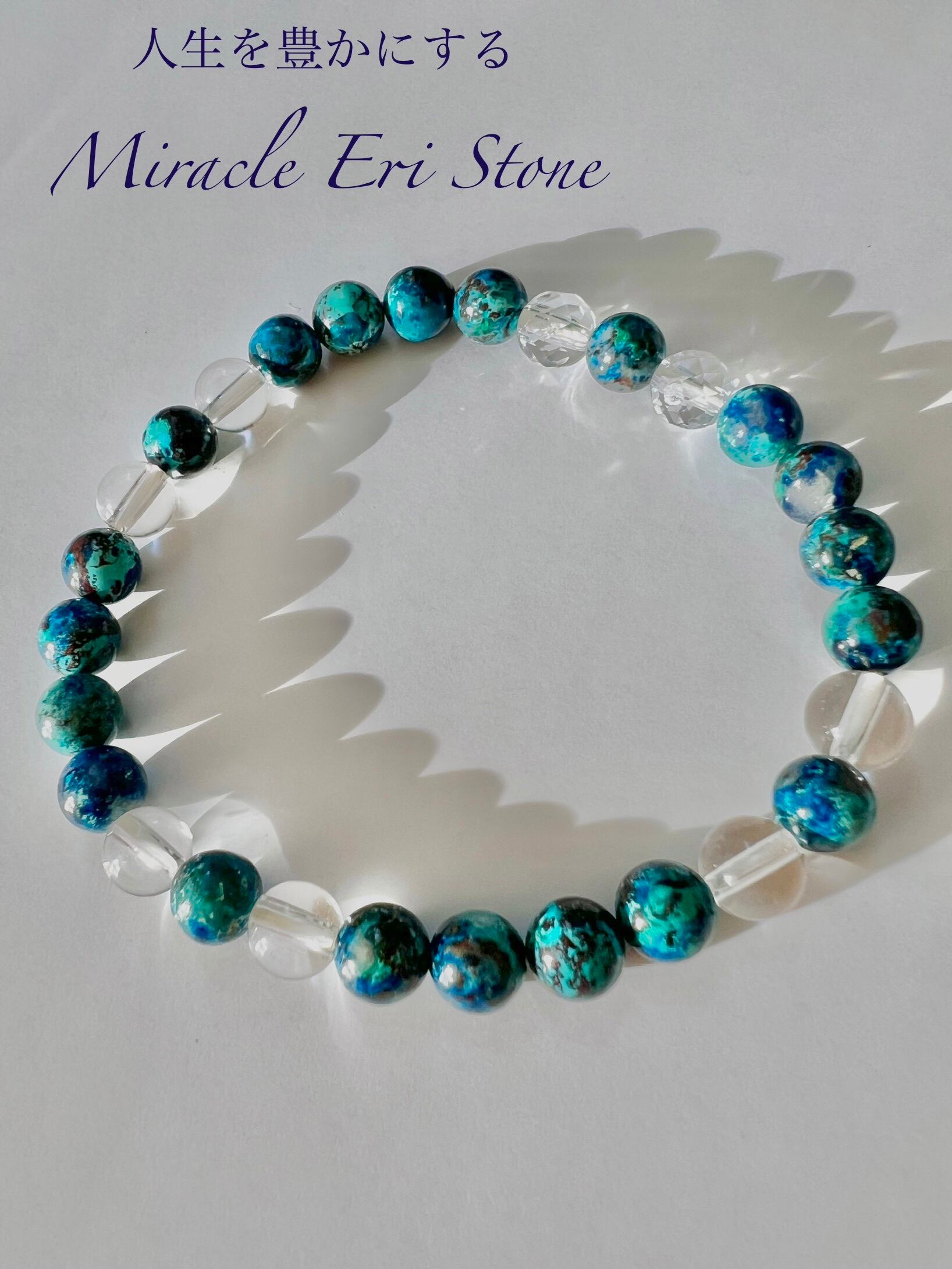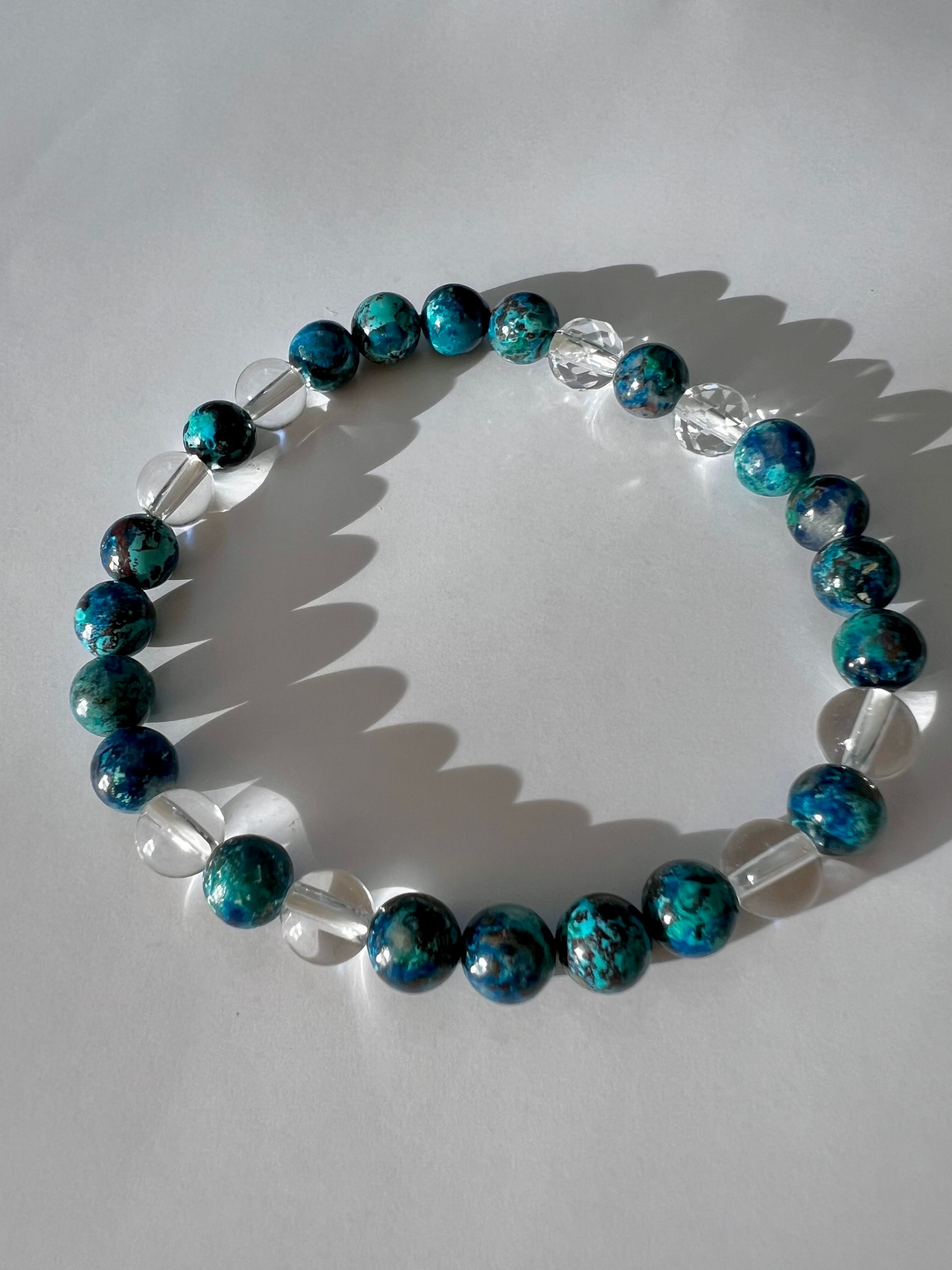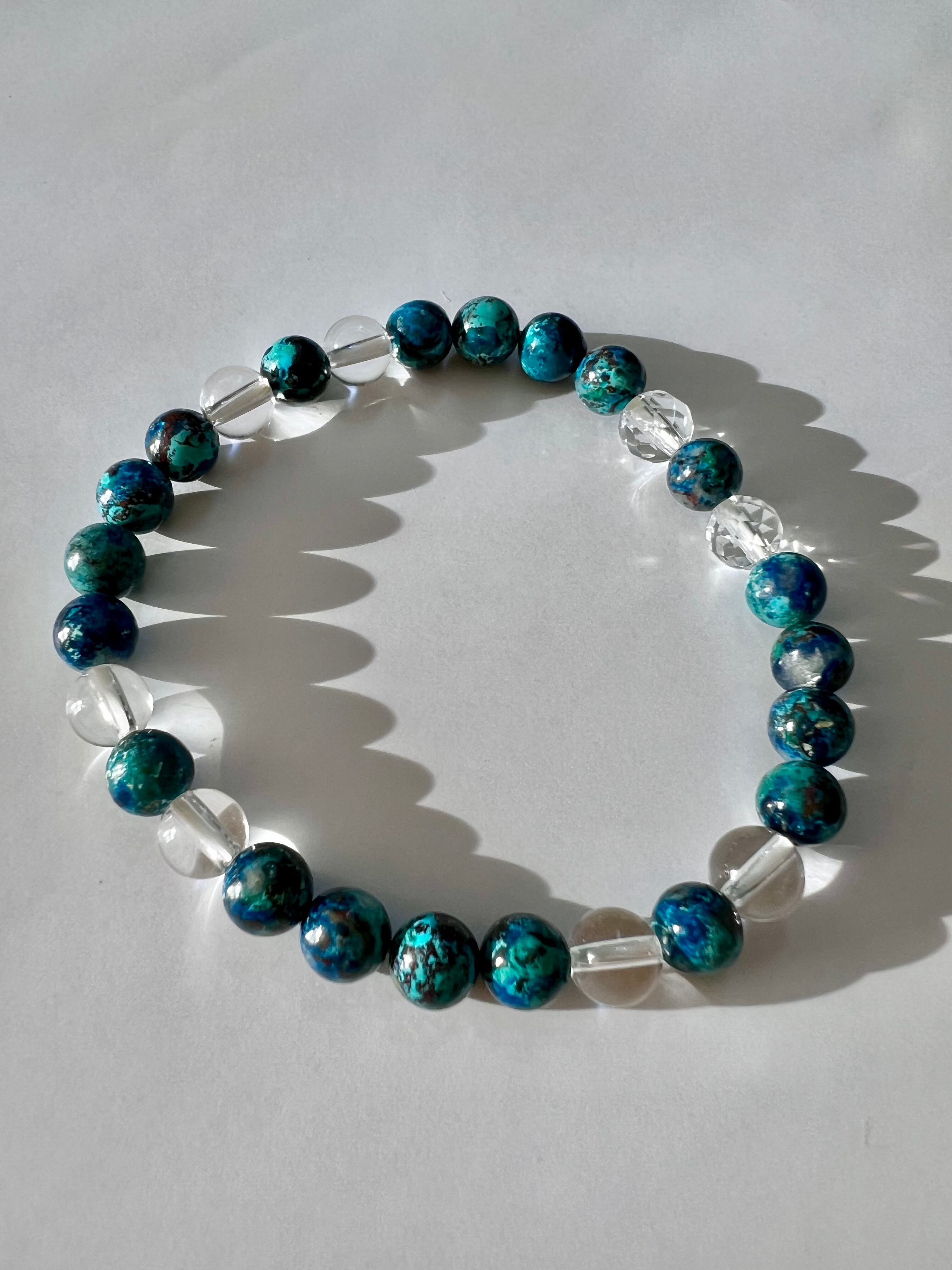 クリソコラはパワフルな癒しのエネルギーを持ち、水晶はクリアな浄化力で知られています。このブレスレットは、心身のバランスを整え、穏やかな気持ちをもたらすためにデザインされました。クリソコラの深い緑に水晶の透明感が加わり、エレガントで上品な印象を与え、豊かで平和な生活へのエネルギーを高めることができます。