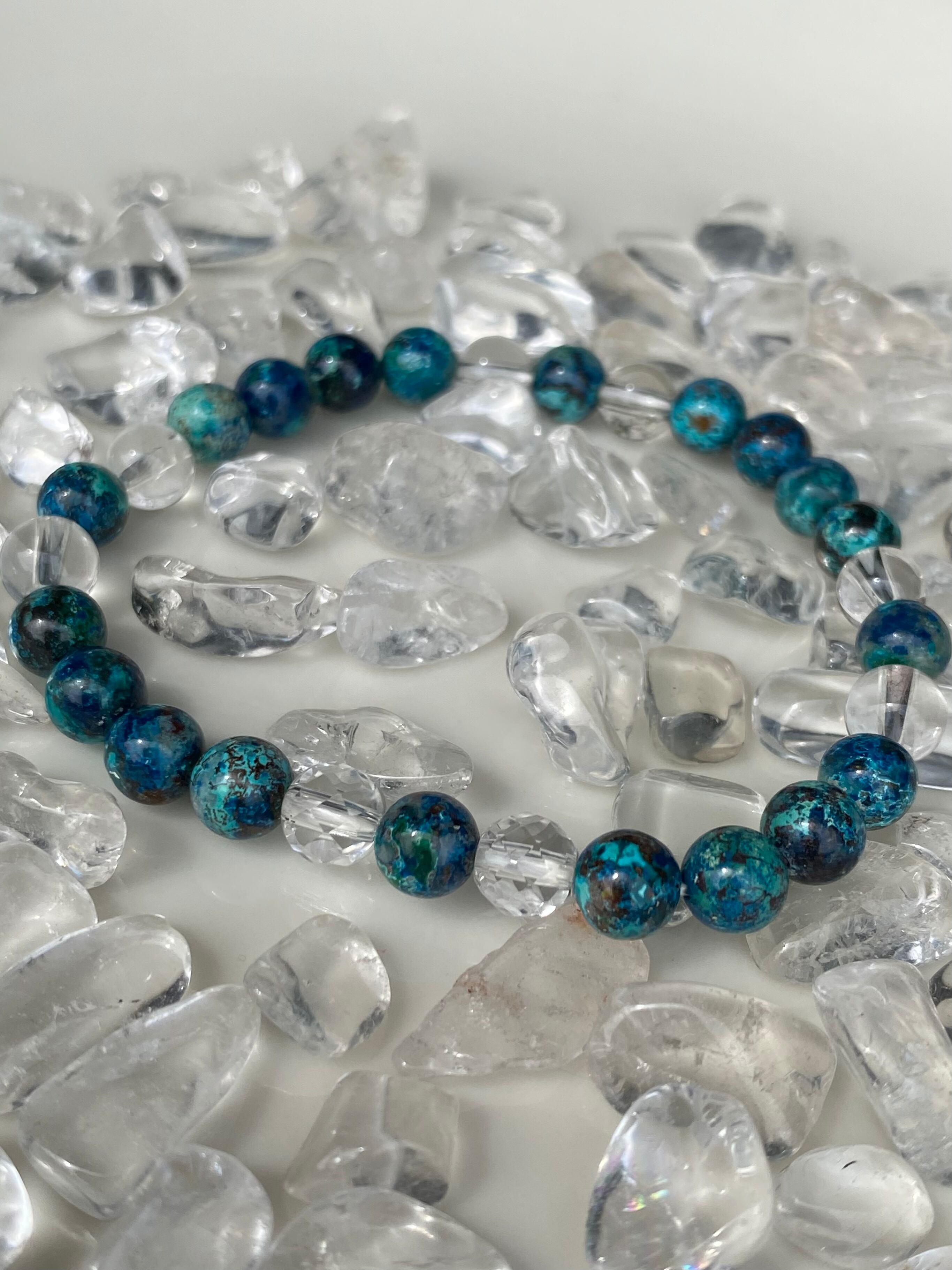 クリソコラはパワフルな癒しのエネルギーを持ち、水晶はクリアな浄化力で知られています。このブレスレットは、心身のバランスを整え、穏やかな気持ちをもたらすためにデザインされました。クリソコラの深い緑に水晶の透明感が加わり、エレガントで上品な印象を与えます。