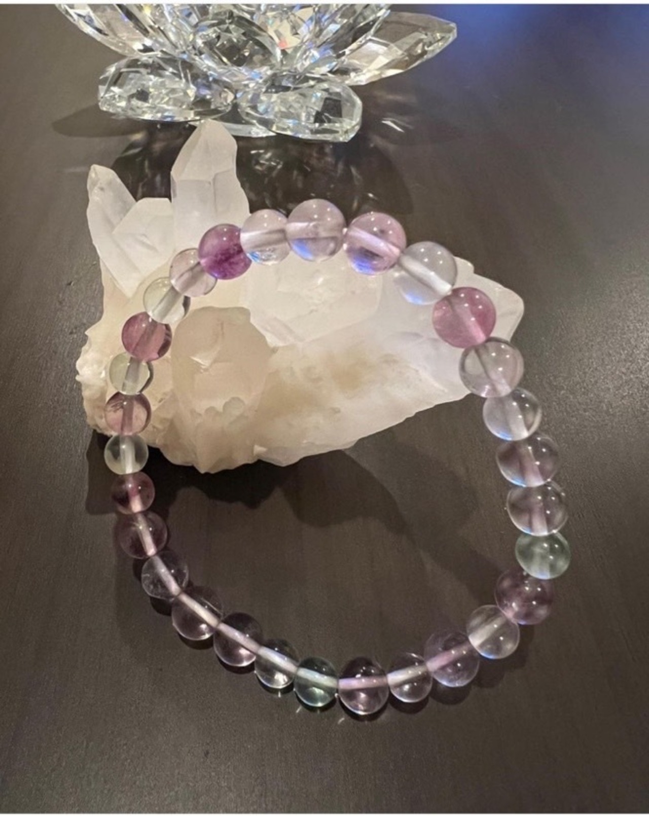 このブレスレットはパープルが多めになっているため、その美しい淡い紫色が心を魅了します。フローライトは、ストレスや不安を癒し、浄化や保護のパワーを持ち、心をリラックスさせる効果があります。さらに、持ち主の直感力を高め、創造力も刺激します。