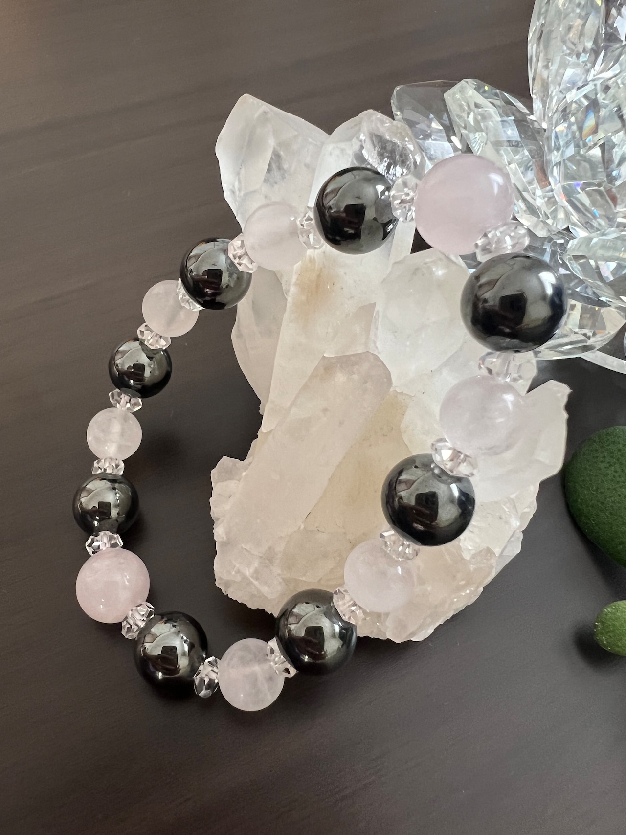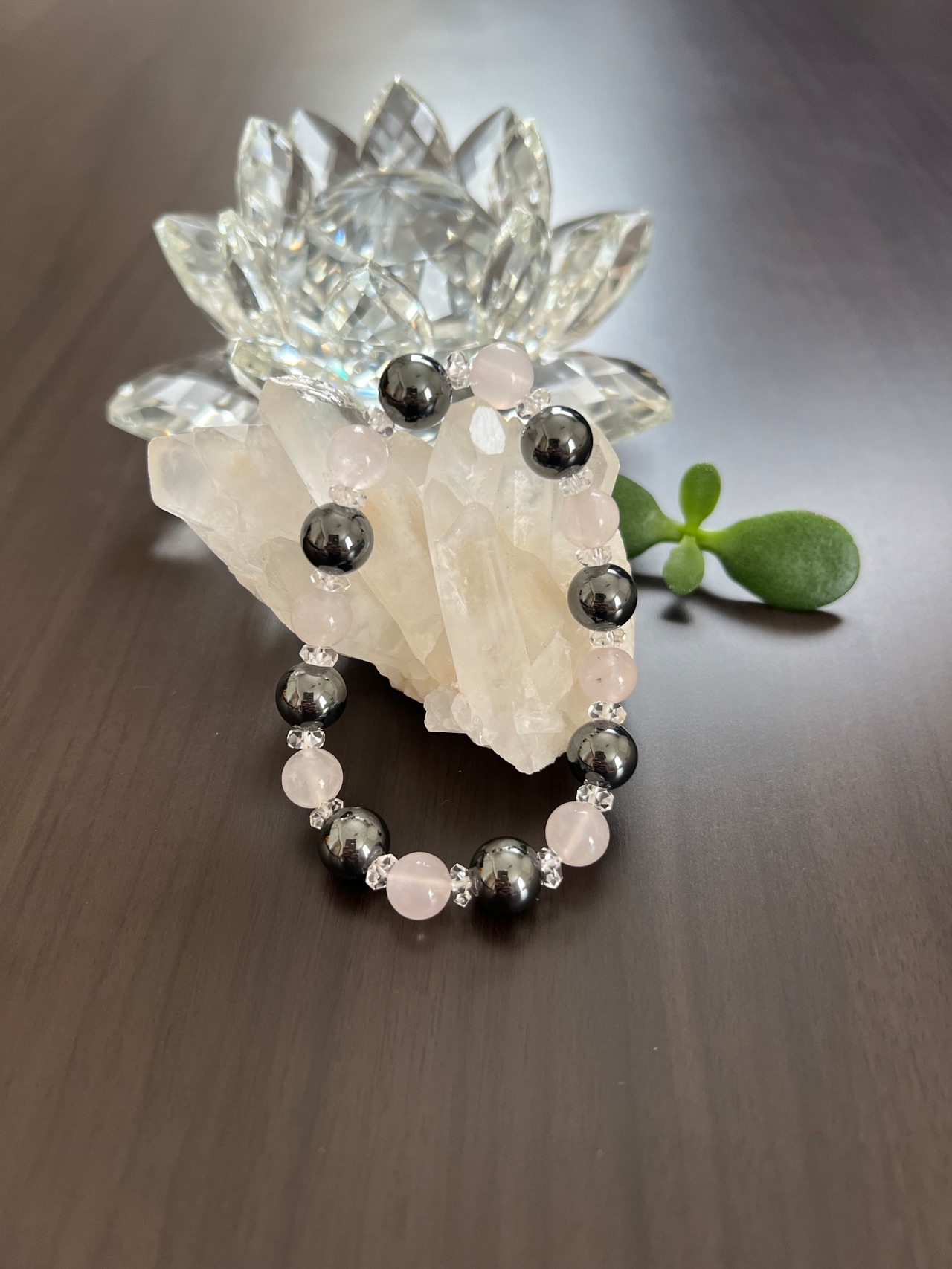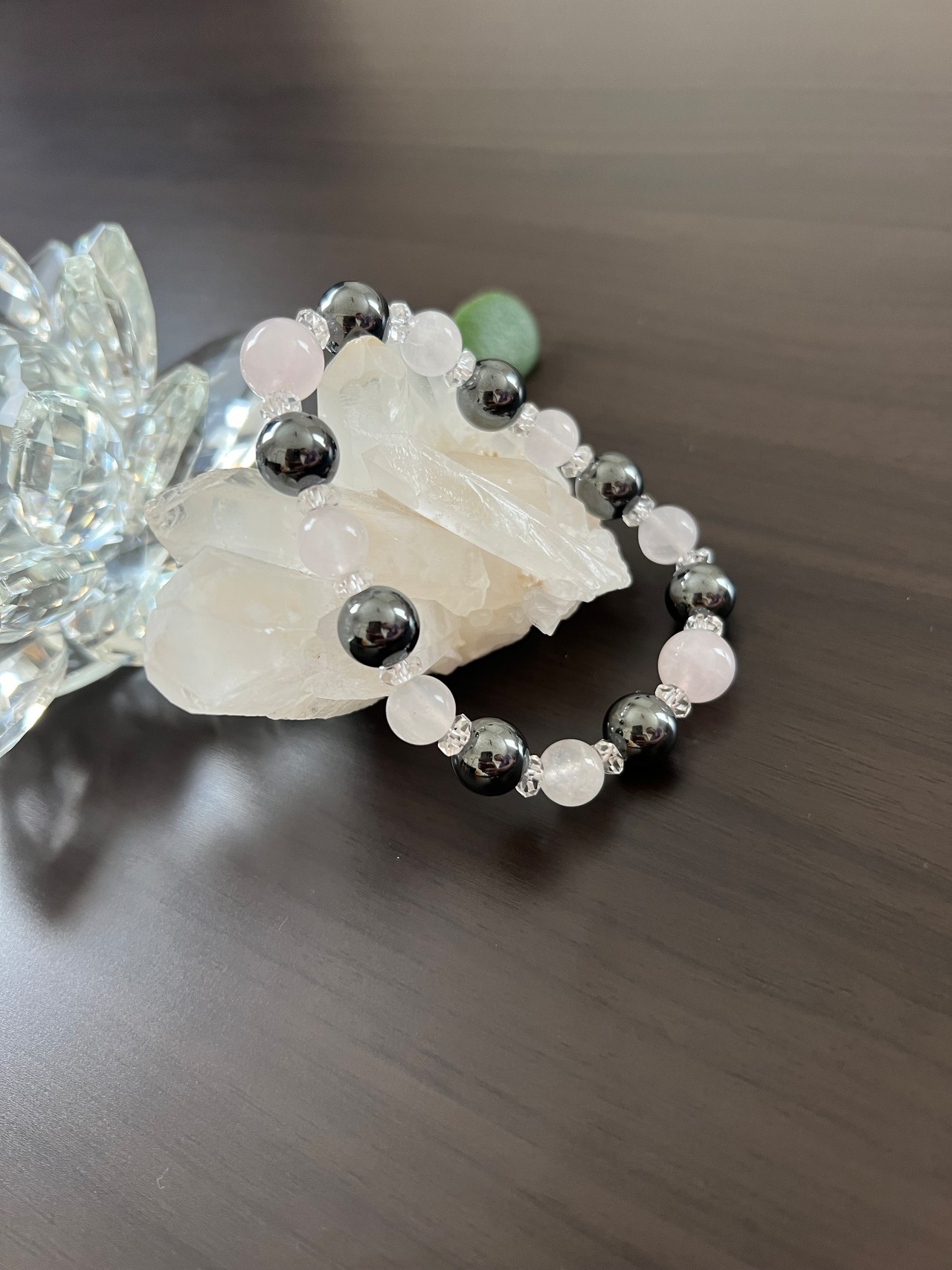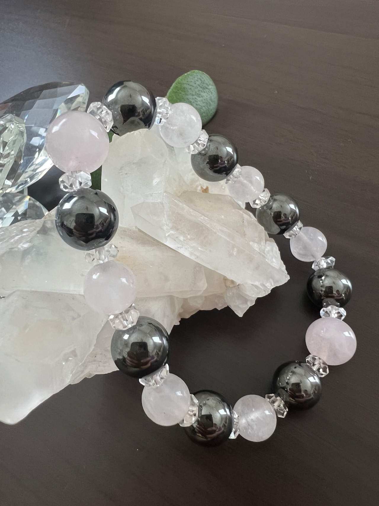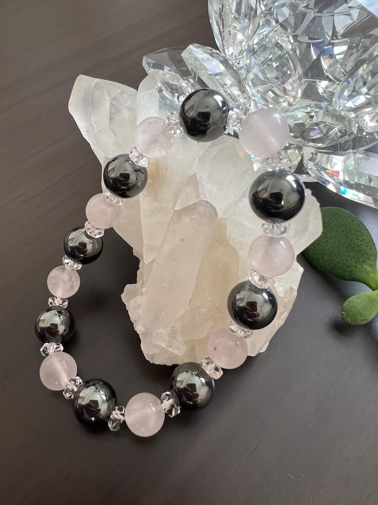 ヘマタイト、ローズクォーツ、カット水晶が組み合わさった美しいブレスレットです。