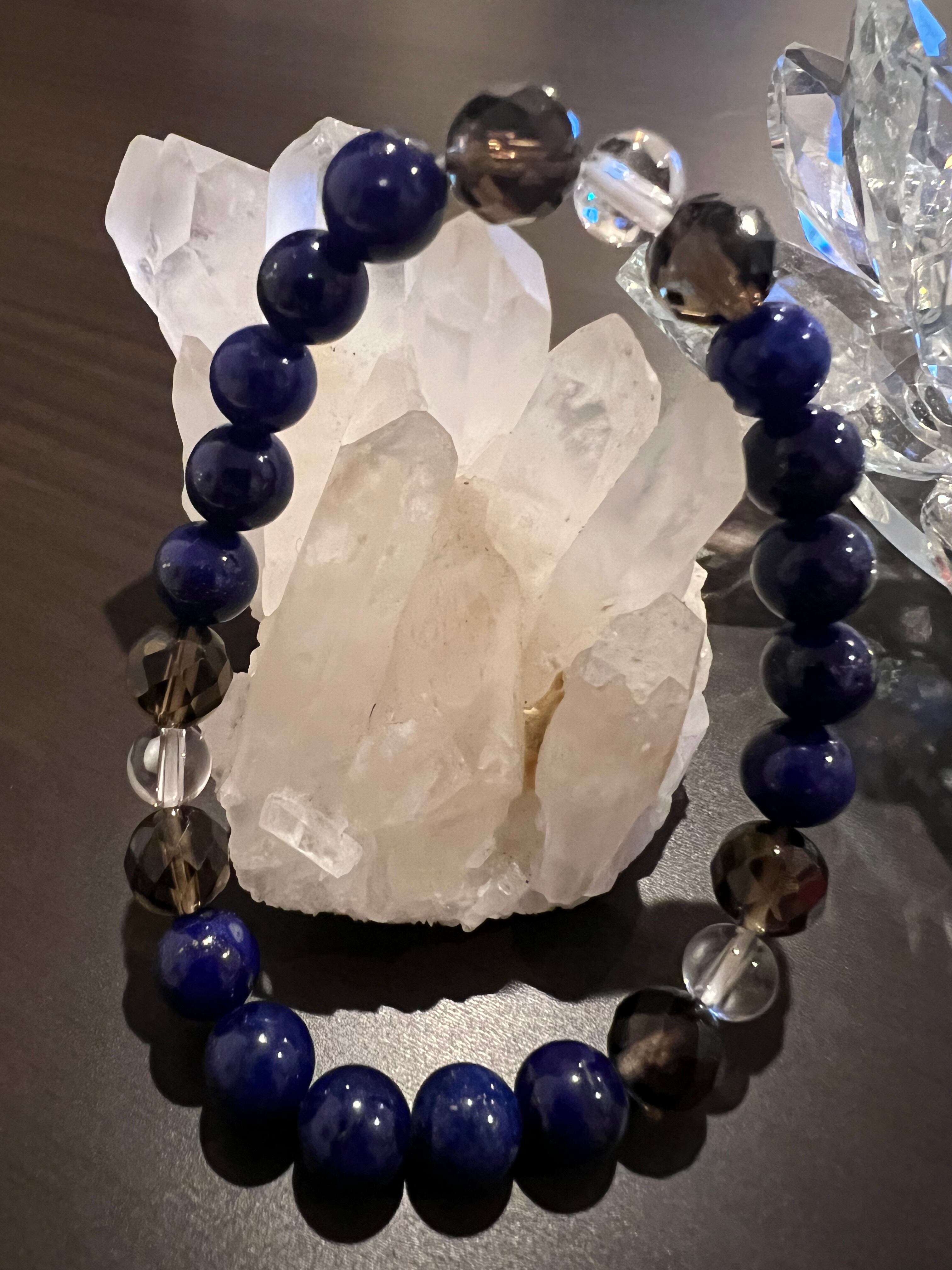 ラピスラズリは、宝物の象徴として扱われた石で知識や直感を高め、自己表現をサポートしてくれます。古代エジプトでも貴重視され、その濃深な青色はまるで星空のような神秘的な美しさを持っています。カットスモーキークォーツは、豊かな茶色の深みが特徴で、地に足を着けた安定感や自信を与え、穏やかさをもたらしてくれます。そして水晶は、透明な輝きと浄化の力を持ち合わせ、心や魂をクリアにします。