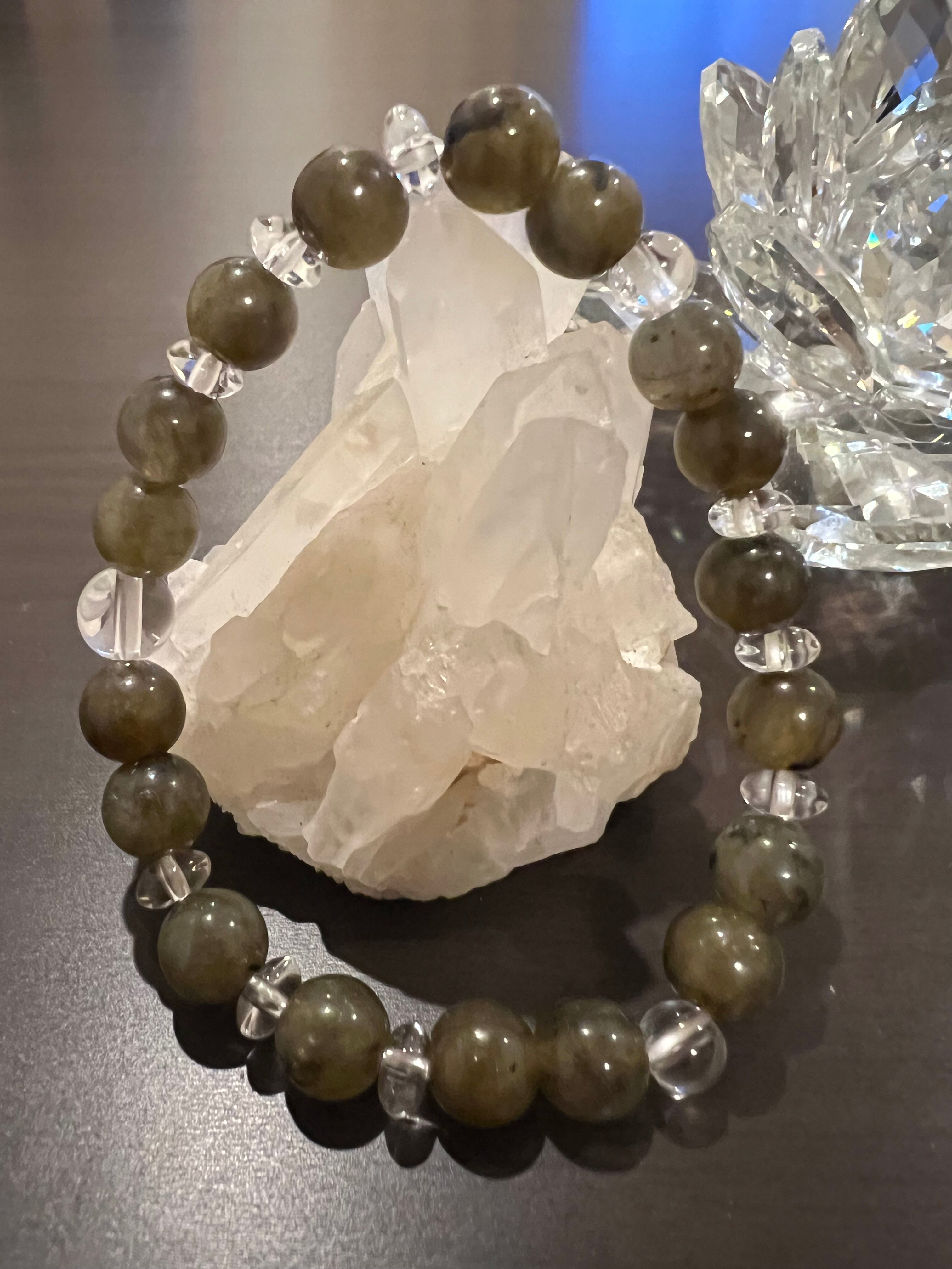 甘く輝く愛の魔力が込められた、魅惑的なラブラドライトと水晶の合わせブレスレット。