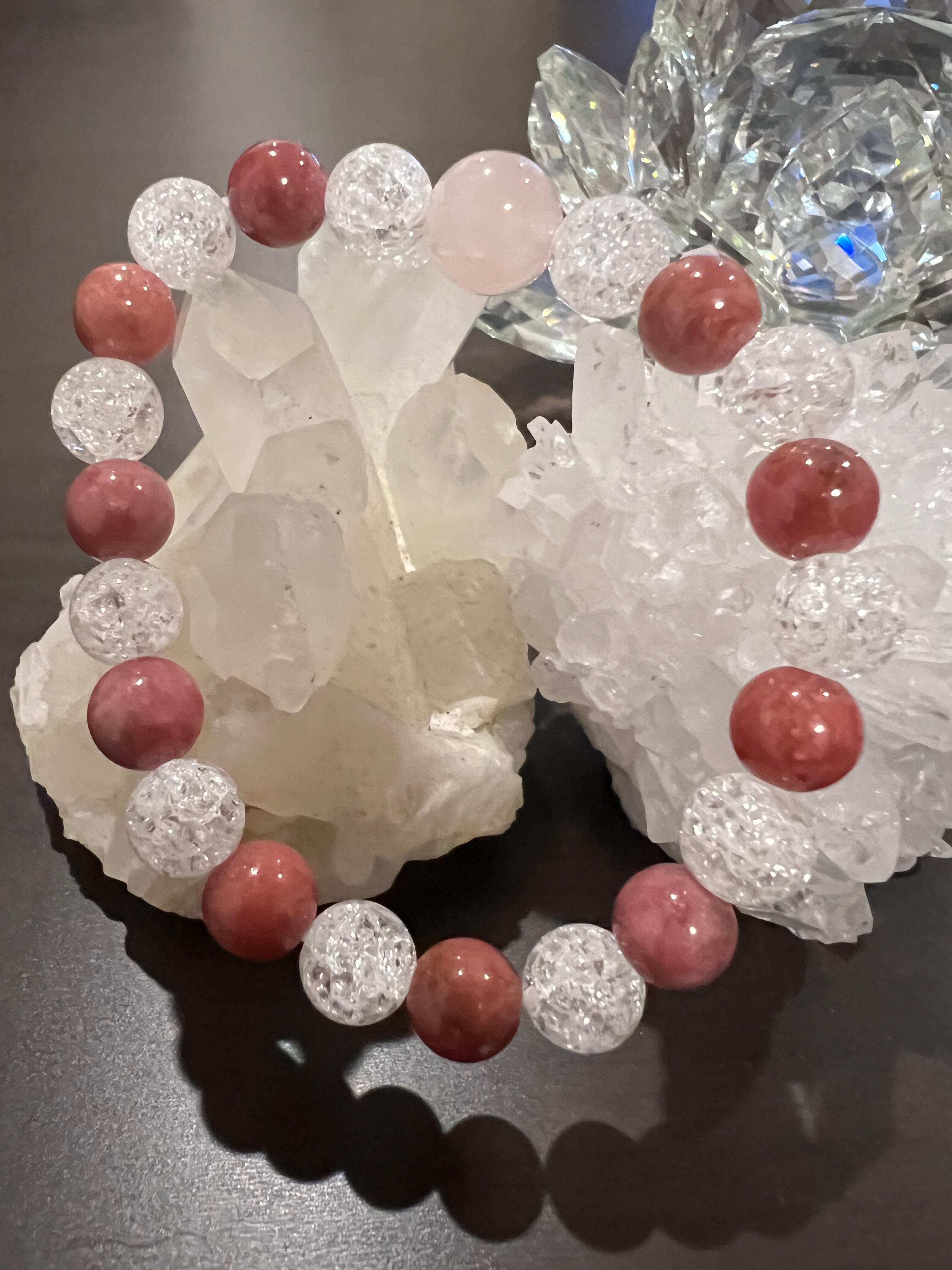 ロードナイト & クラック水晶 & ローズクォーツは、深い愛と癒しのエネルギーを持つ組み合わせです。美しいロードナイトのストーンは、自信と勇気を養い、前に進む力を与えてくれます。クラック水晶は、内なる力を引き出し、クリアな思考を促してくれます。そしてローズクォーツは、優しさと愛情を象徴し、心を癒やし、幸福感をもたらしてくれます。
