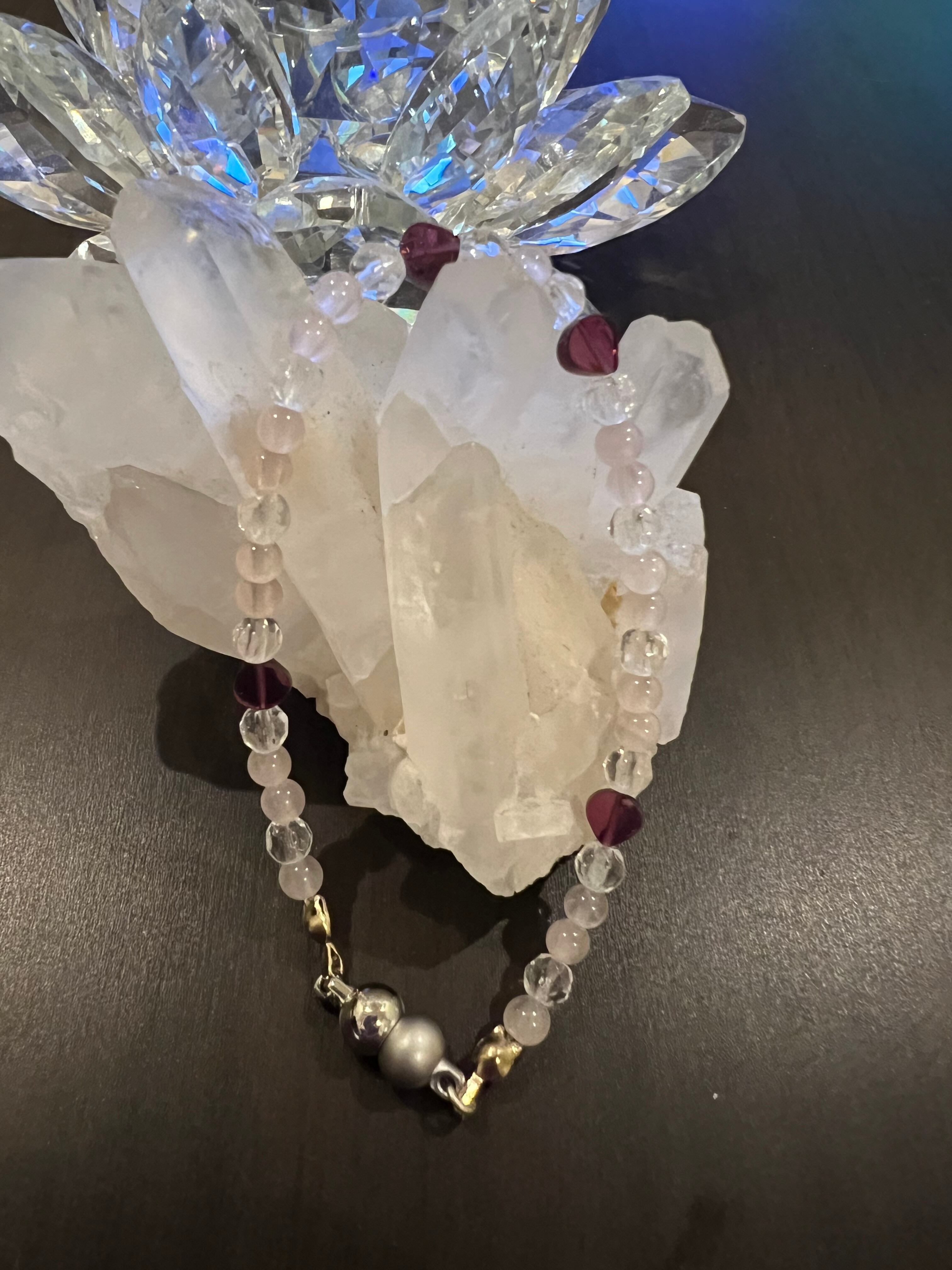 ローズクォーツは愛と癒しと情熱を象徴し、ハートガーネットは愛と情熱の燃え立つような力強さを持ち、カット水晶は浄化とクリアな思考をサポートします。