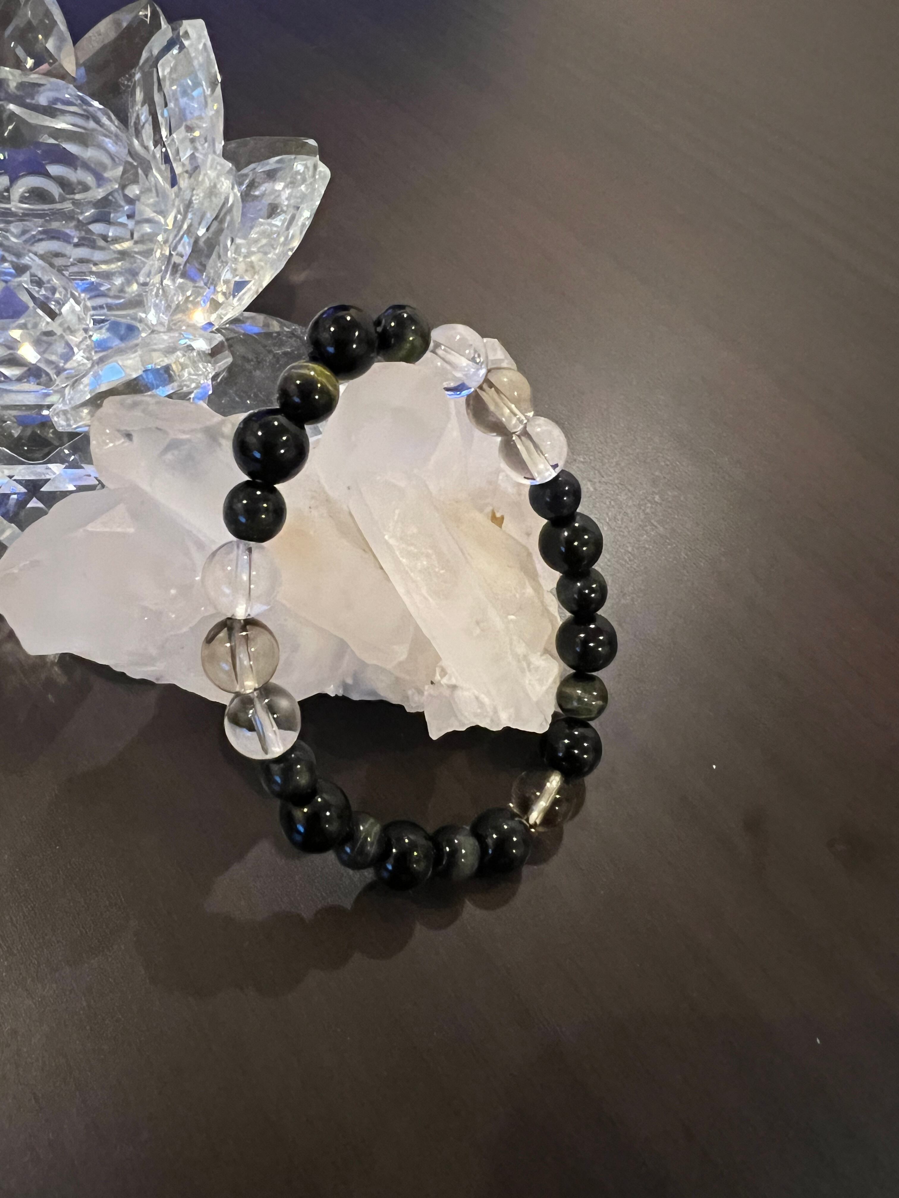 このブレスレットは、不安な気持ちやネガティブなエネルギーから守ってくれると言われています。ブルータイガーアイの深い青色、スモーキークォーツの芳醇な茶色、そして水晶の透明感のある3つの石が絶妙に組み合わさり、高級感とスタイリッシュさを感じさせてくれます。