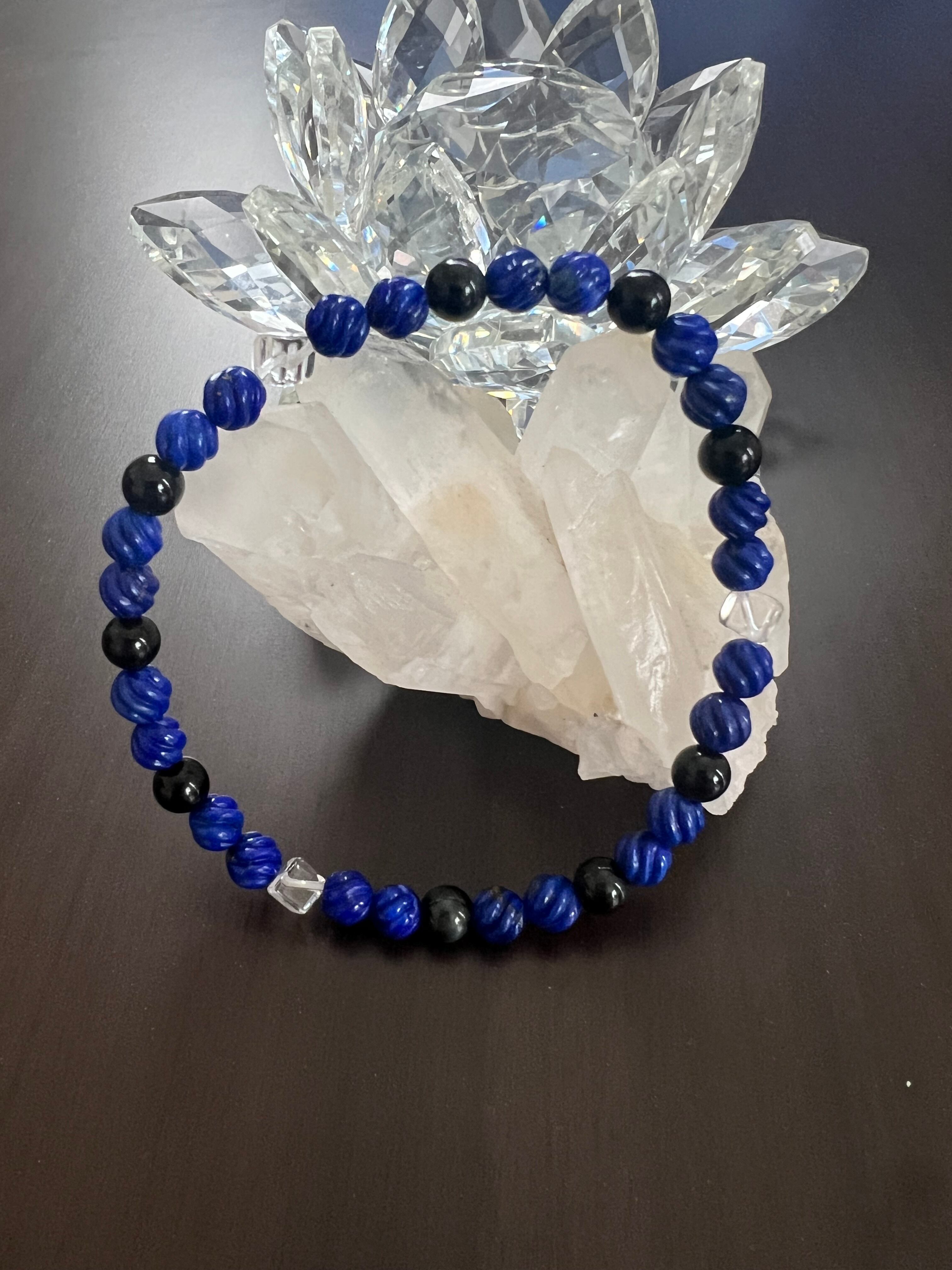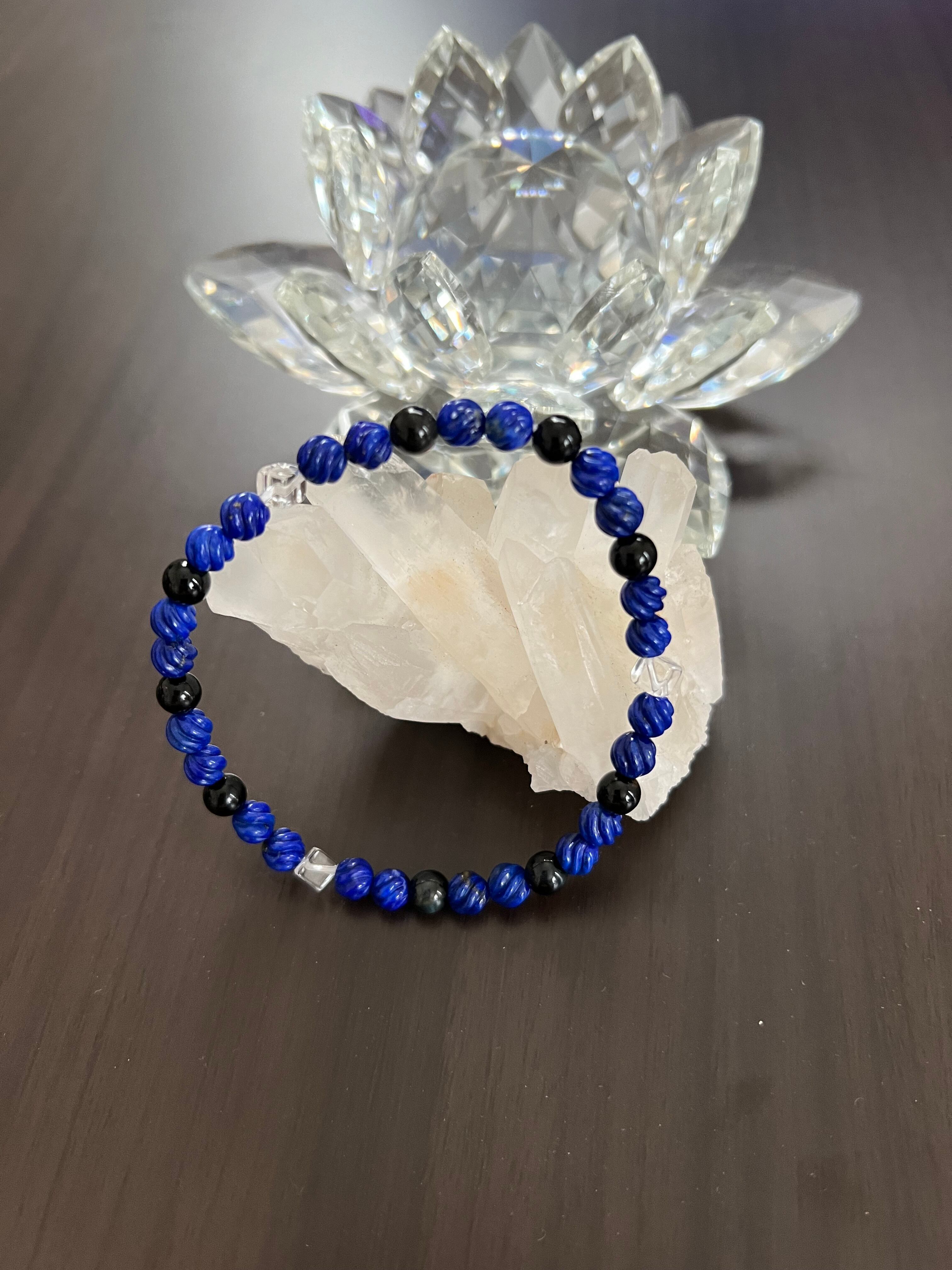 天然石の魅力を最大限に引き立てた、ウェーブカットのラピスラズリ、ブルータイガーアイ、キューブカットの水晶を組み合わせたパワーストーンブレスレットです。