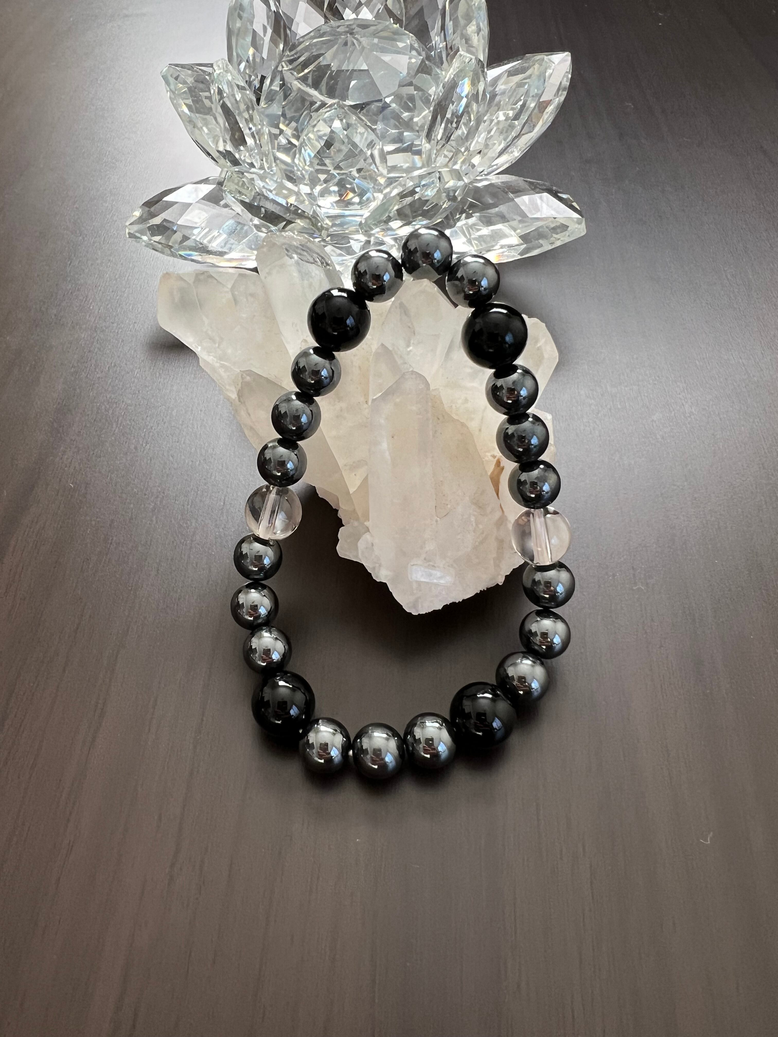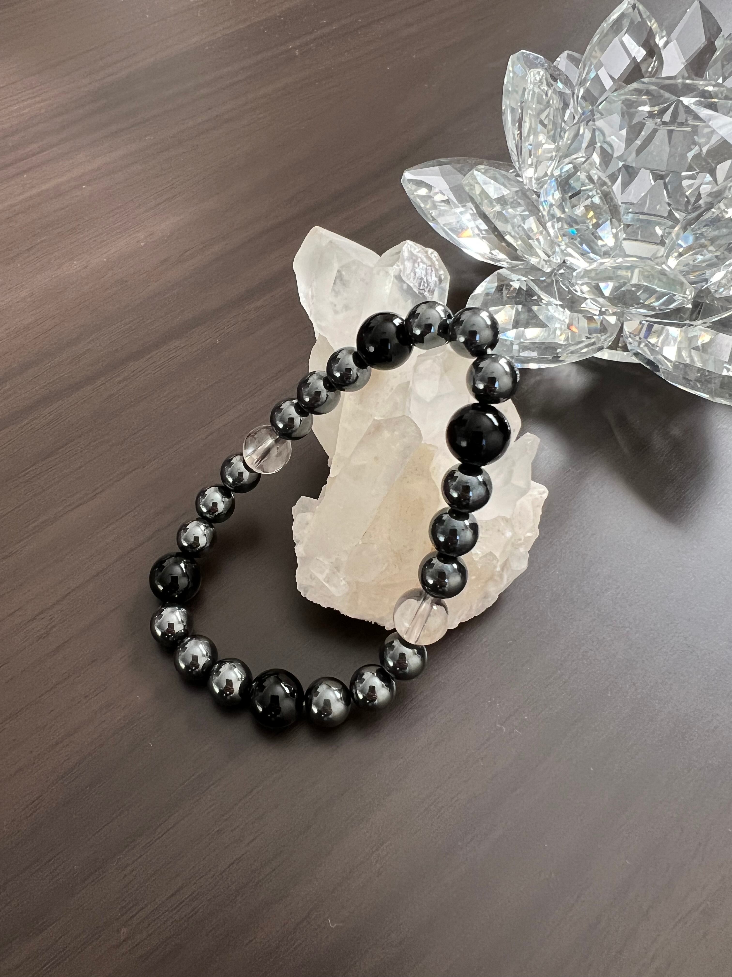 地に足をつけ、集中力を高める効果。オニキスは不安やストレスを和らげ、勇気を与える効果があり、活力をもたらし、持ち主の自信を高めるとされています。水晶はマイナスエネルギーを浄化し、ポジティブなエネルギーを引き寄せる効果があります。このブレスレットを身につけることで、身体と心のバランスを整え、積極的に人生を歩んでいくことができます。
