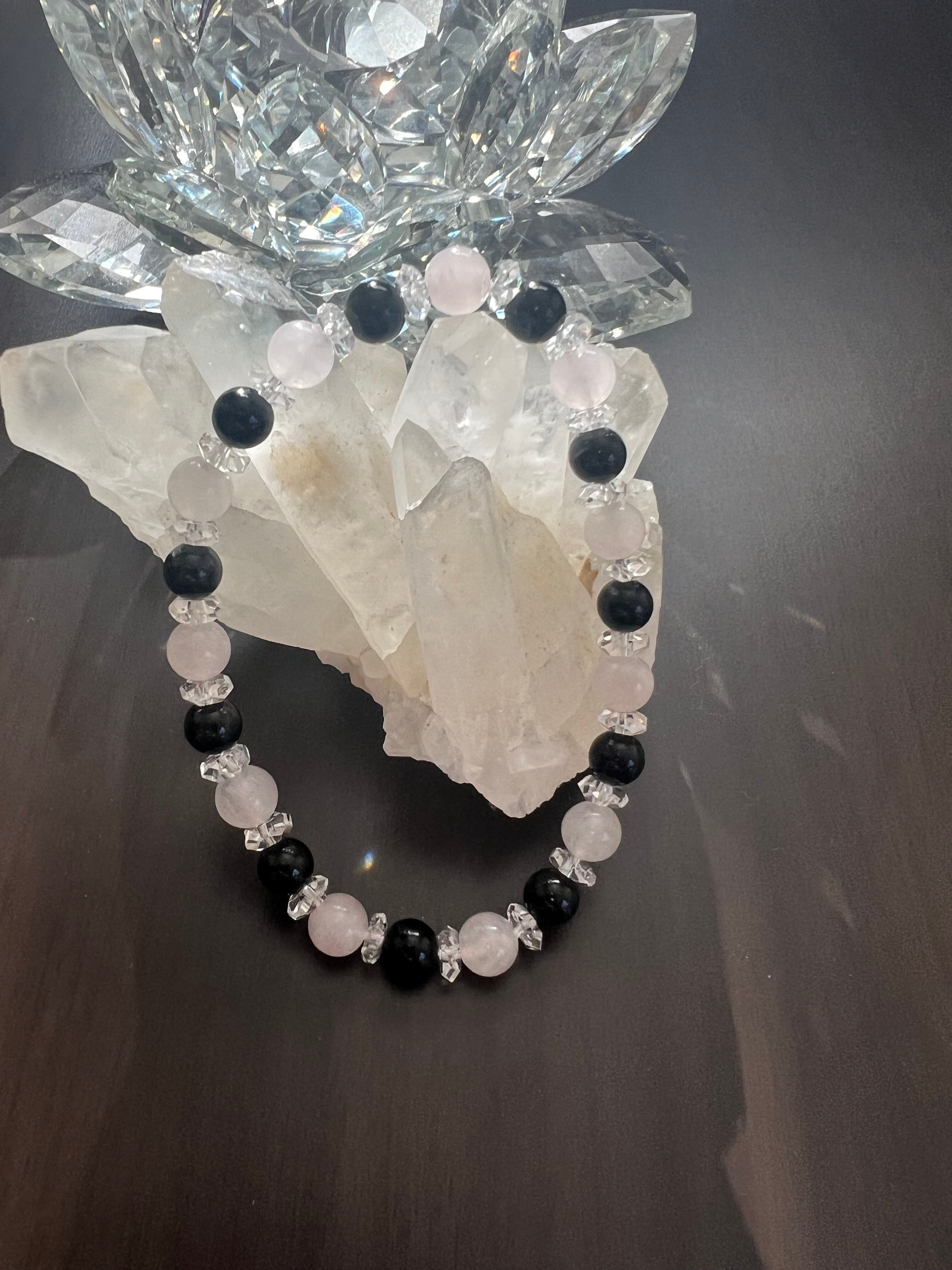 ブルータイガーアイは、勇気や自己表現力を高めると言われており、ローズクォーツは愛情や美を引き寄せる力があるとされています。そして20面カット水晶は、パワフルな浄化作用があり、持ち主のネガティブなエネルギーを浄化してくれます。三つの石を組み合わせたことで不思議なエネルギーが体中を駆け巡り、やわらかな安心感が広がっていくのを感じることでしょう。