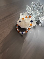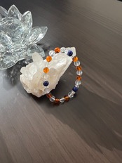 アンバーは太陽のエネルギーを秘めていると言われ、幸福感とパワーをもたらす力があります。ソーダライトは知恵とコミュニケーションの能力を高め、水晶は浄化効果があると言われています。このブレスレットは、自信と魅力を引き出し、新たな可能性を開拓するお手伝いと宇宙のエネルギーに包まれ、内なる輝きを感じることでしょう。