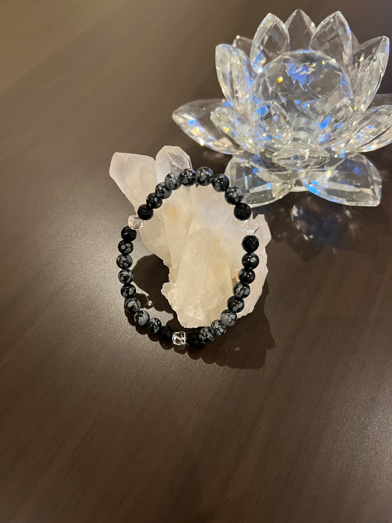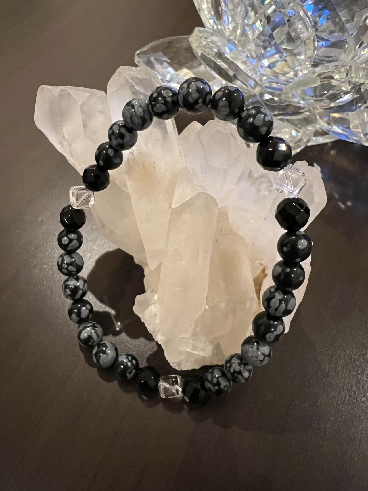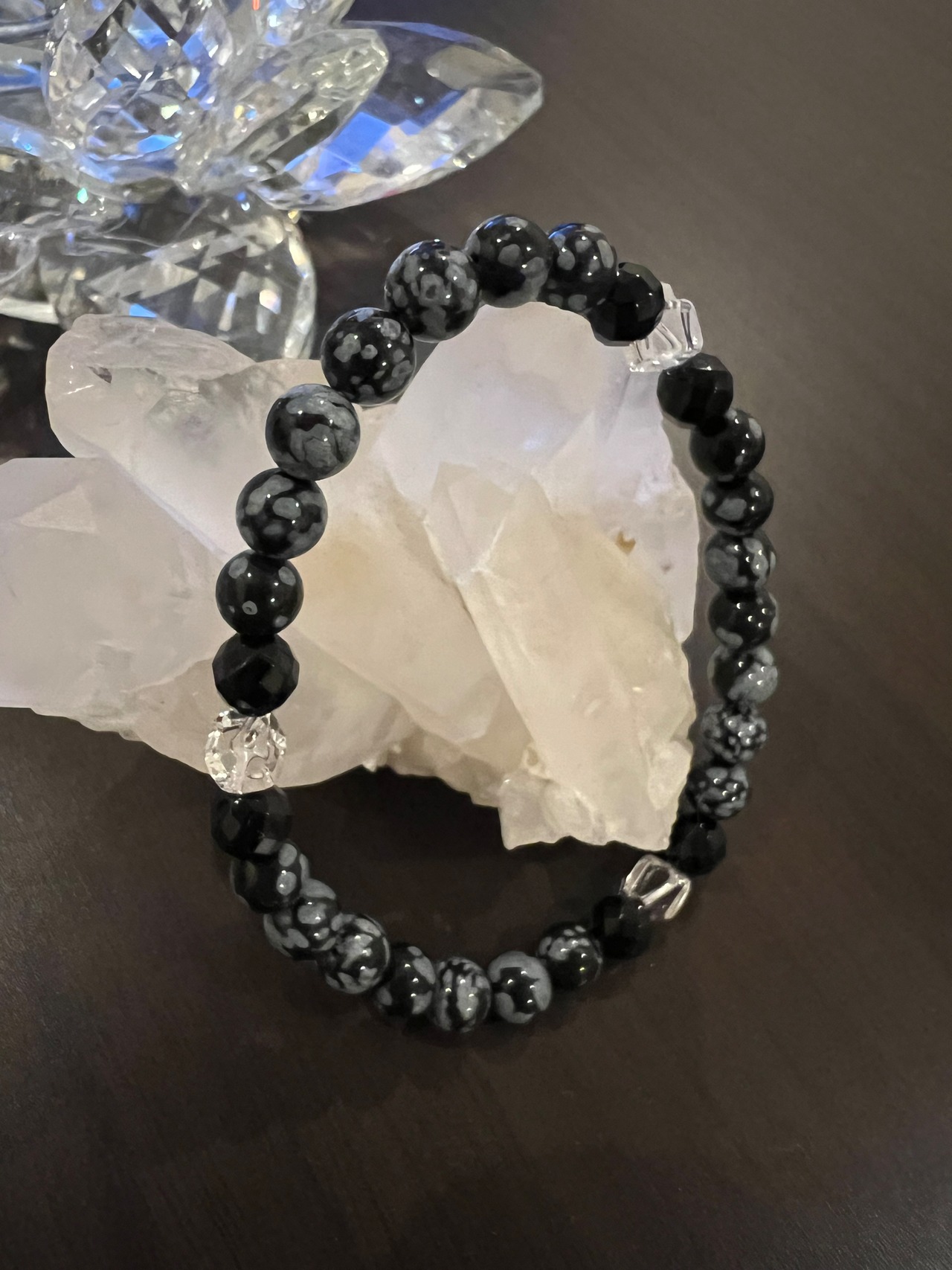 このブレスレットは、スノーフレークのパワーであなたの心を安定させ、カットオニキスの