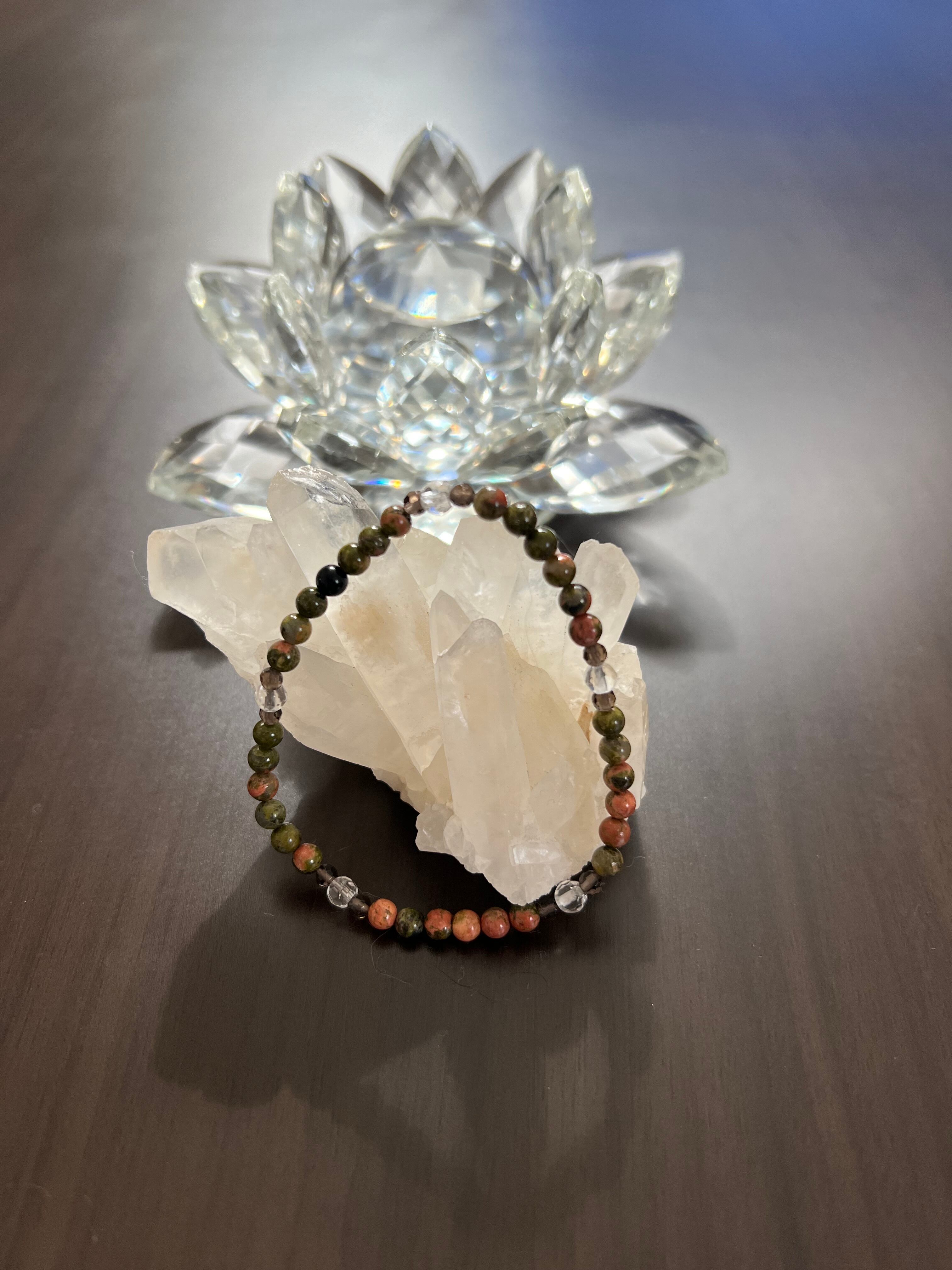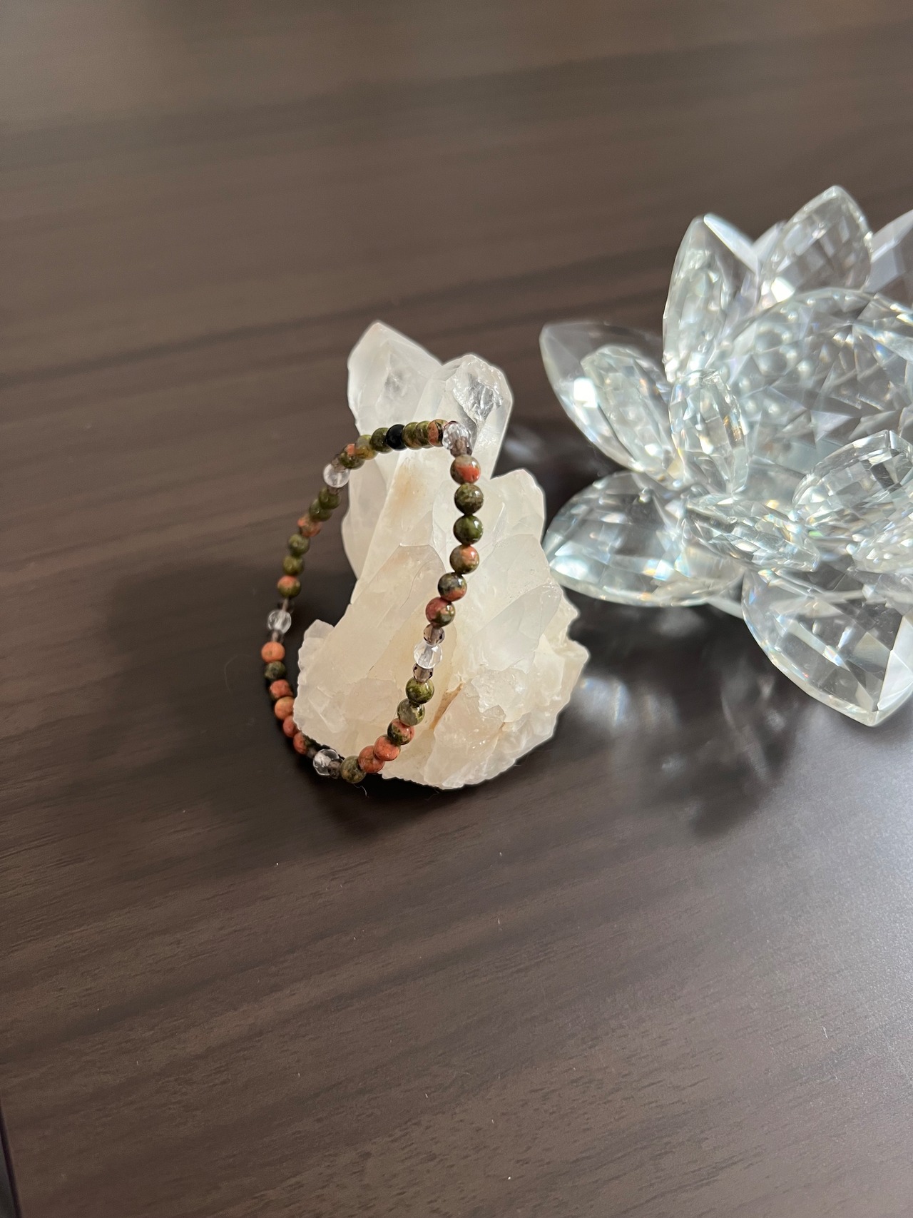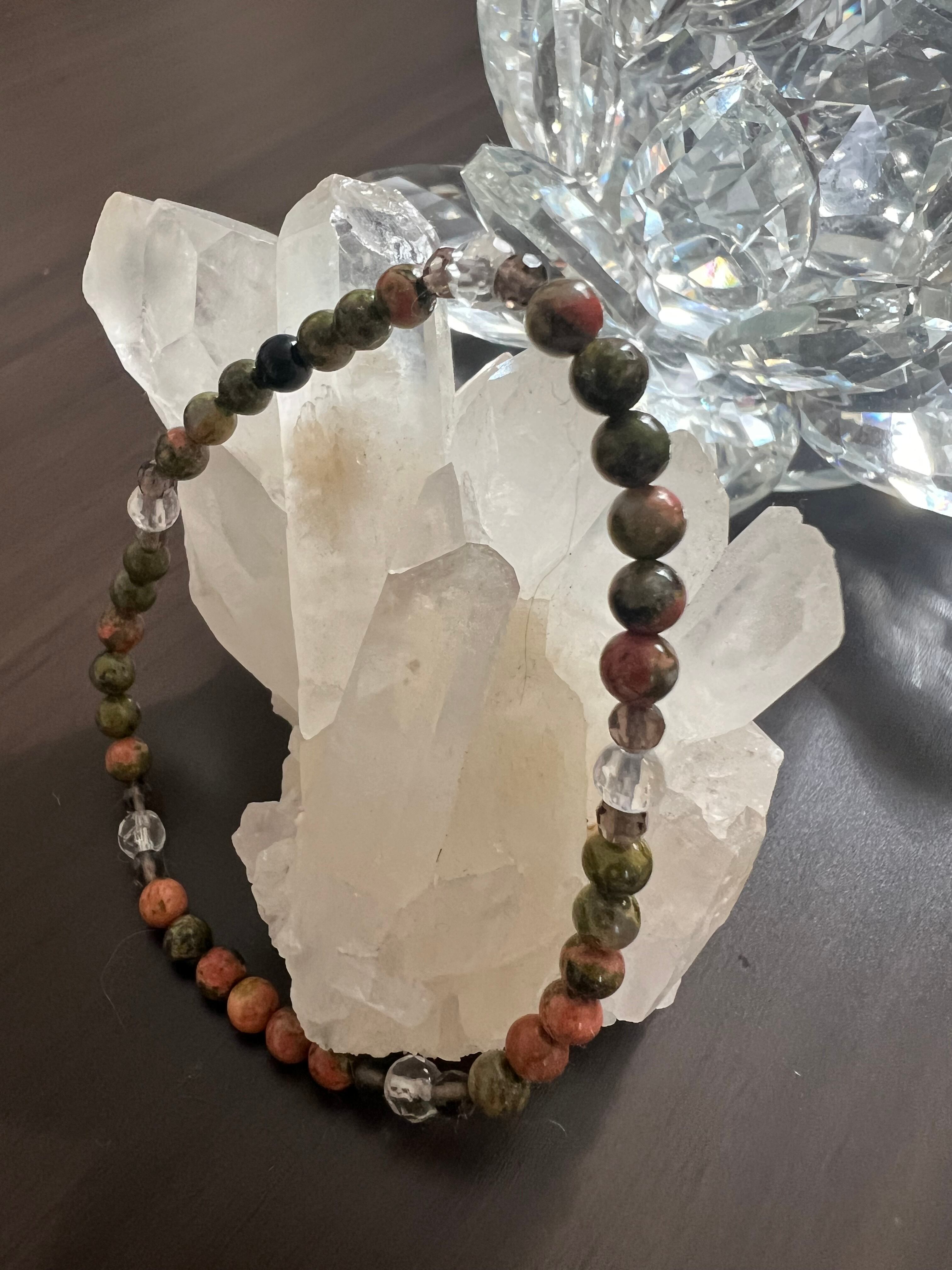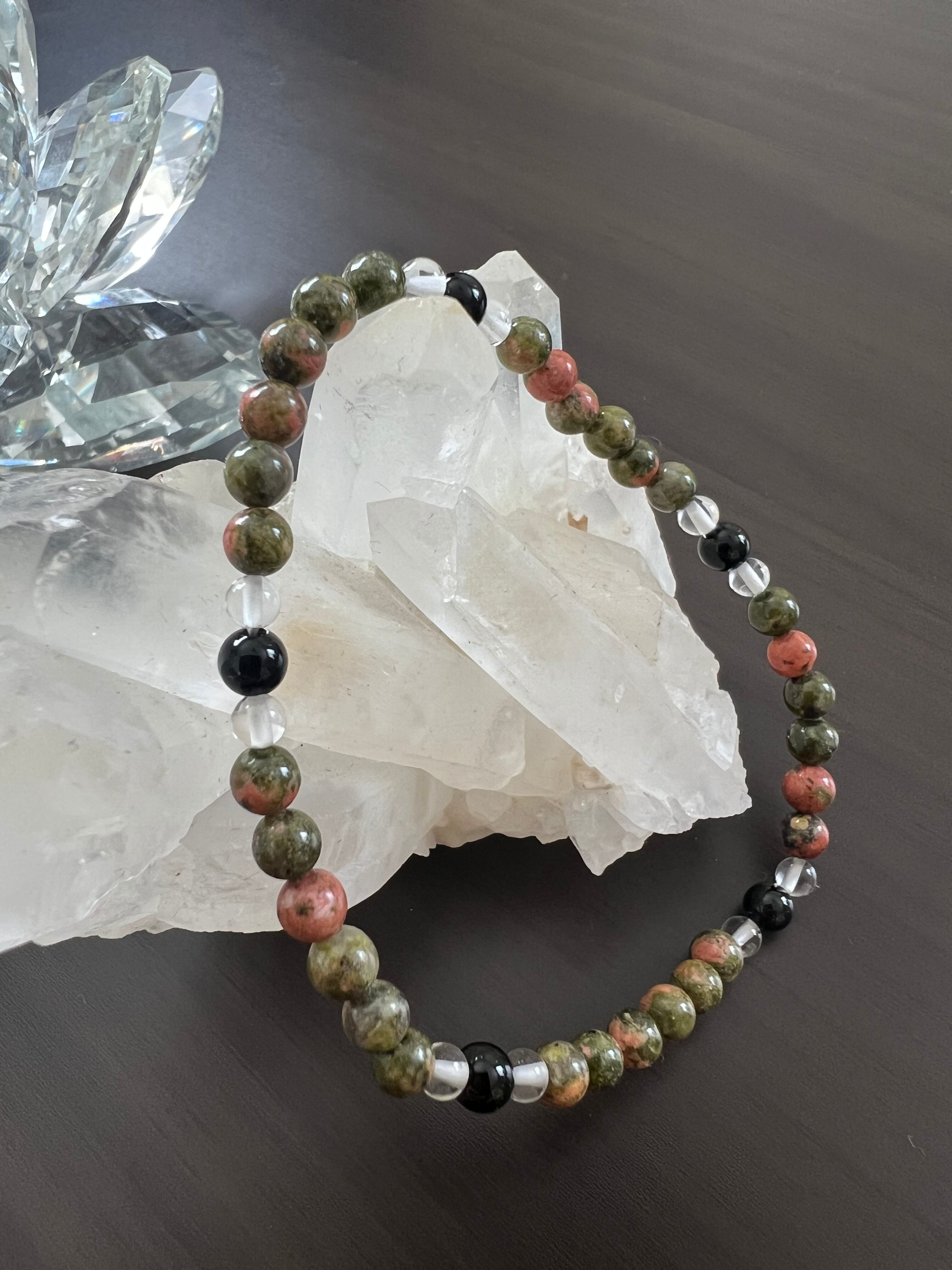 ユナカイトの豊かな緑と濃厚な茶色が、水晶やオニキスと組み合わさり、繊細なバランスを生み出しています。