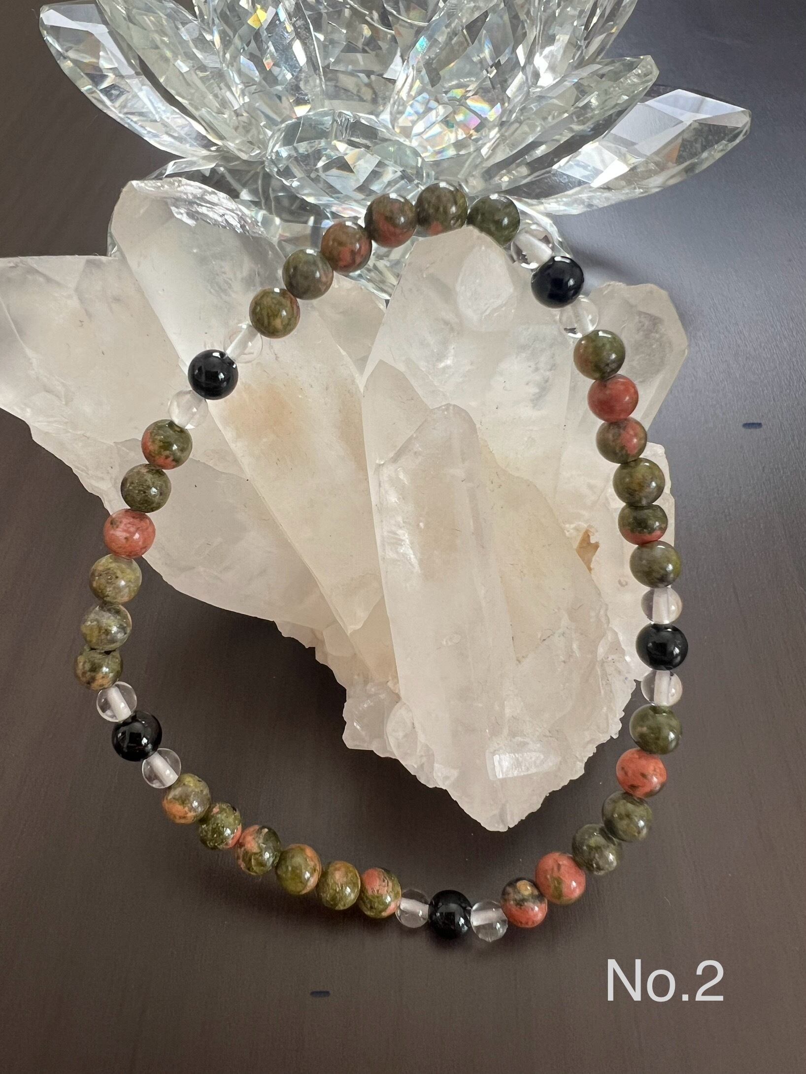 ユナカイトは心を癒し、カット水晶は気持ちをクリアにし、オニキスはマイナスエネルギーを跳ね返してくれると言われています。