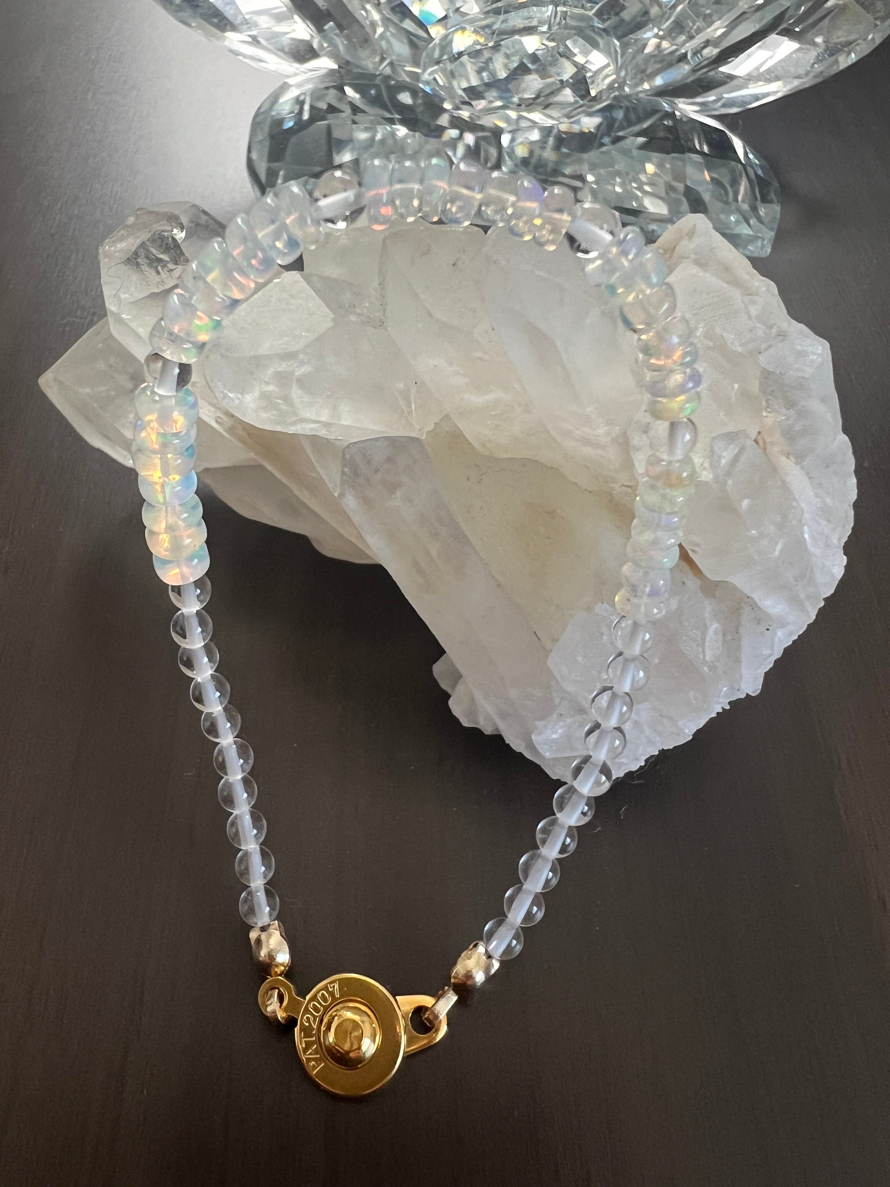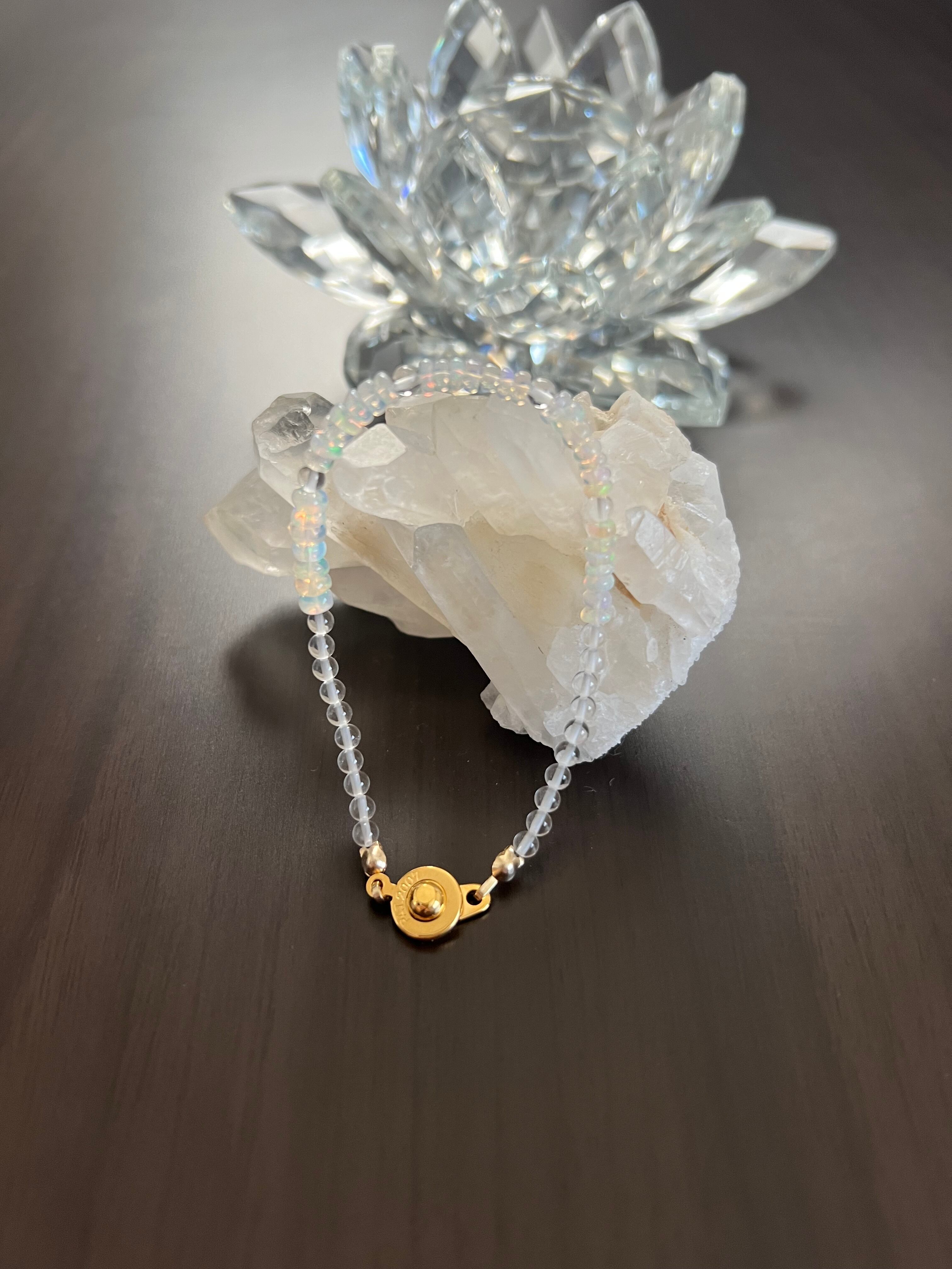 光の当たり方によって、幻想的な輝きを放つこのブレスレットは、神秘的な美しさを持っています。オパールは幸福を呼び込む石として知られ、水晶は浄化と活気を与えるとされています。心と体を整えるパワーを持つ、オパール&水晶の輝きを感じてみてください。