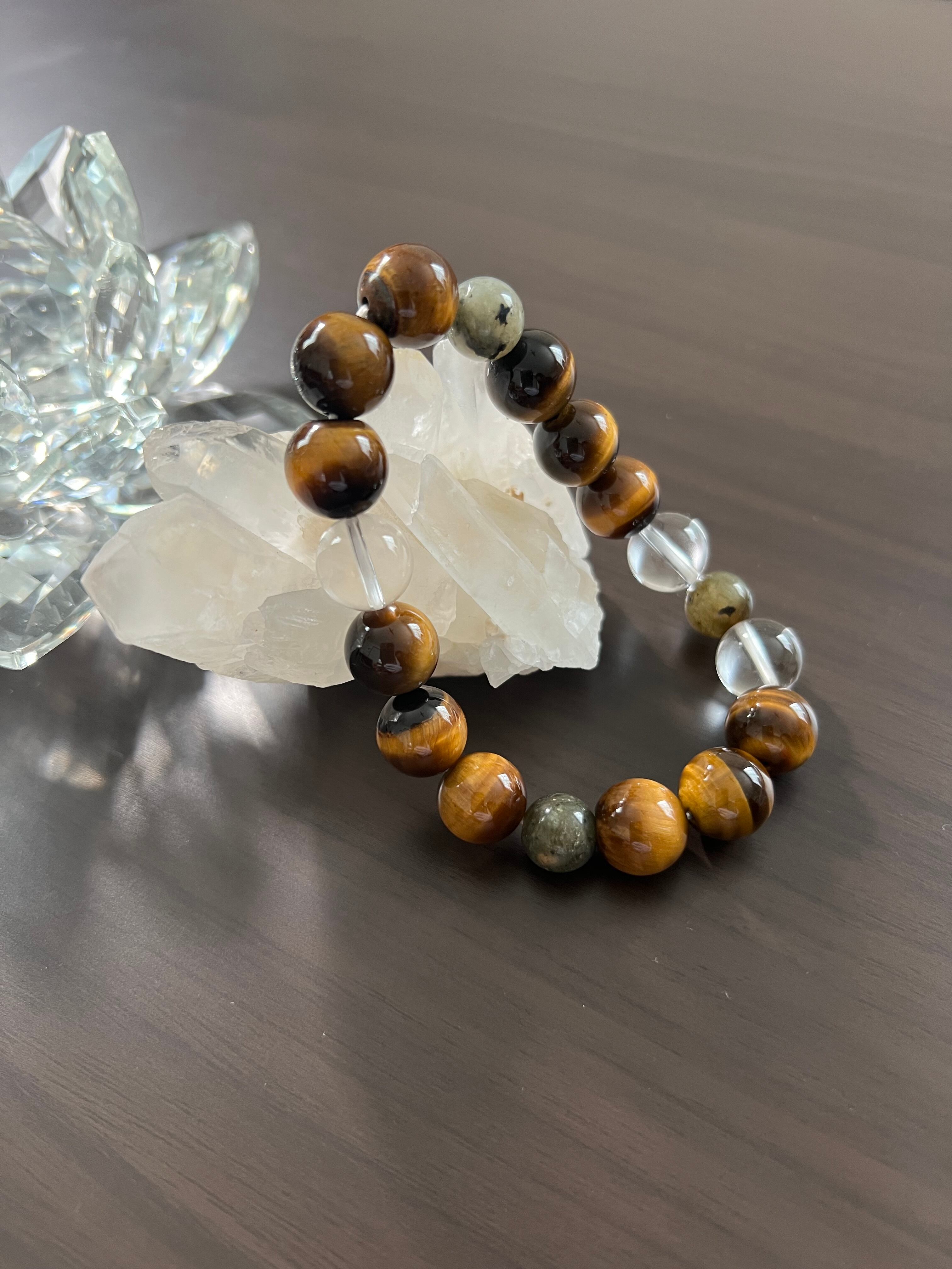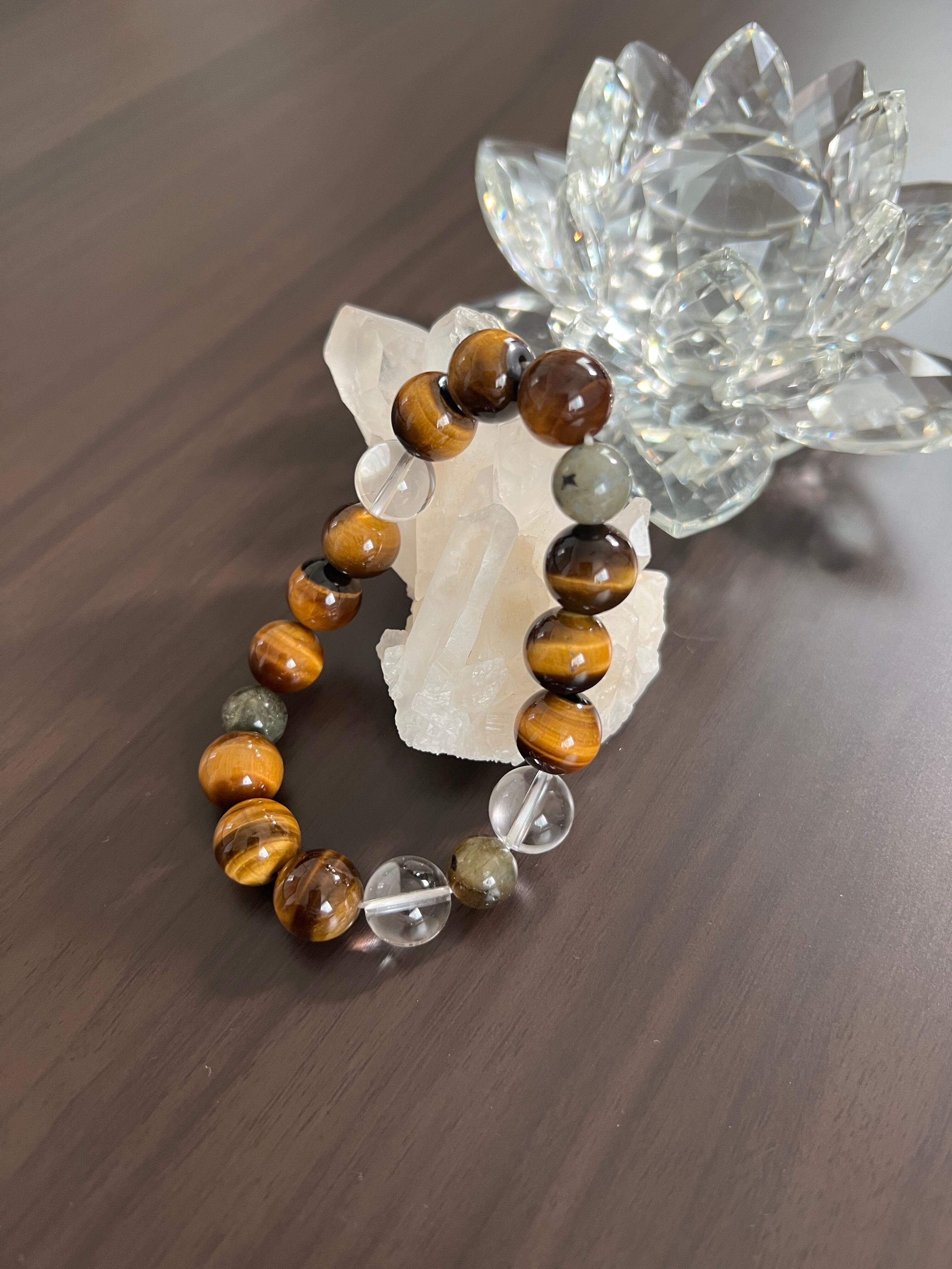 タイガーアイ、ラブラドライト、水晶の3つのパワーストーンが組み合わさったこのブレスレットは、身につけるだけでポジティブなパワーを感じさせてくれます。