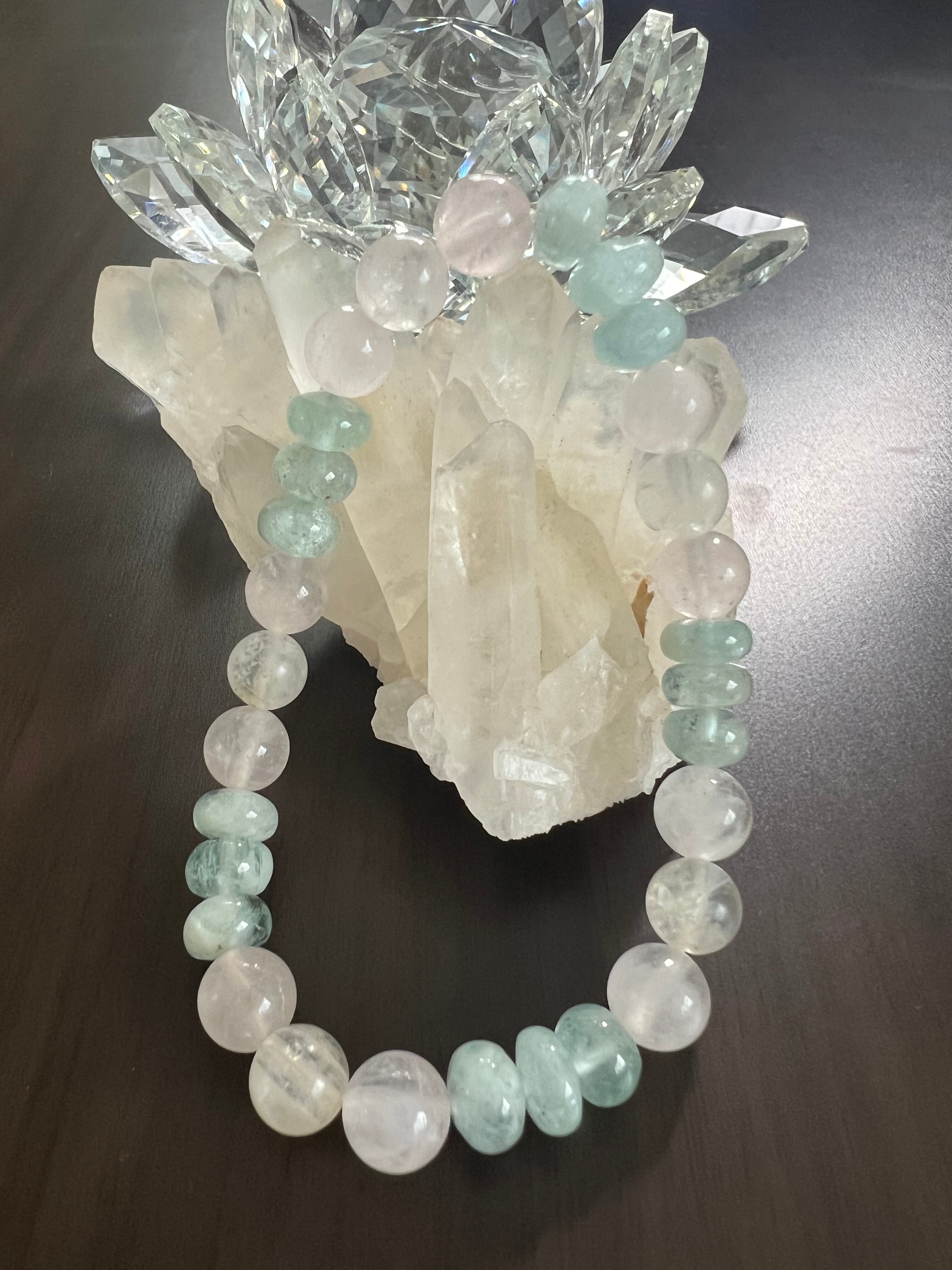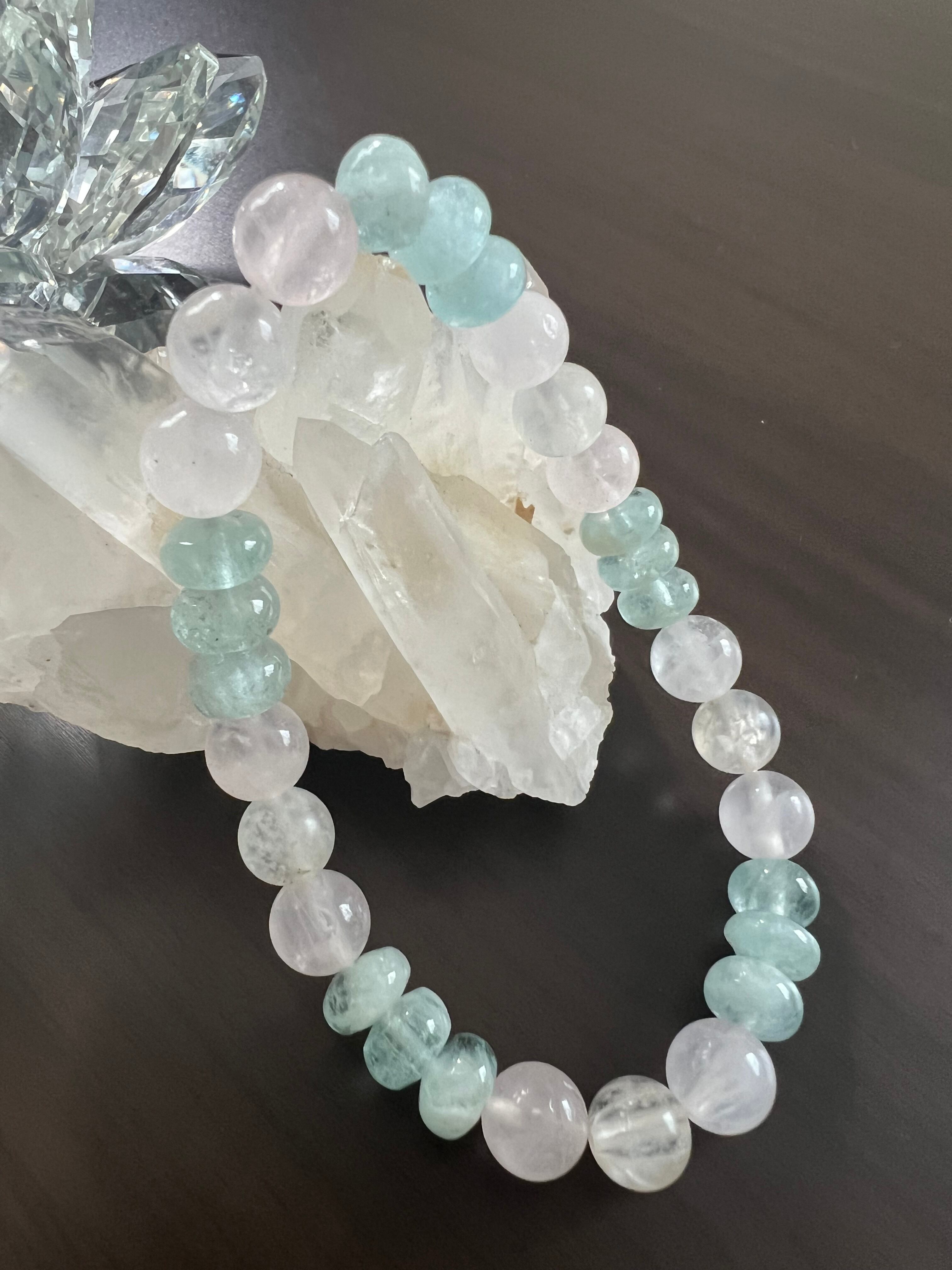 精巧なそろばんカットが施されたアクアマリンとムーンストーンのセット。神秘的な輝きを放つ天然石。それぞれの意味として、アクアマリンは平和な心と愛を象徴し、ムーンストーンは女性性や直感力を高めると言われています。このブレスレットは、身に着けるだけで心が穏やかになるようなパワーを感じさせます。