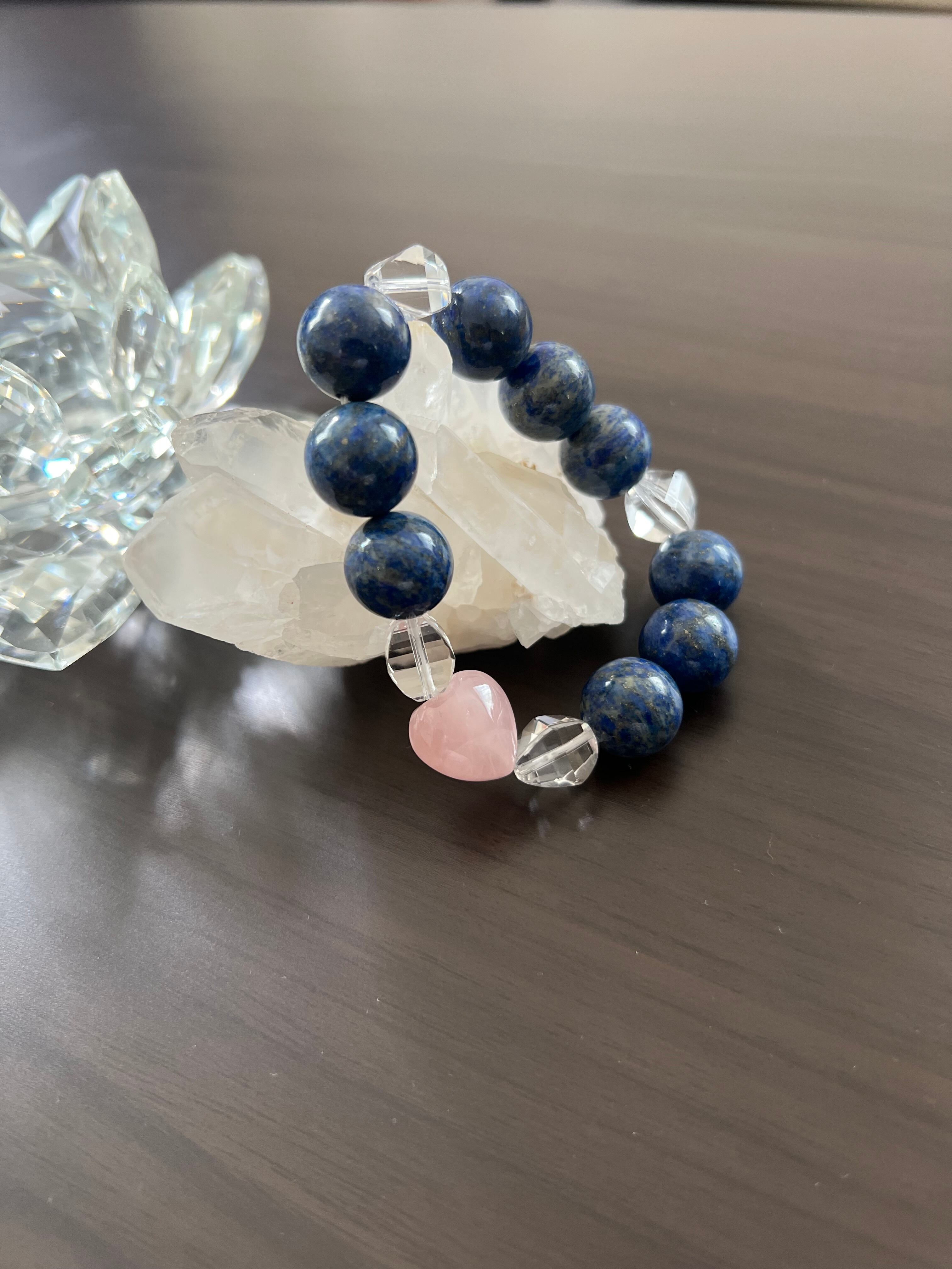 ラピスラズリは古代から知られるパワーストーンで、直感力や洞察力を高め、クリエイティブな能力を引き出すと言われています。カット水晶は邪気を払い、清浄なエネルギーをもたらし、ハートカットのローズクォーツは、愛と美しさを象徴し、心身をリラックスさせて周囲にポジティブなエネルギーを広めてくれます。