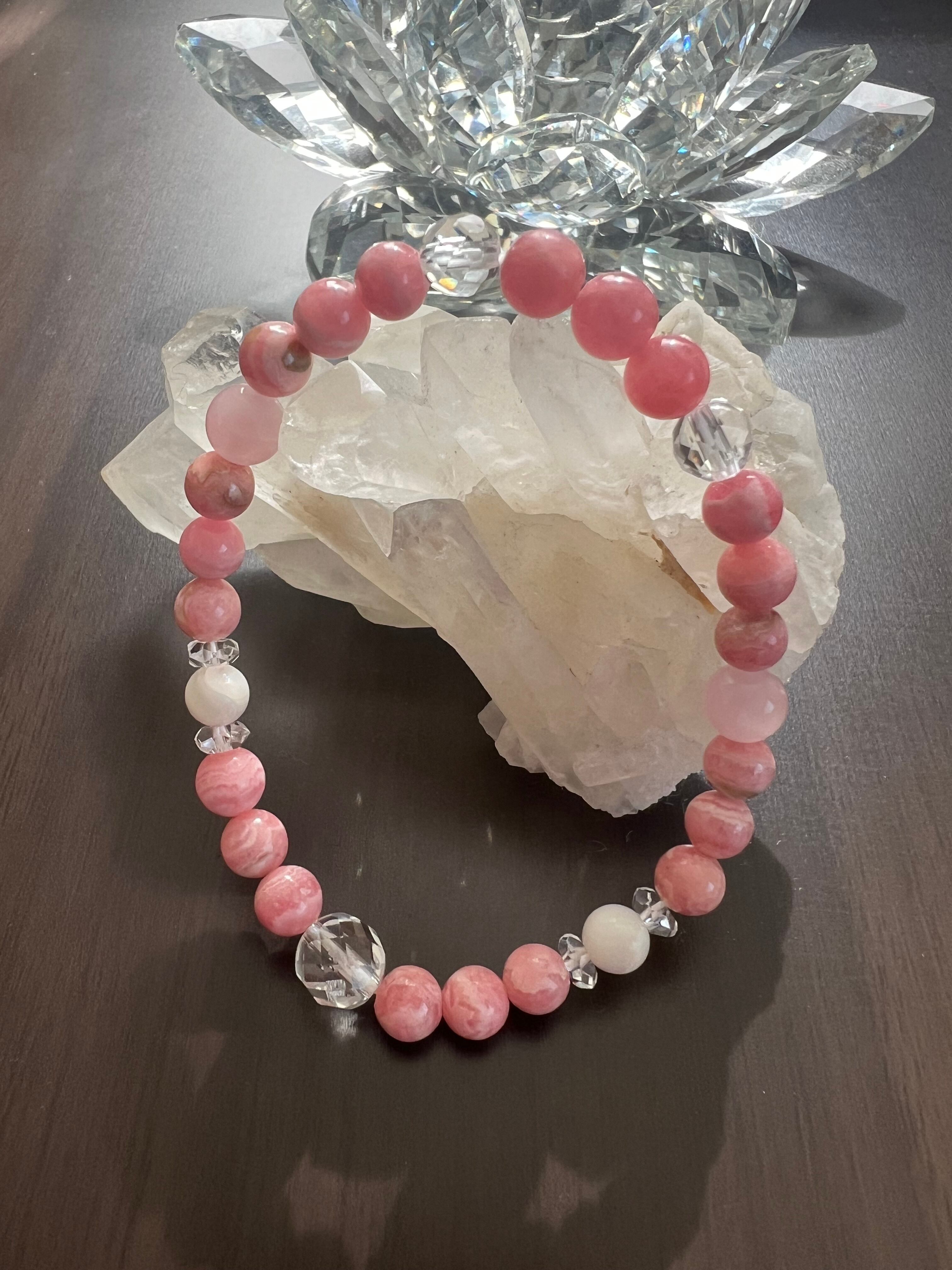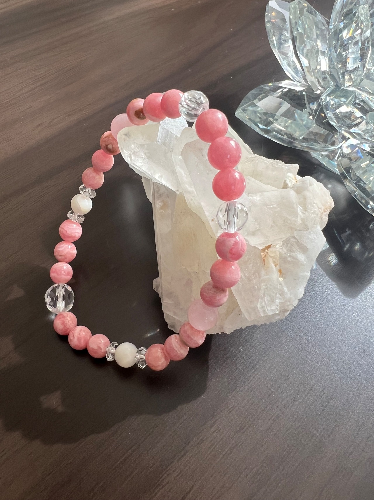 インカローズ、マザーオブパール、ローズクォーツ、カット水晶、20面カット水晶が組み合わさり、見るだけで心が和むデザインです。