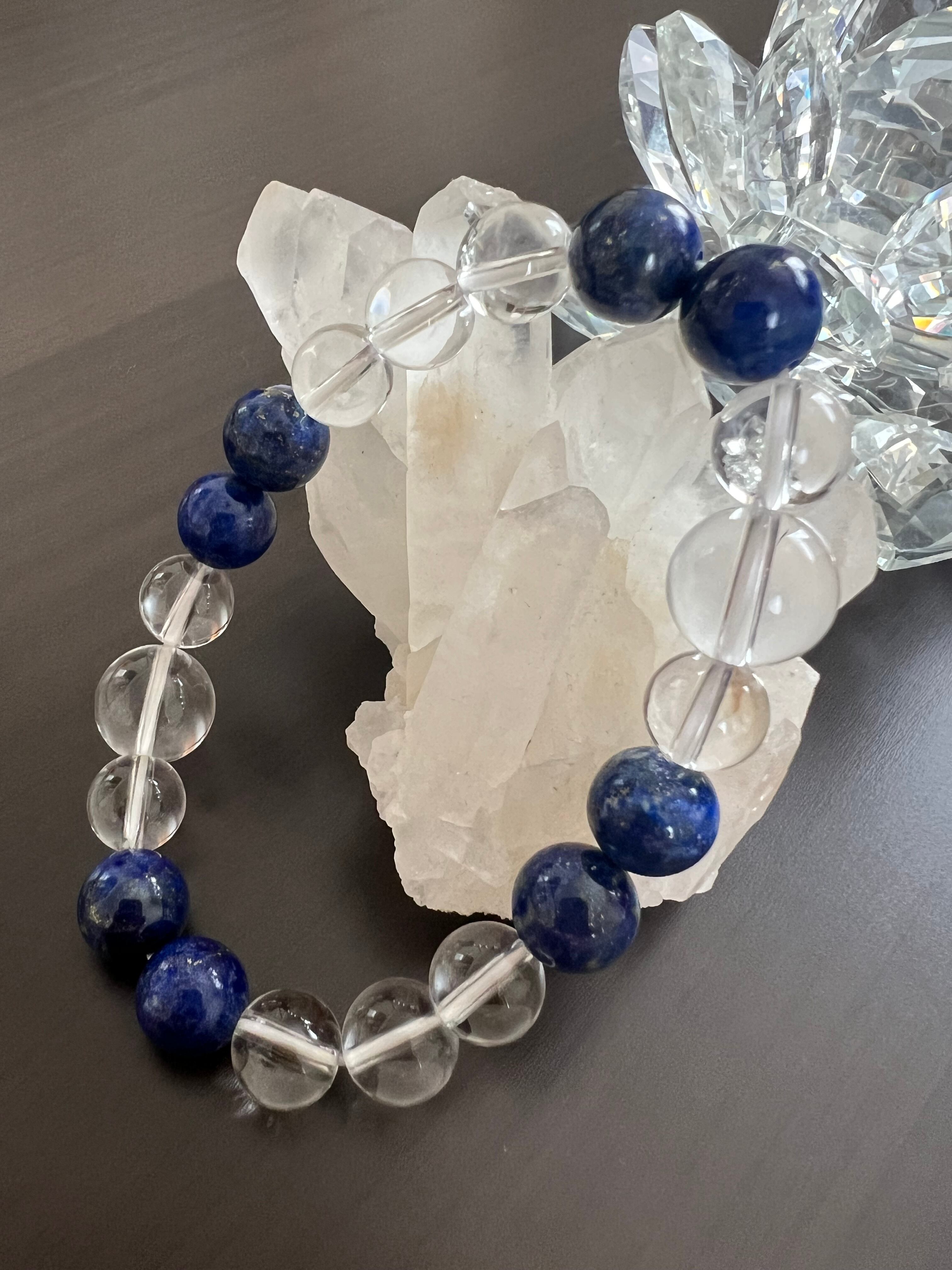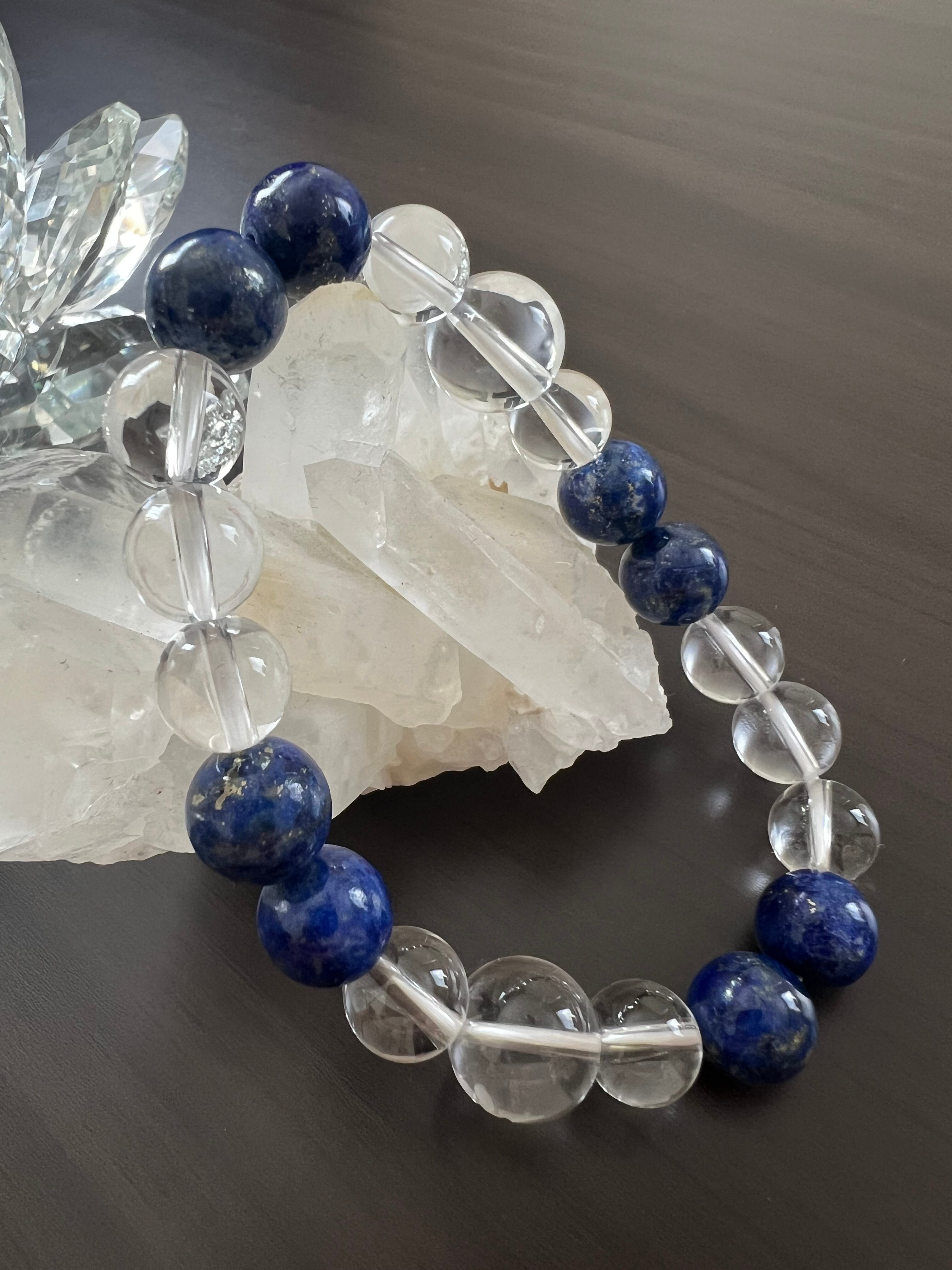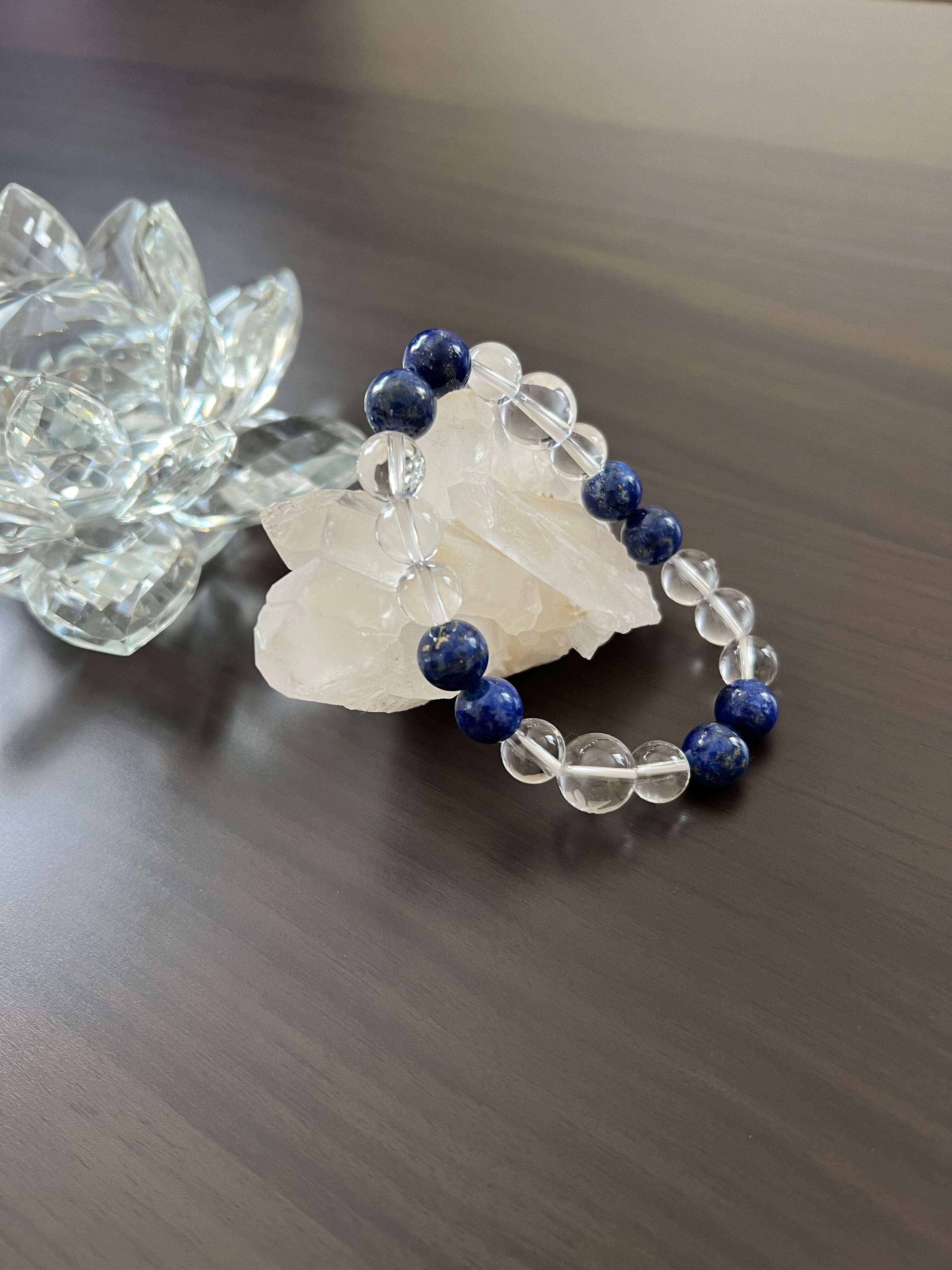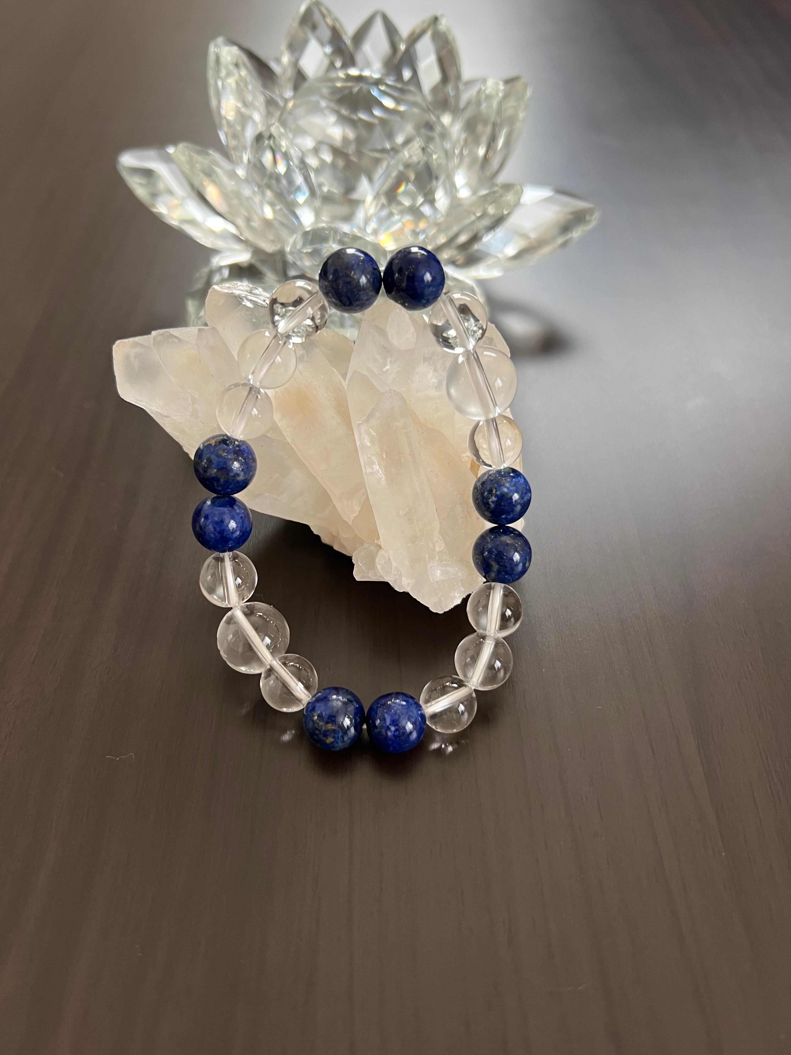 ラピスラズリは古代エジプトの王や王妃が愛用したといわれ、知恵や愛情、幸運を呼び込む力を持つと信じられています。水晶は浄化やエネルギー強化の効果があり、心身をクリアに整えてくれます。すべての人々に幸せや穏やかさをもたらすようにと願いを込めて、丹念に製作されました。