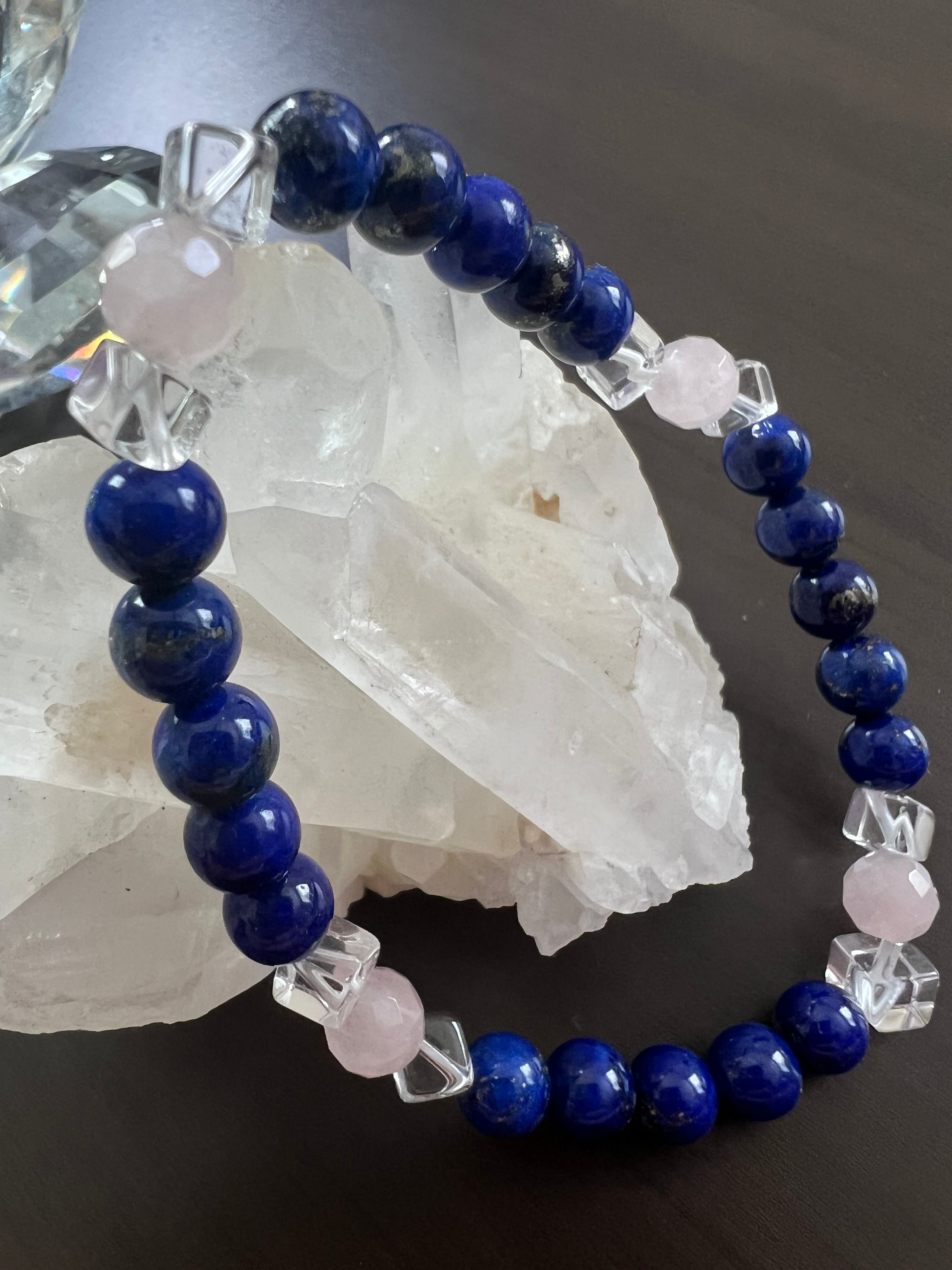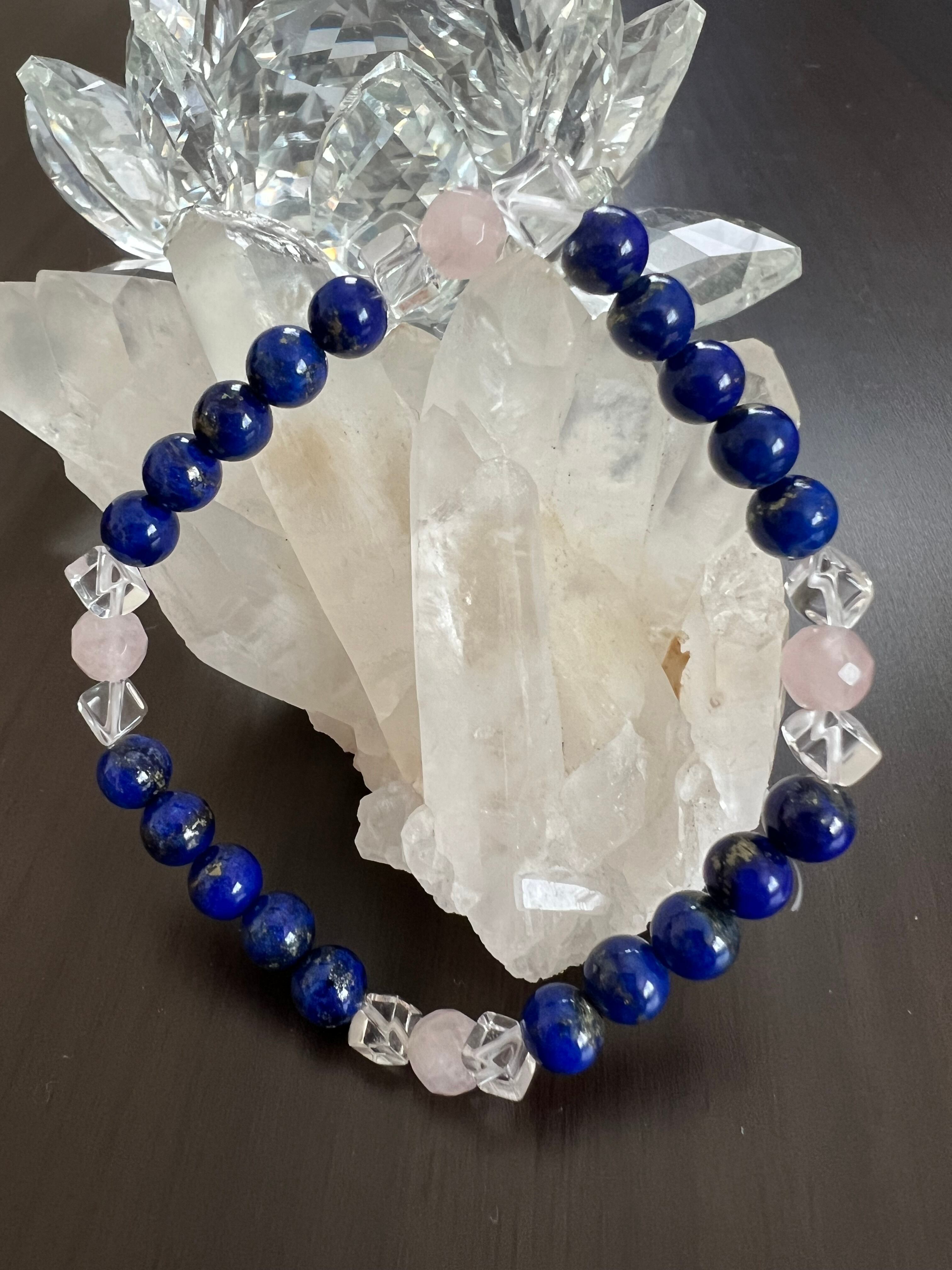 ラピスラズリの深いブルーとローズクォーツの優しいピンクが絶妙に組み合わさり、心身を癒してくれることでしょう。ラピスラズリは知恵や冷静さを与え、ローズクォーツは愛と癒しを象徴しています。身に着けることで、日々の生活に安らぎをもたらし、ポジティブな気持ちを育むことができます。