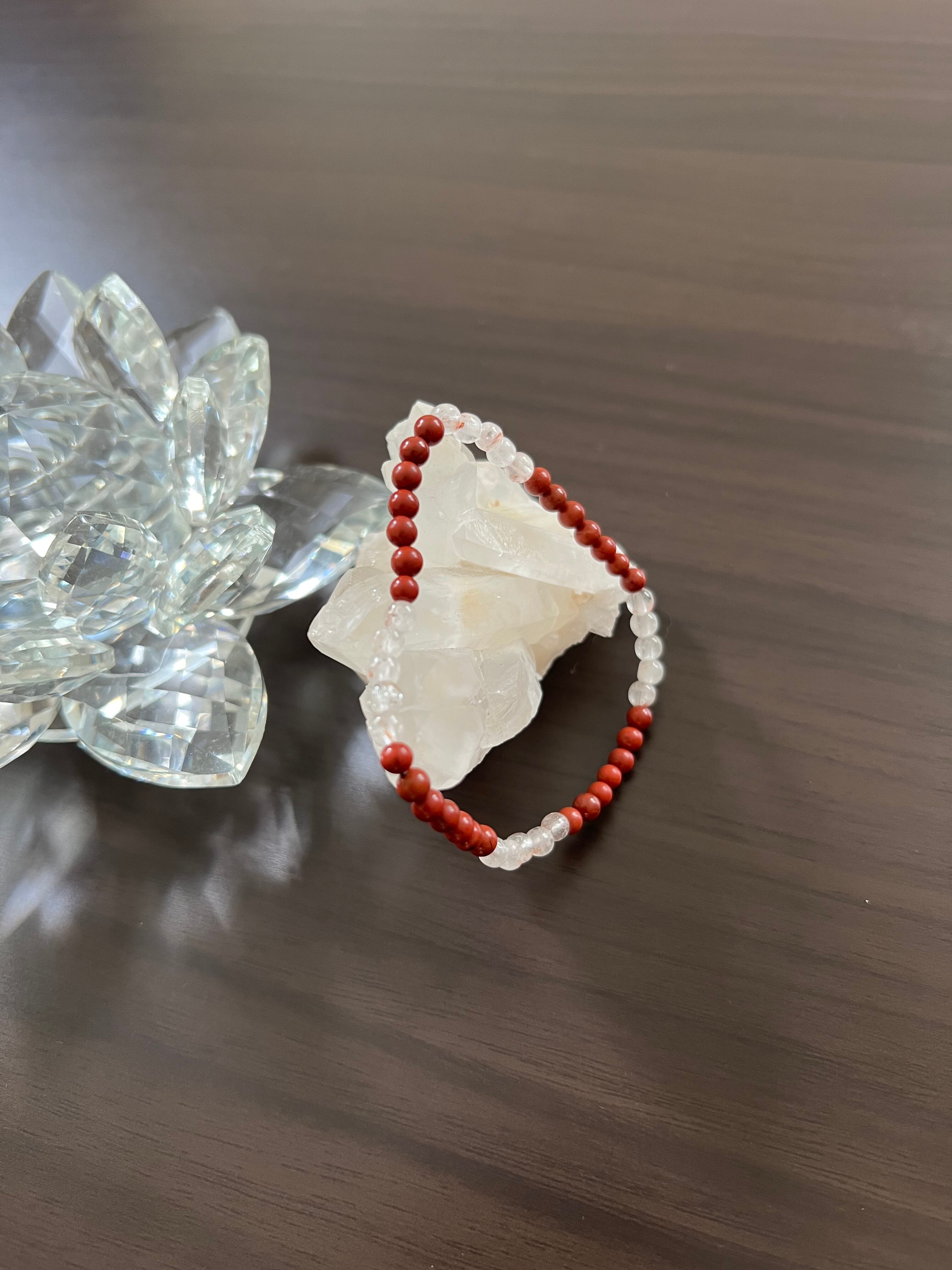 レッドジャスパーはポジティブなエネルギーを引き寄せ、アイスクリスタルビーズは冷静な気持ちをもたらすと伝えられています。このブレスレットを身につけてるとエネルギーを増幅させ、ポジティブなパワーを与えてくれます。